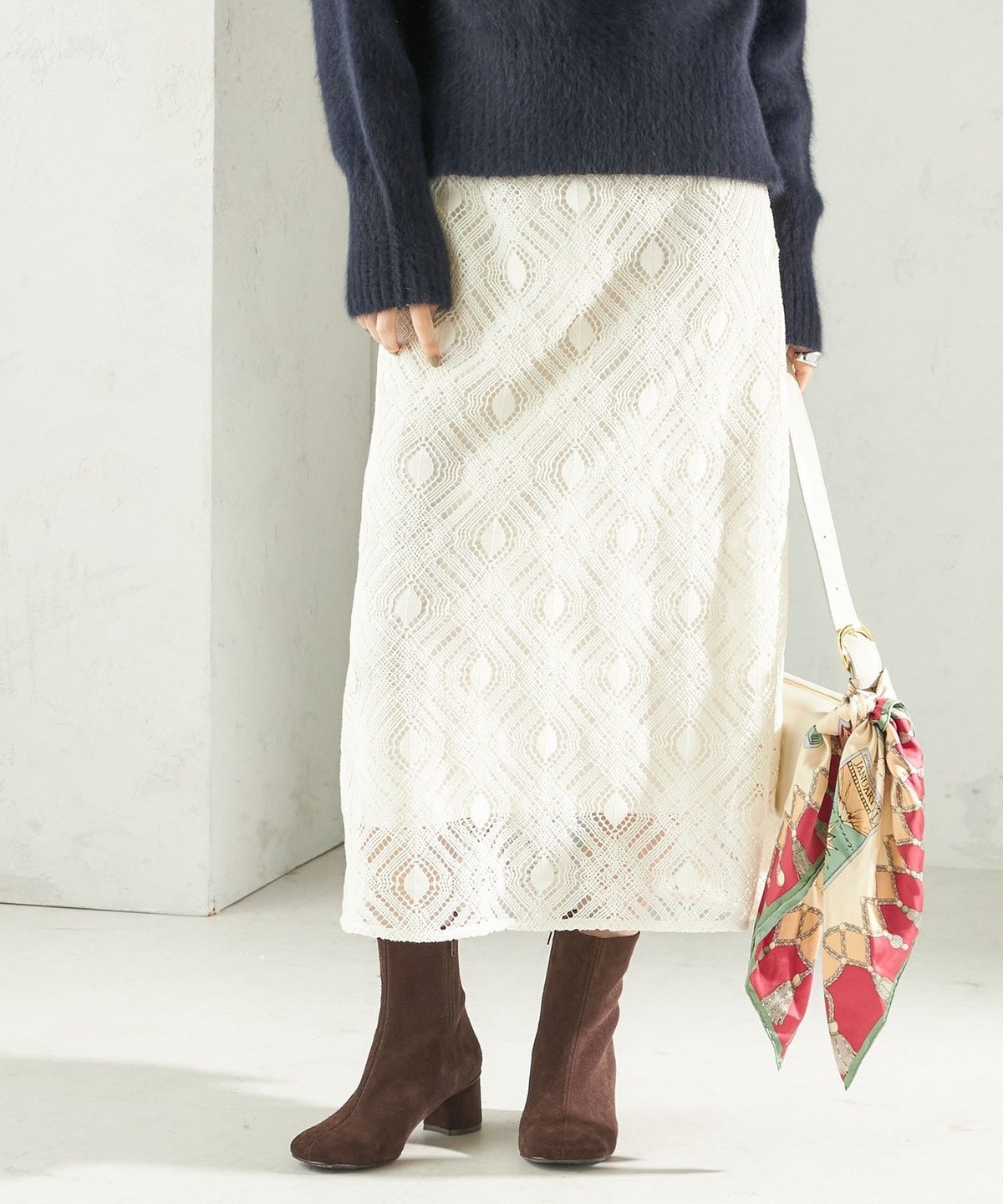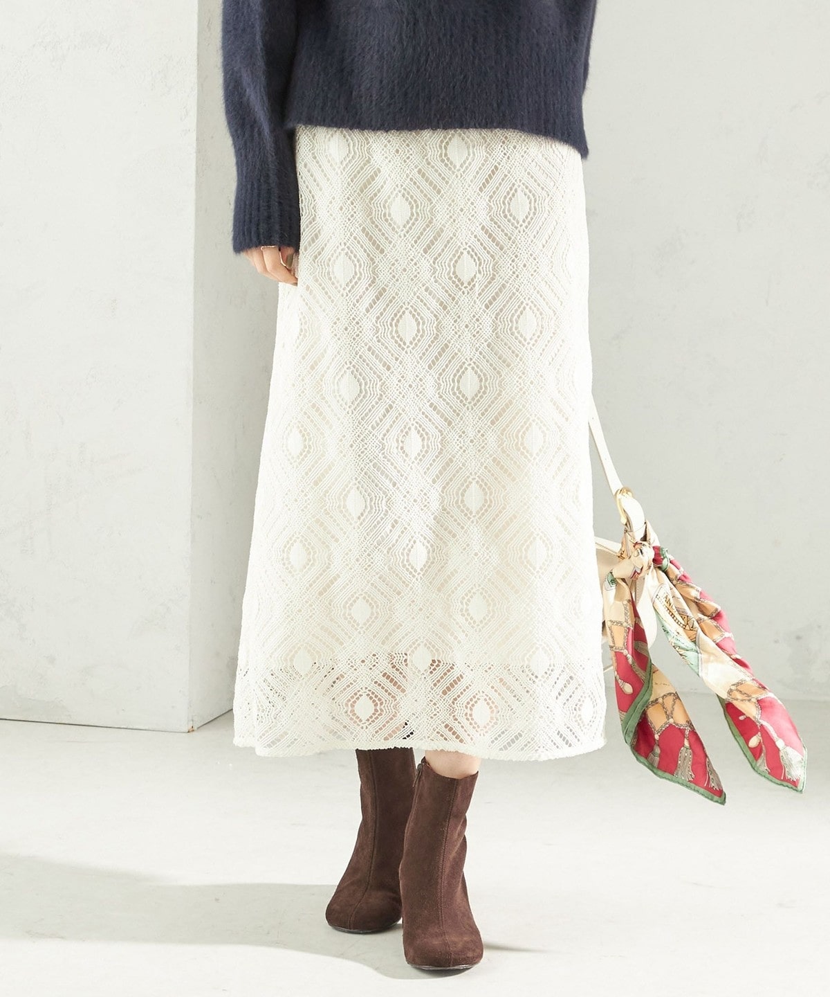 表面感のある幾何柄が印象的なレーススカート