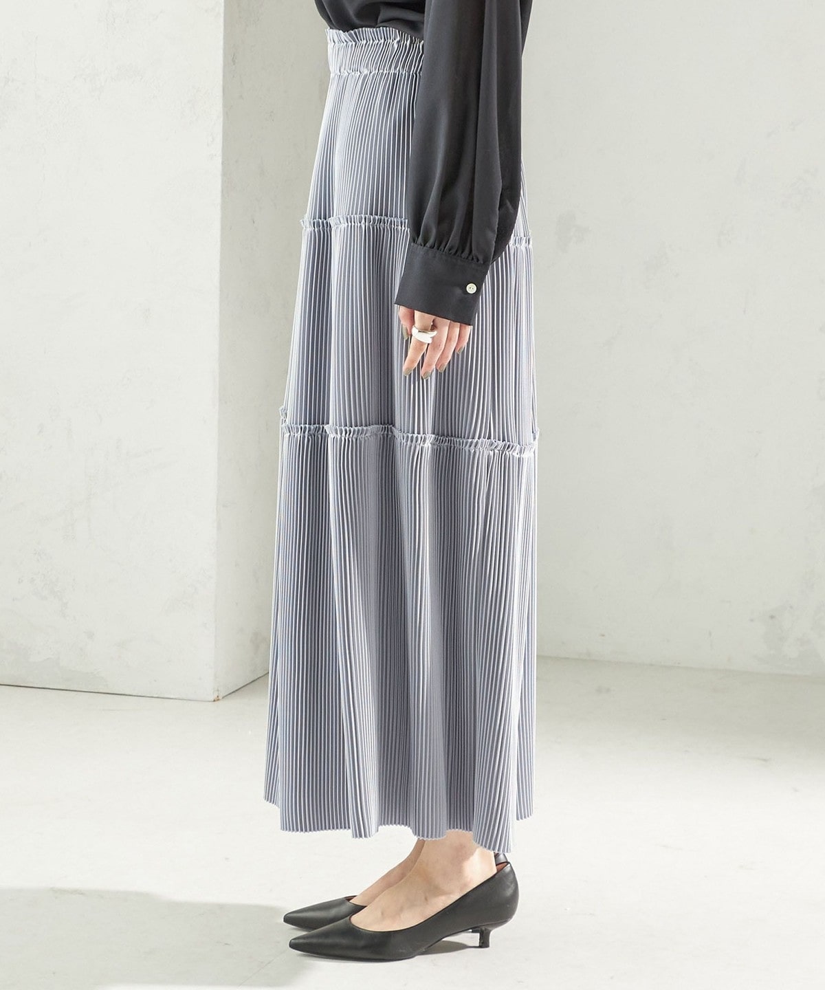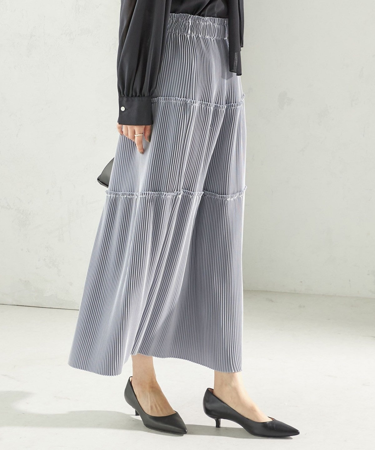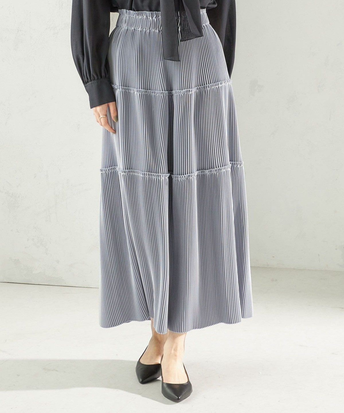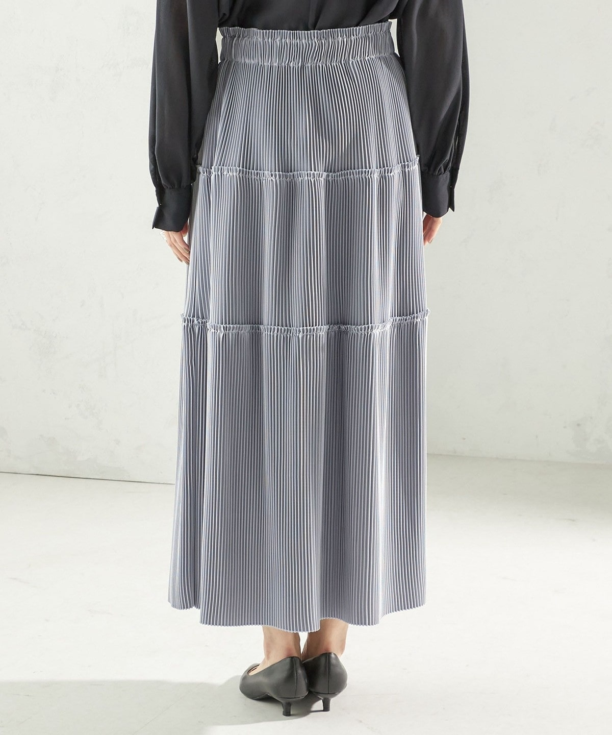 繊細なプリーツをティアードデザインで仕上げた、表情豊かなフレアスカート。