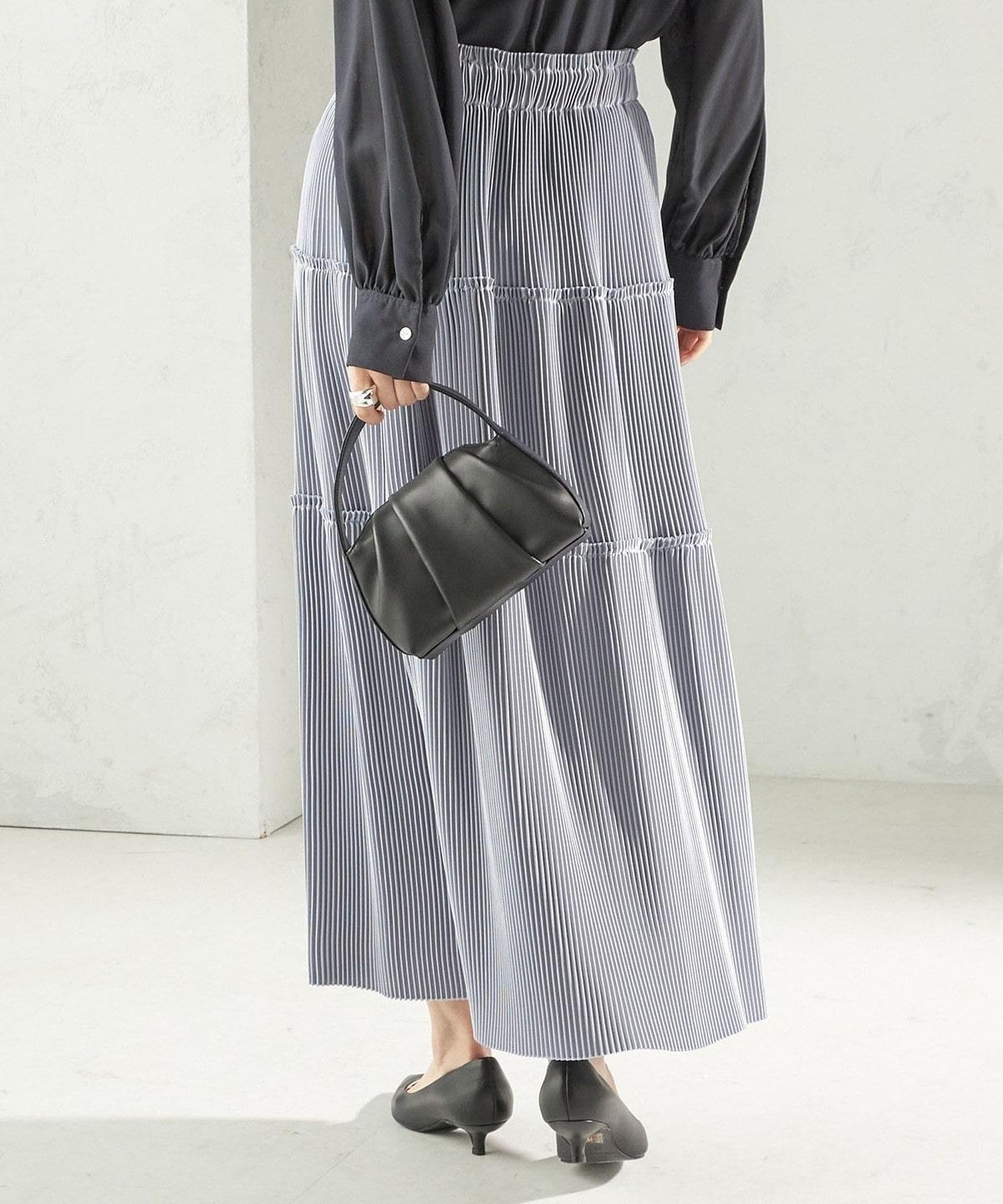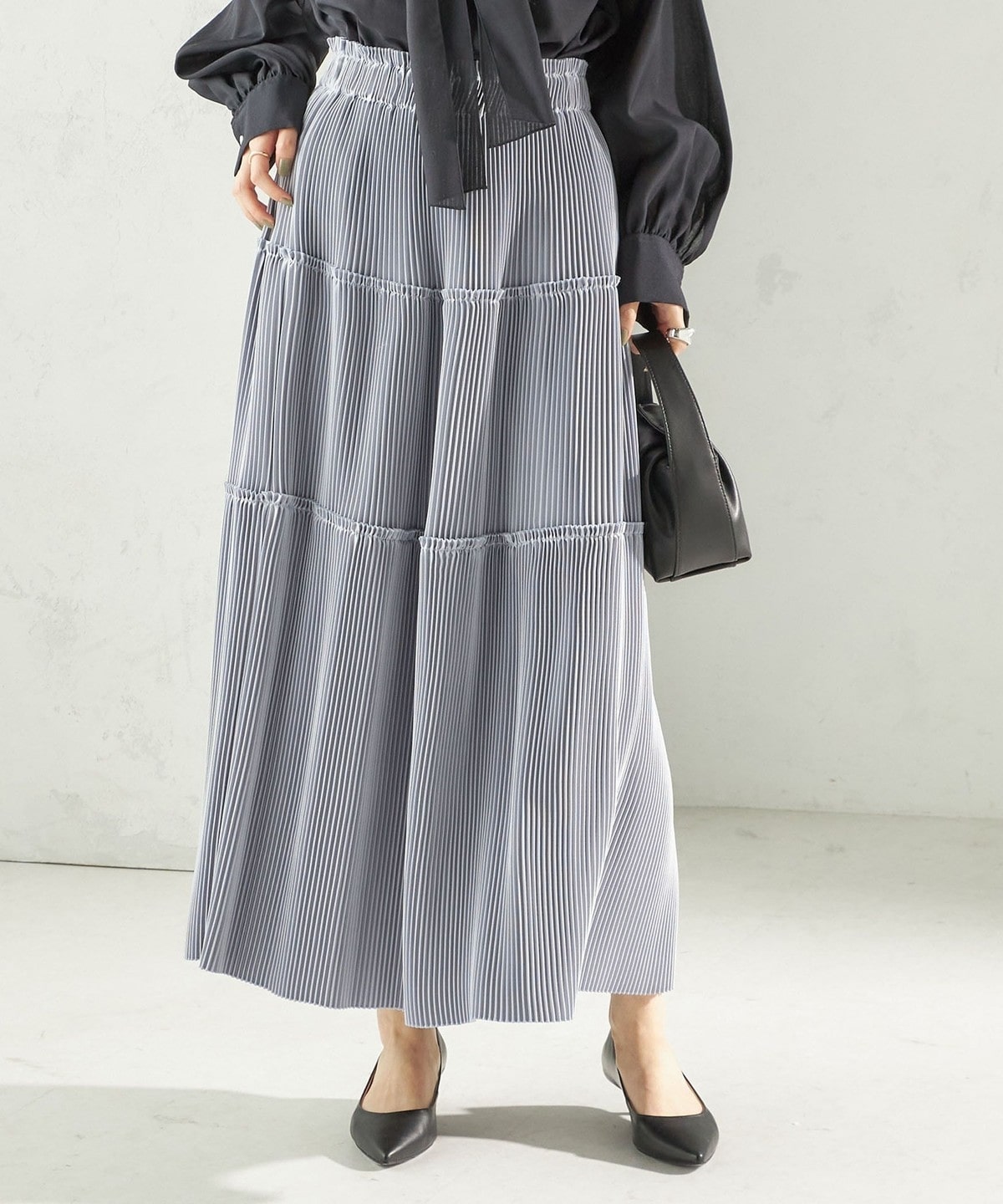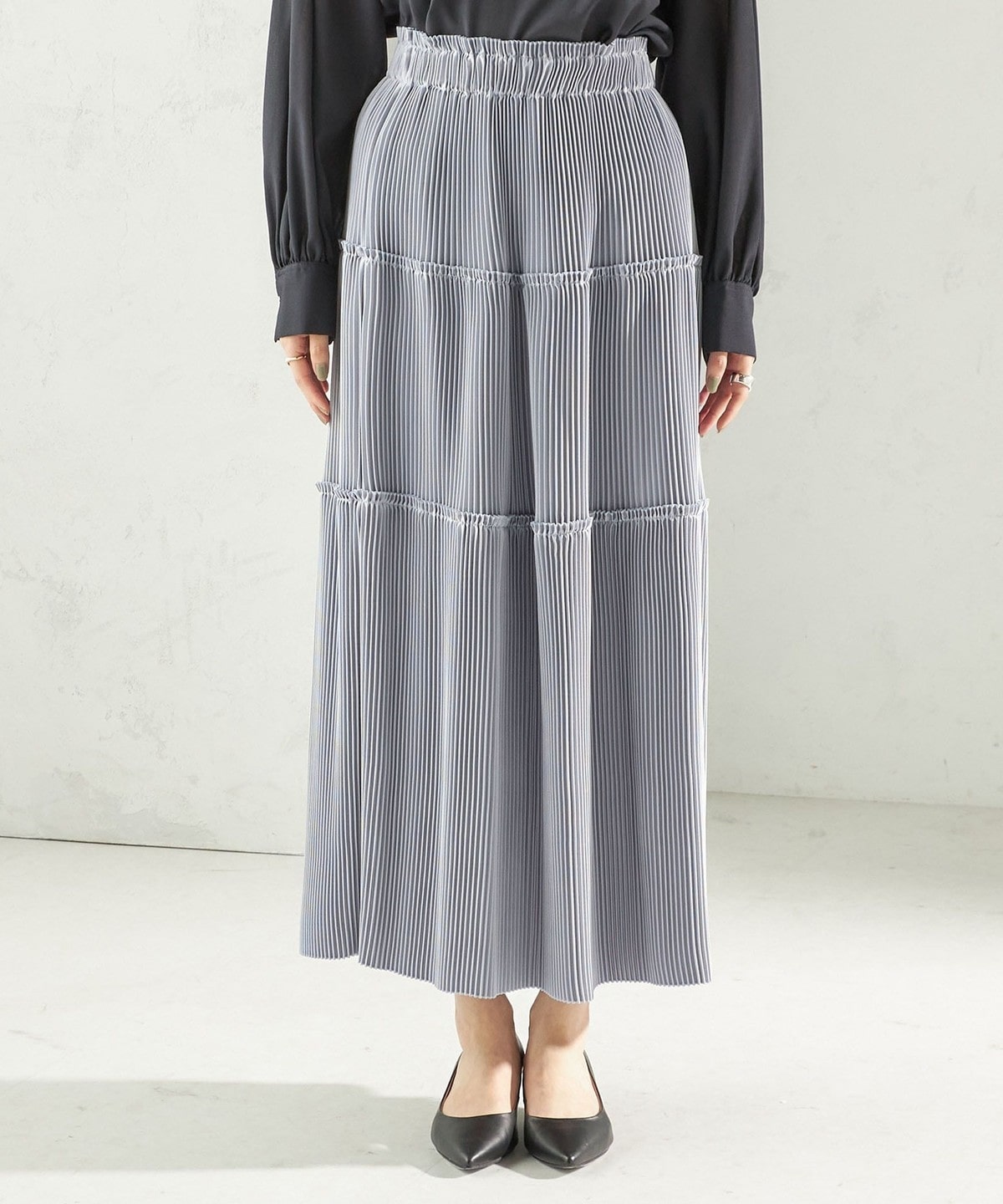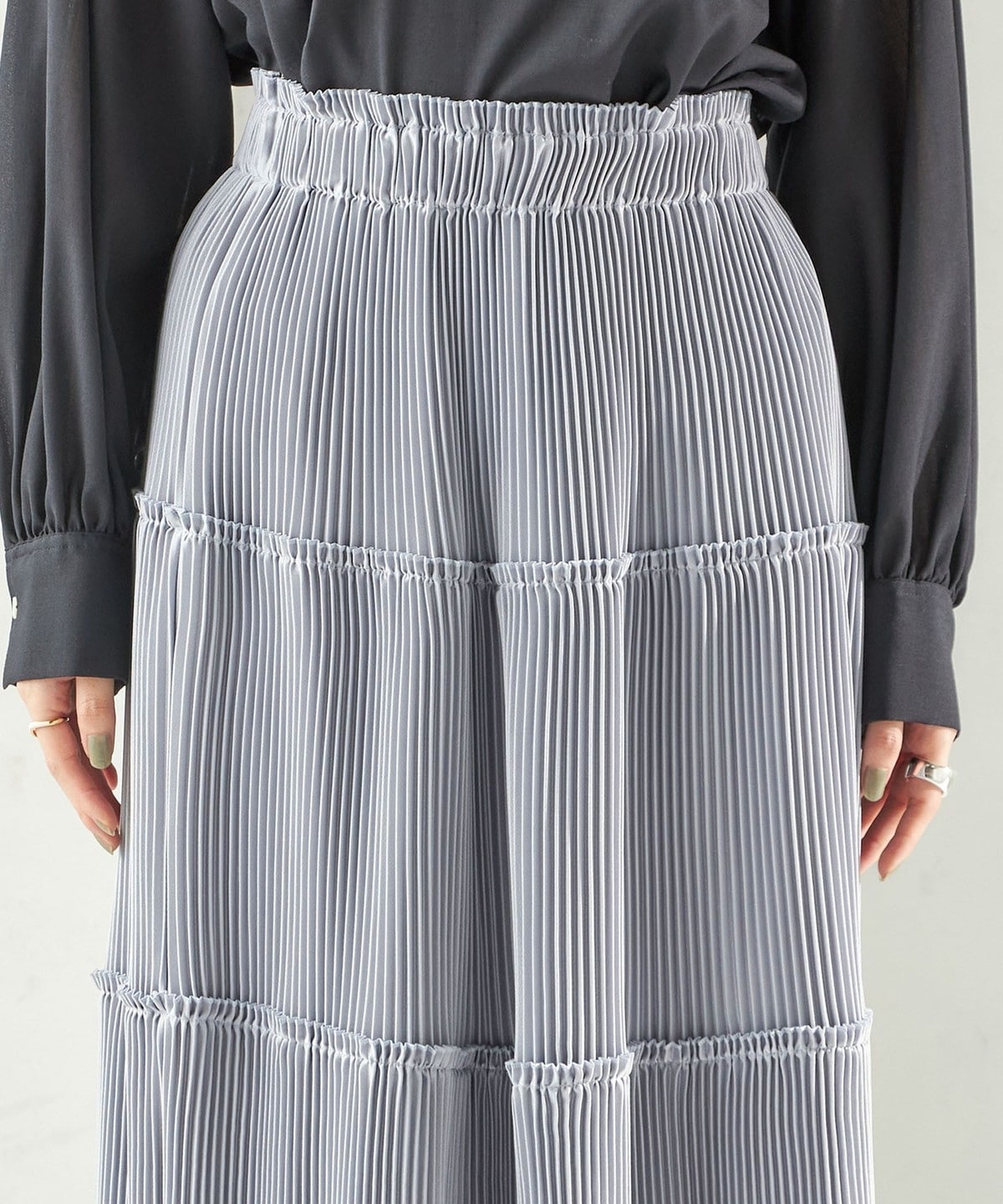 繊細なプリーツをティアードデザインで仕上げた、表情豊かなフレアスカート。