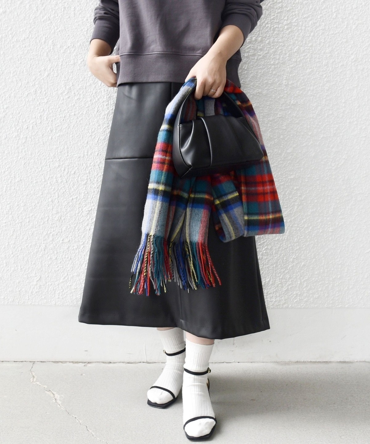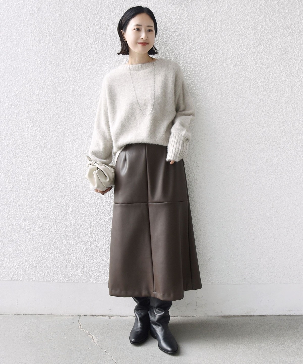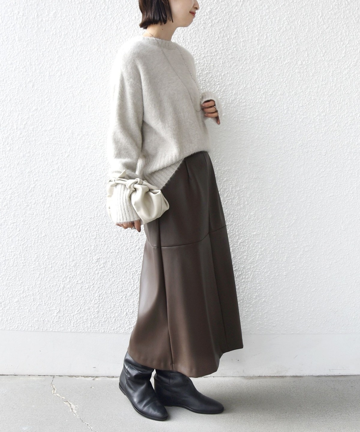 ウールコートやニットなどトップスがふわっとした素材が増える時期にボトムにこのような光沢感ある素材を合わせるとコーディネートにメリハリがでます。
