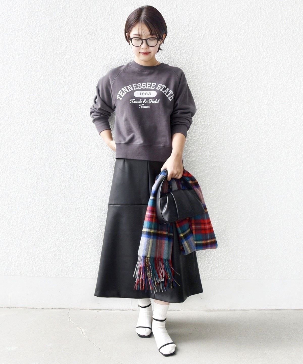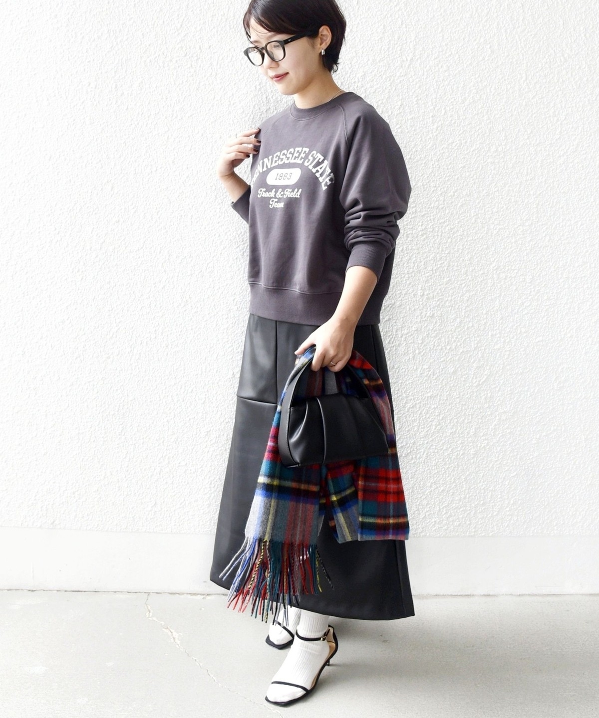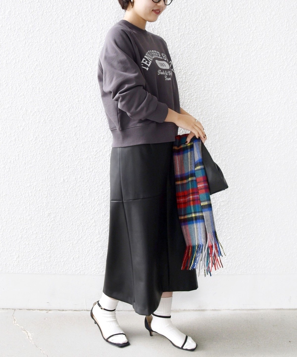 ウールコートやニットなどトップスがふわっとした素材が増える時期にボトムにこのような光沢感ある素材を合わせるとコーディネートにメリハリがでます。