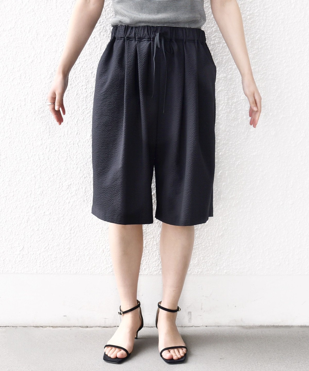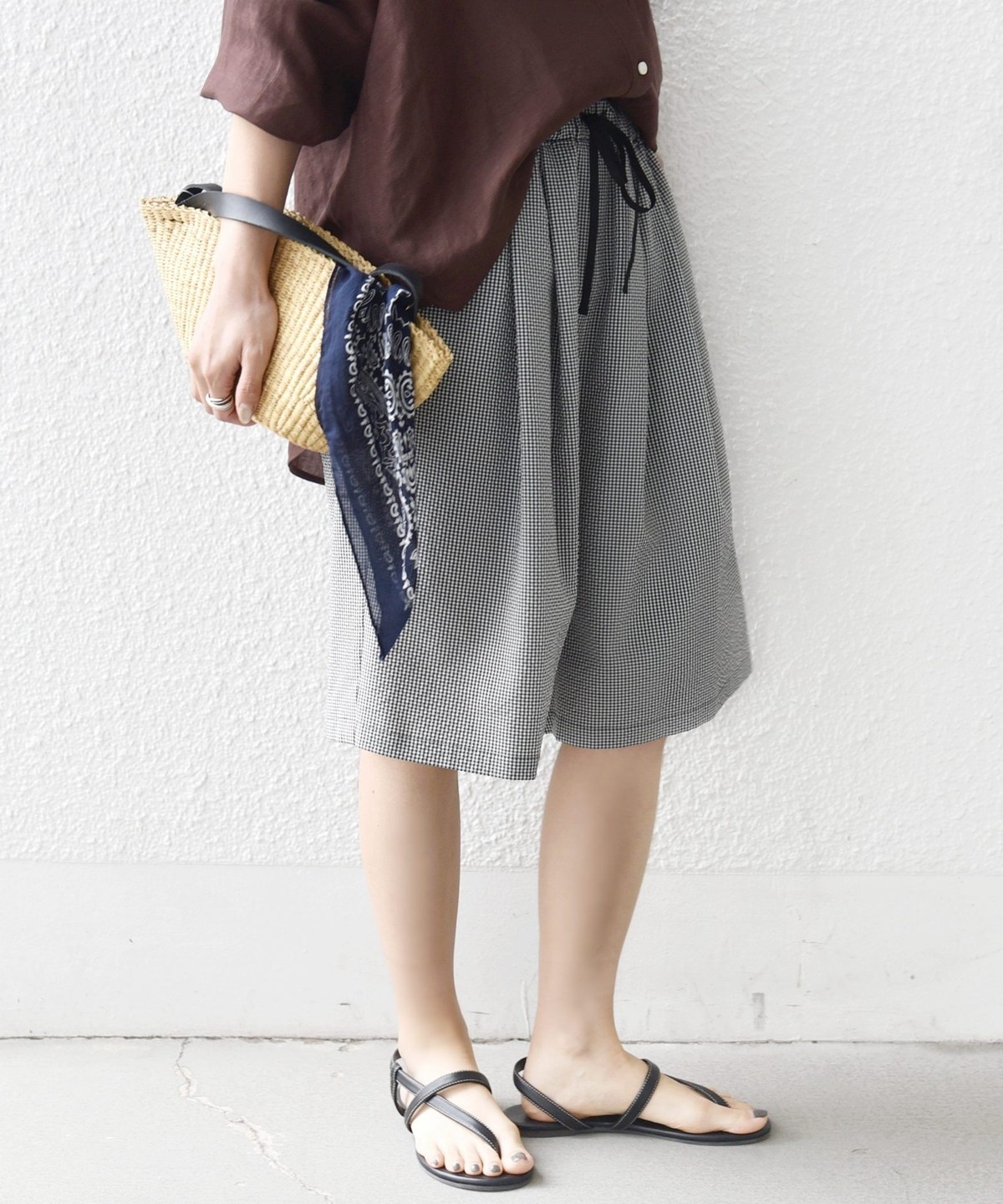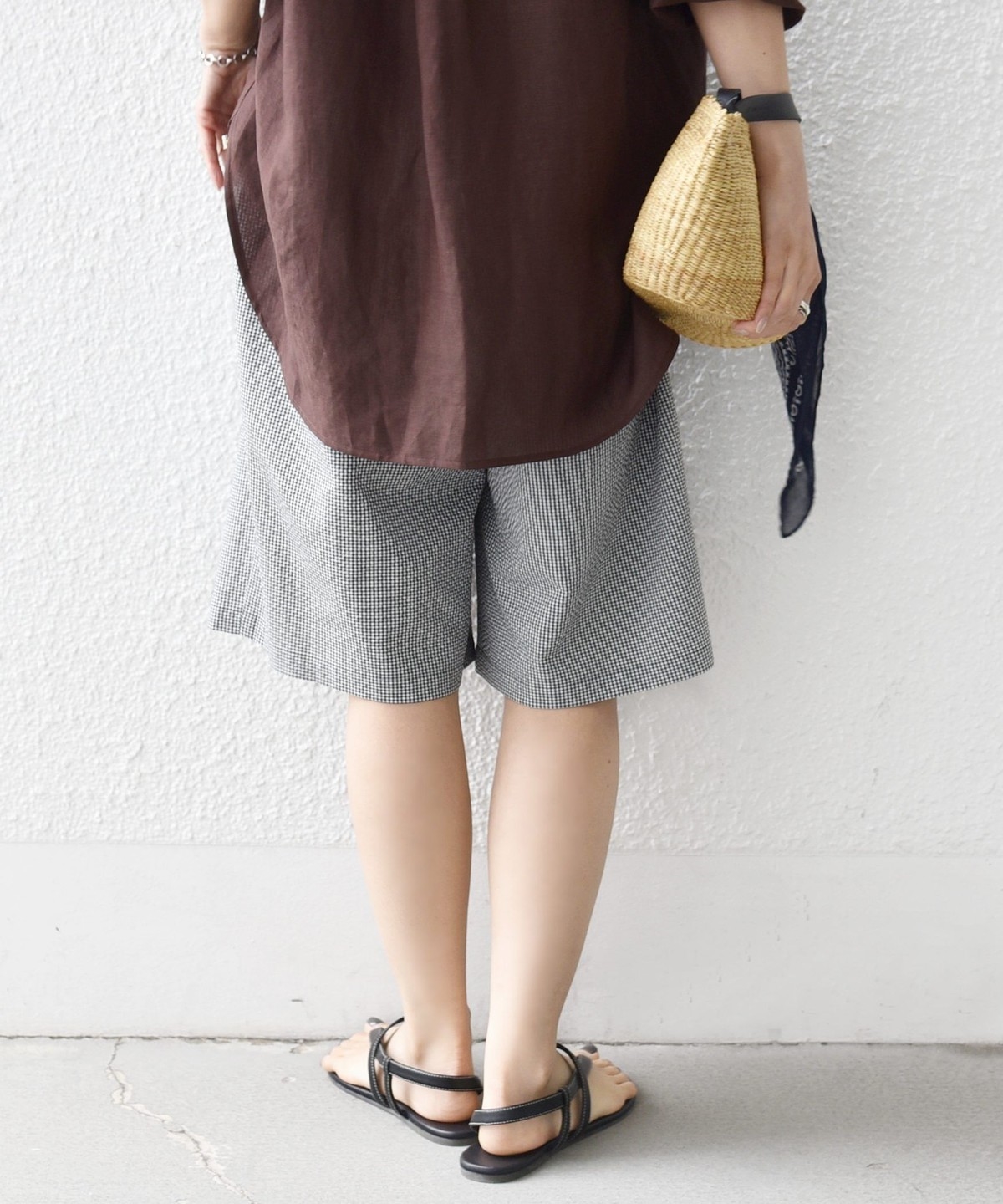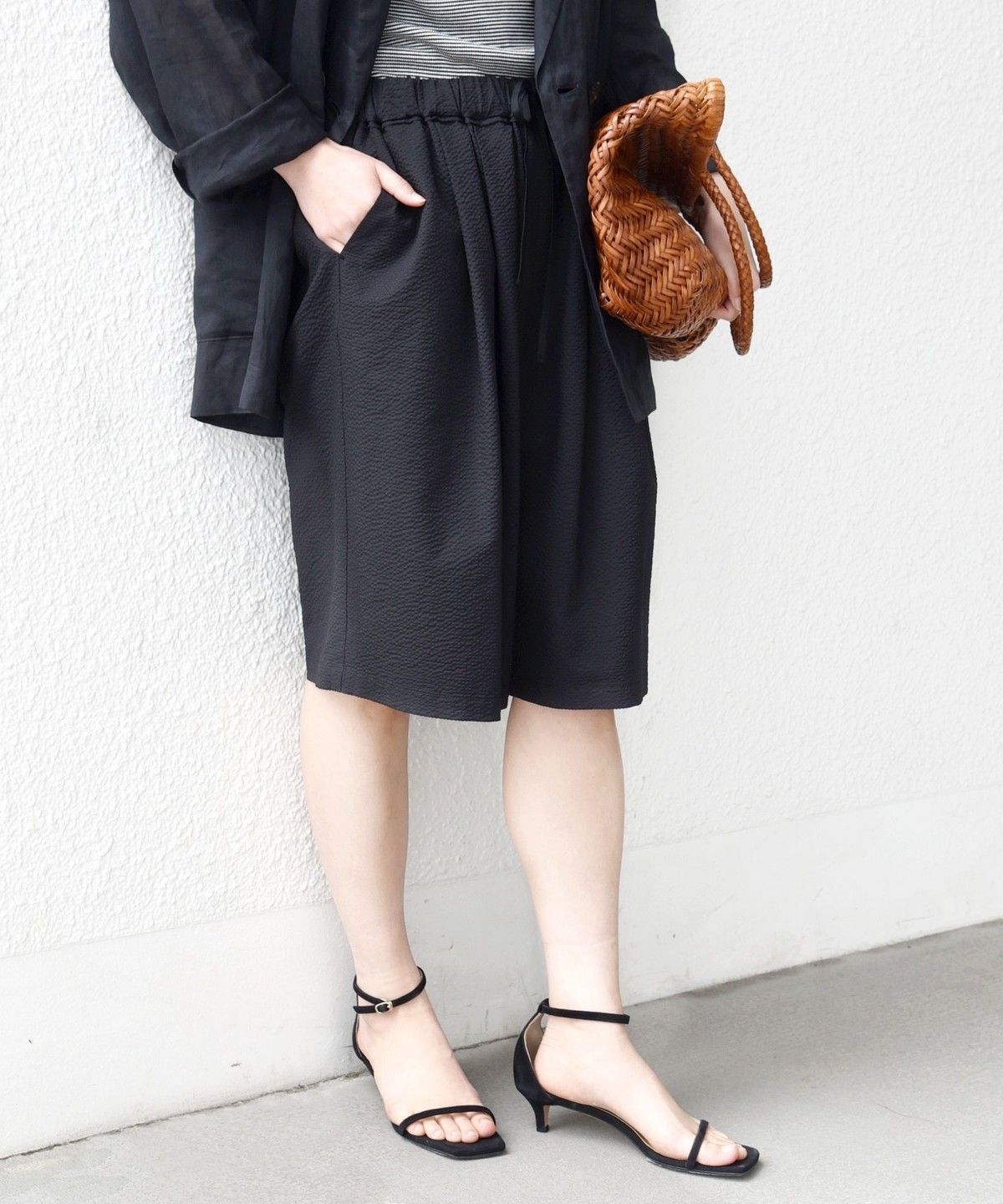 ショートパンツも大人っぽい丈感にしている為、ラフにTシャツ、女性らしいサンダルを履くシンプルコーディネートでも大人な印象に。