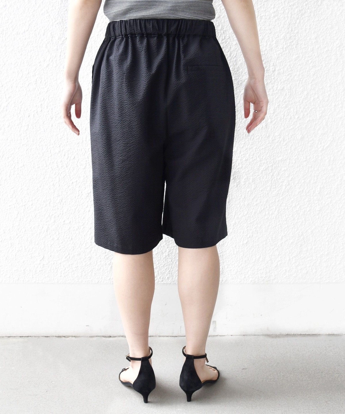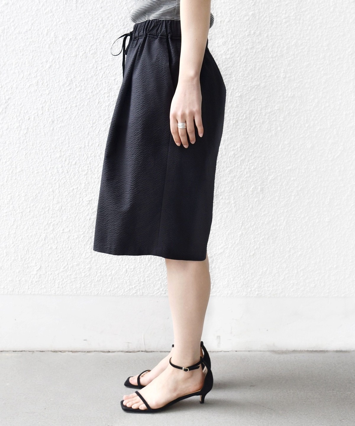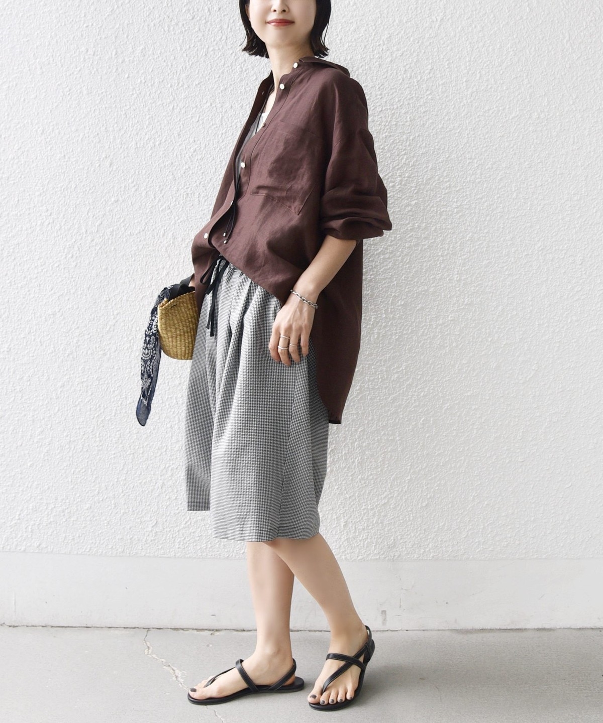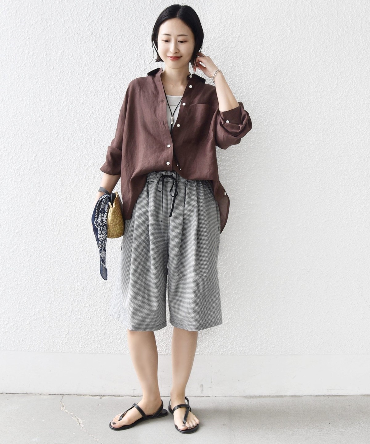 ショートパンツも大人っぽい丈感にしている為、ラフにTシャツ、女性らしいサンダルを履くシンプルコーディネートでも大人な印象に。