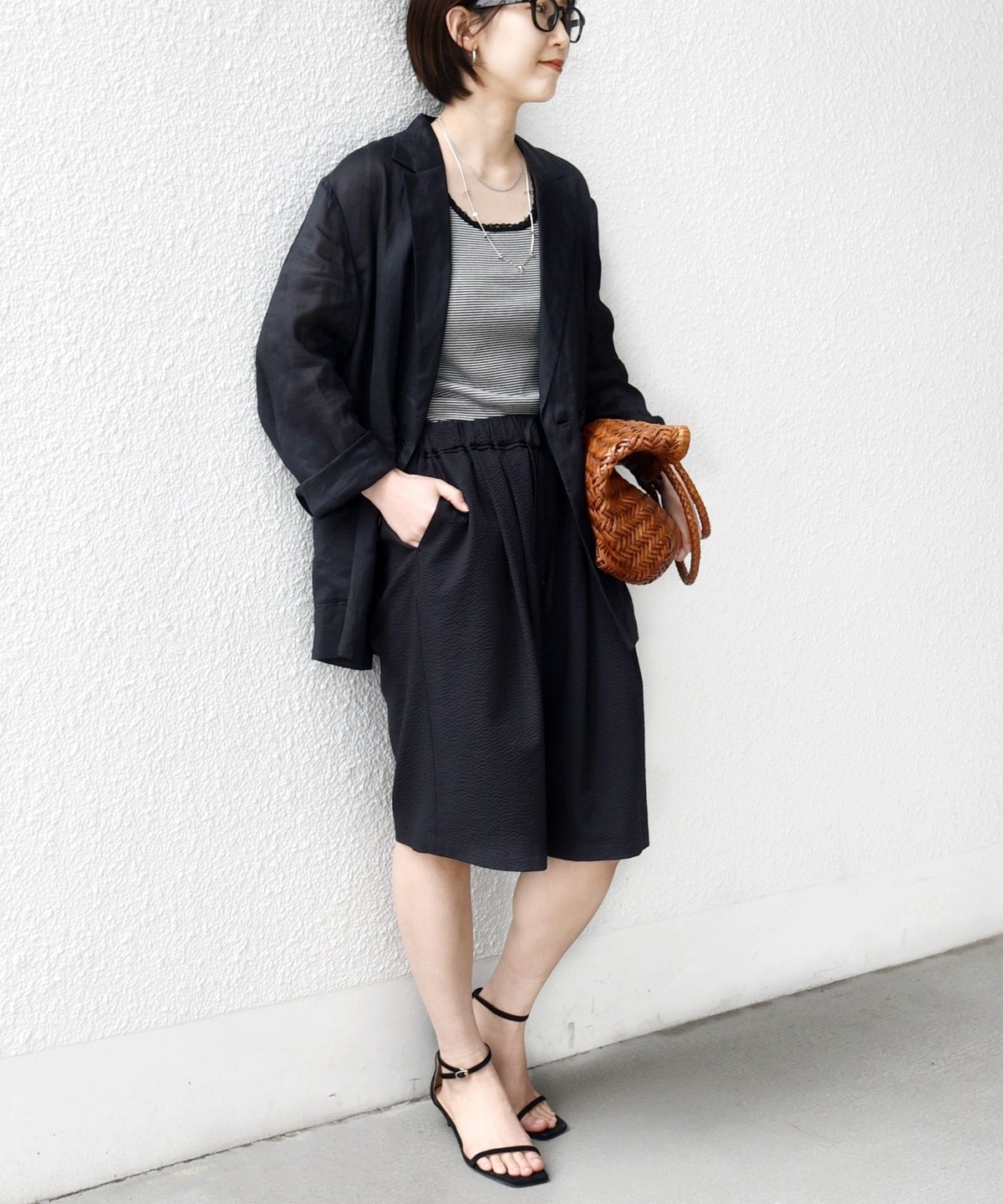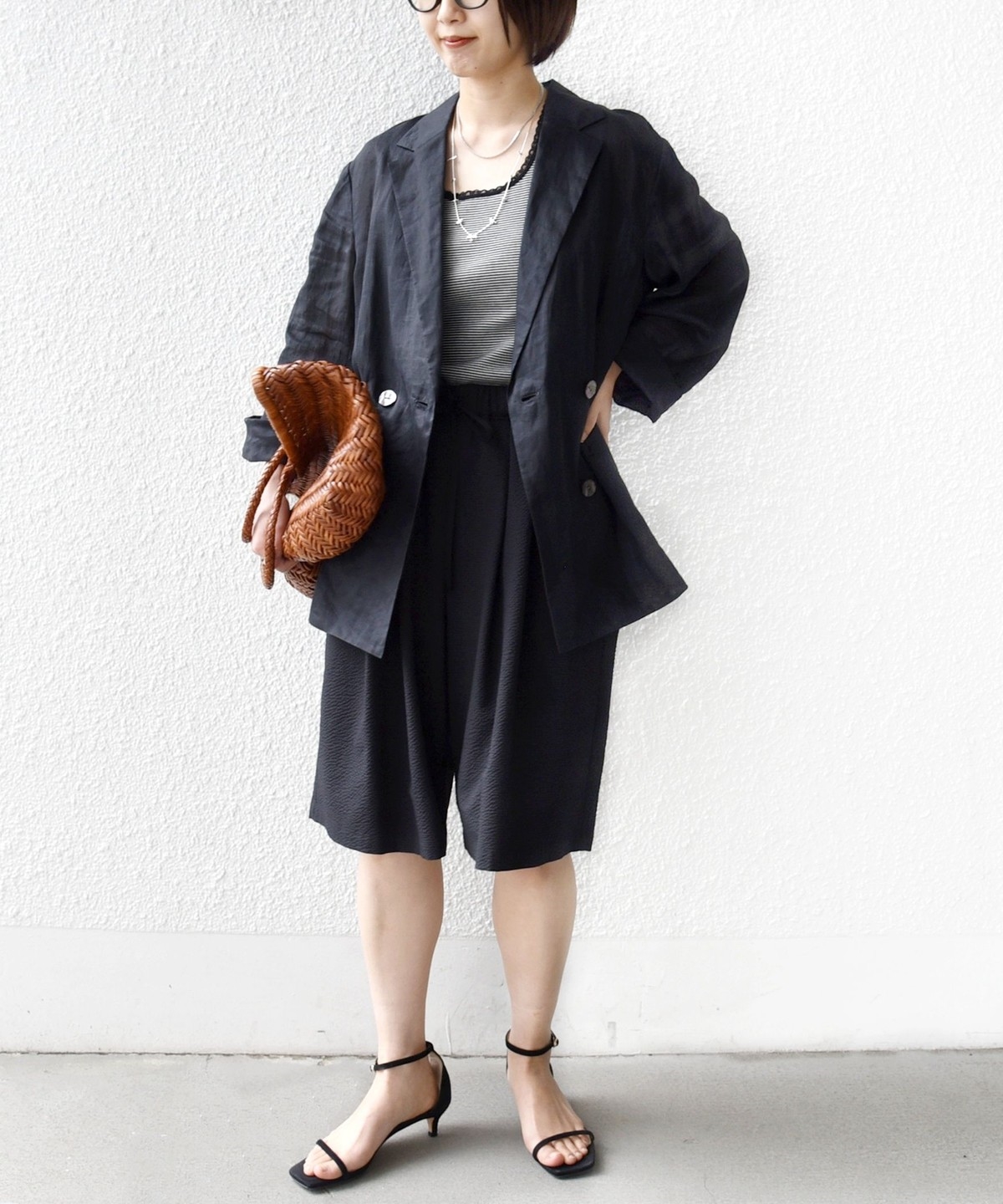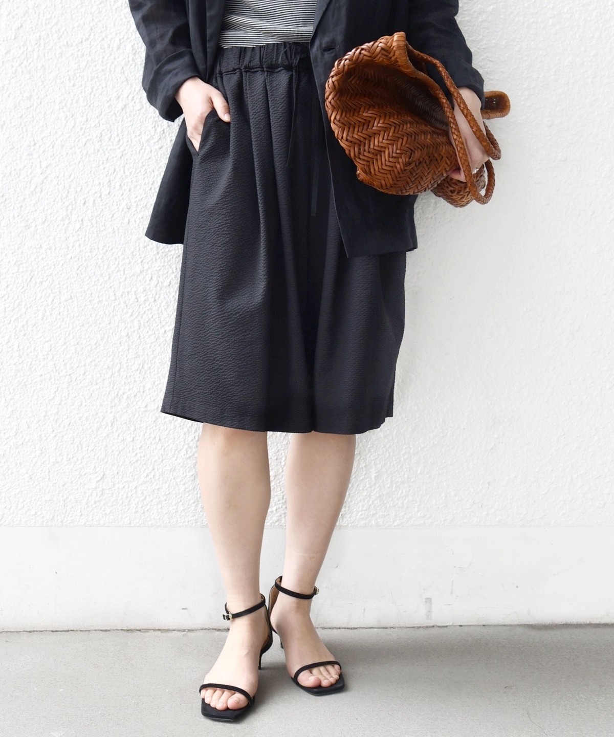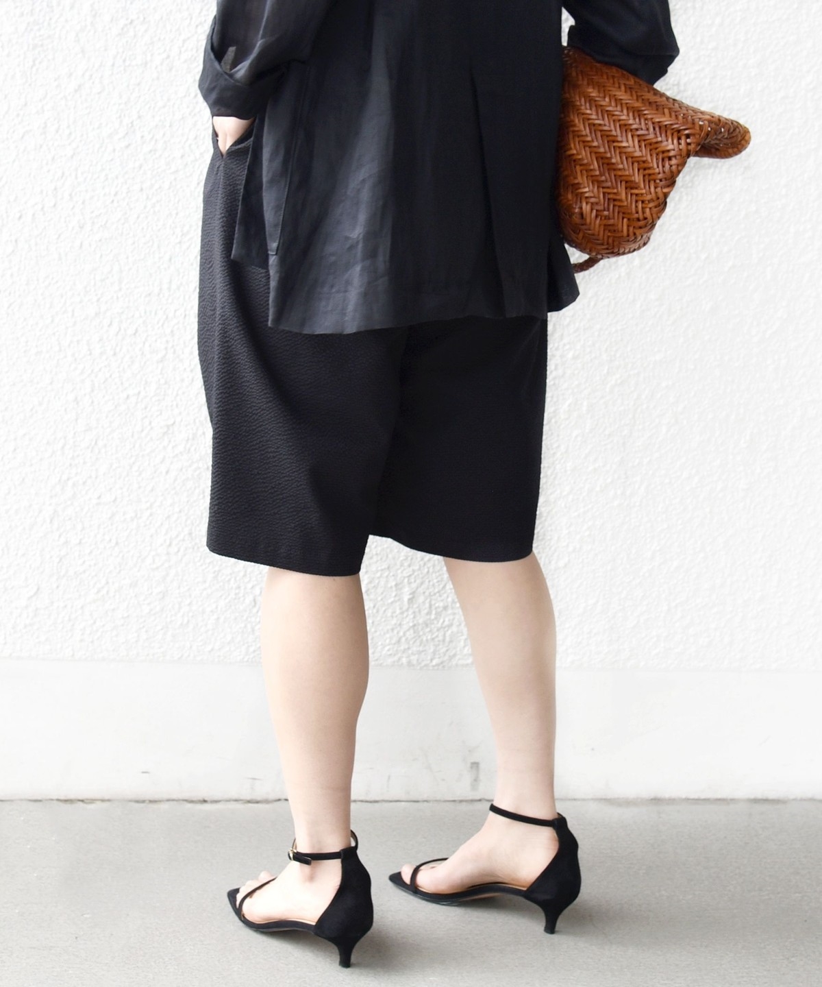 ショートパンツも大人っぽい丈感にしている為、ラフにTシャツ、女性らしいサンダルを履くシンプルコーディネートでも大人な印象に。