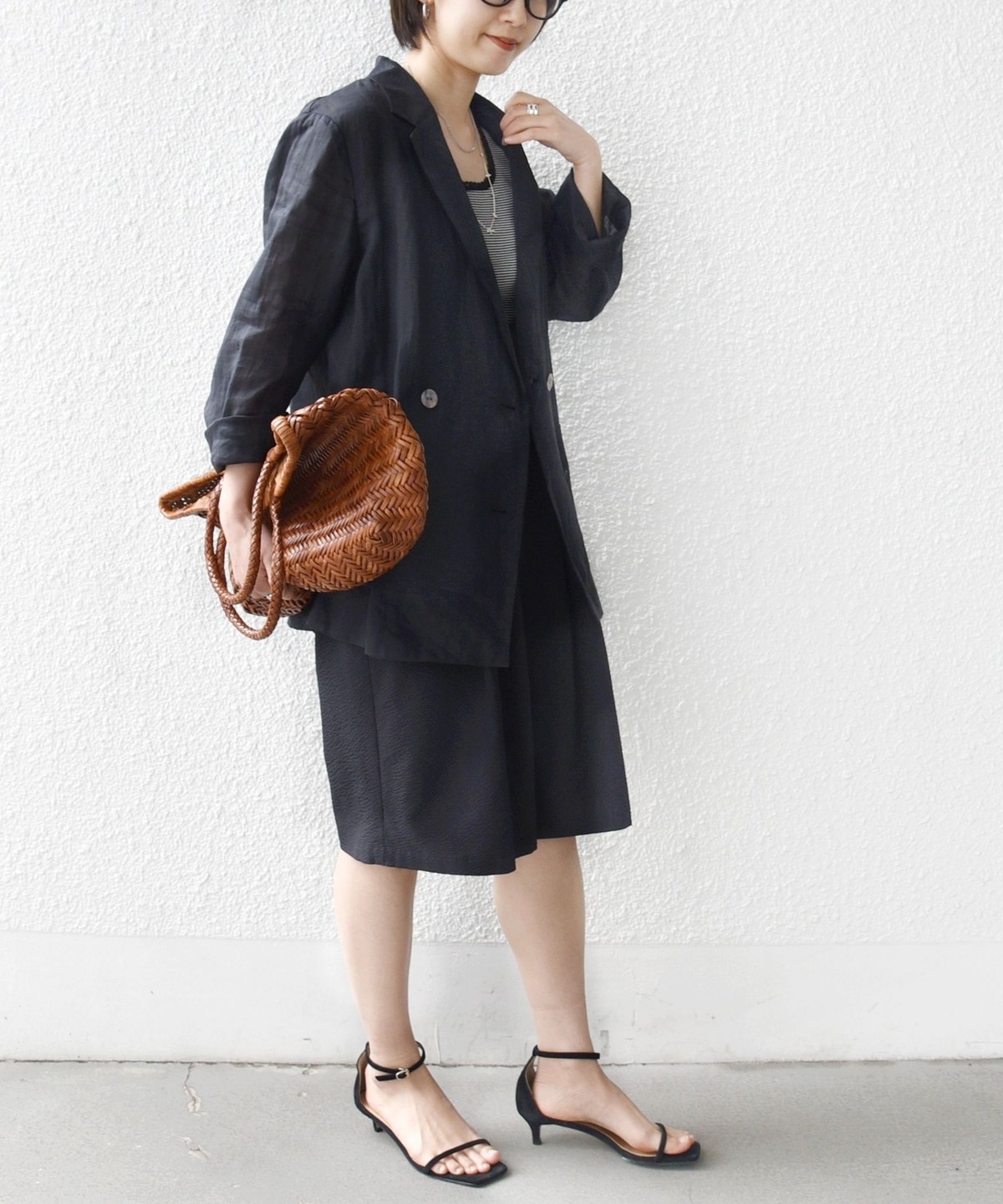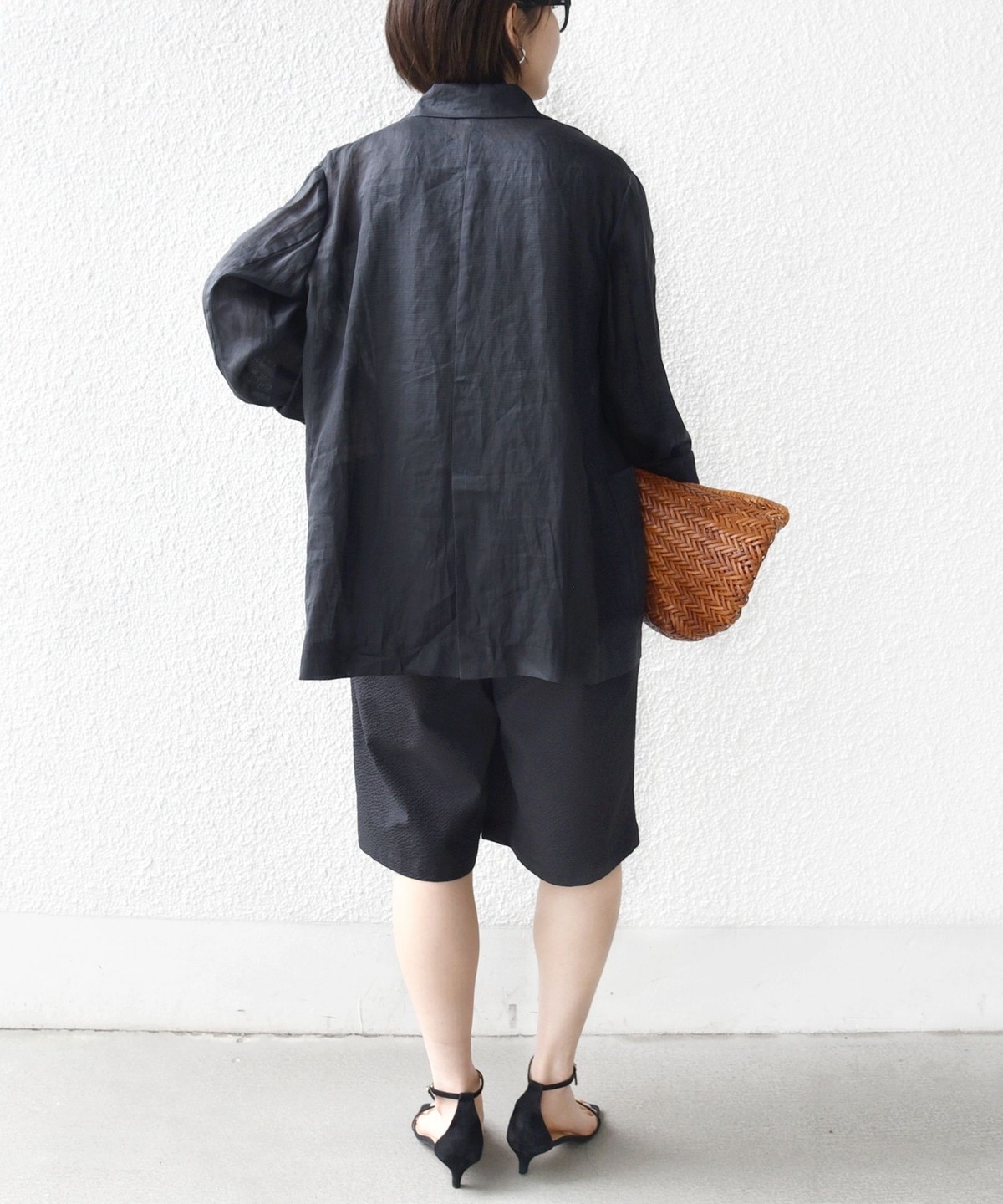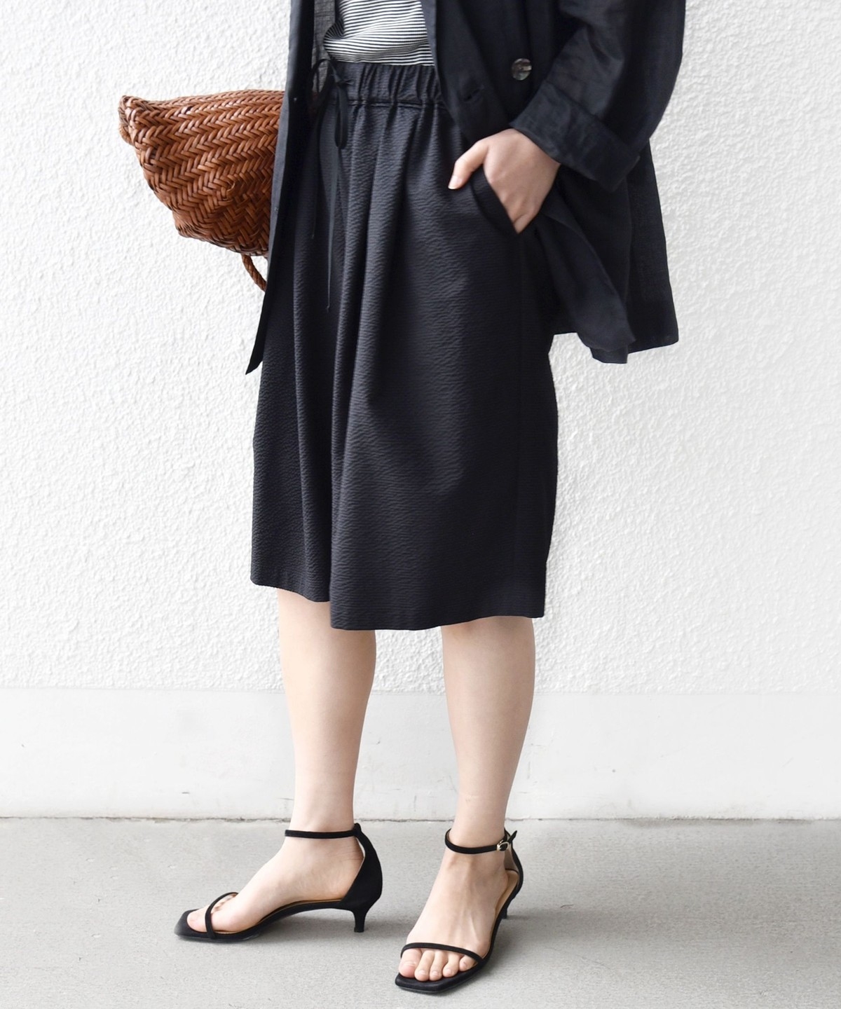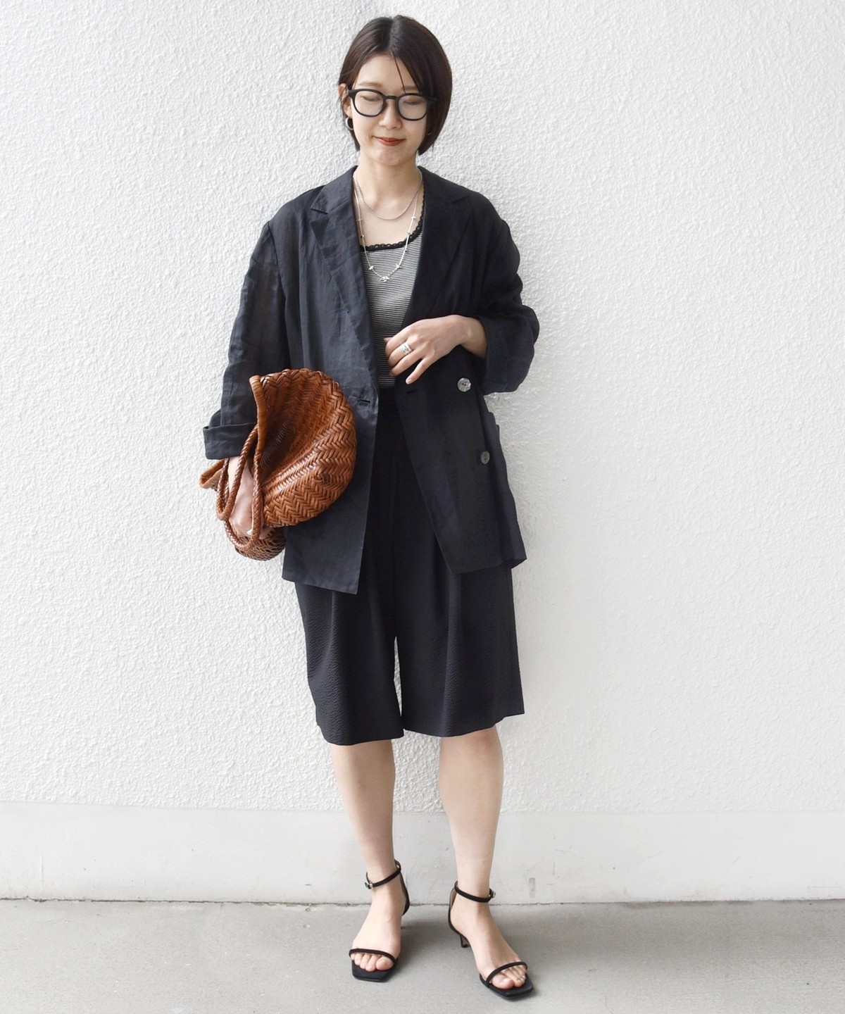 ショートパンツも大人っぽい丈感にしている為、ラフにTシャツ、女性らしいサンダルを履くシンプルコーディネートでも大人な印象に。