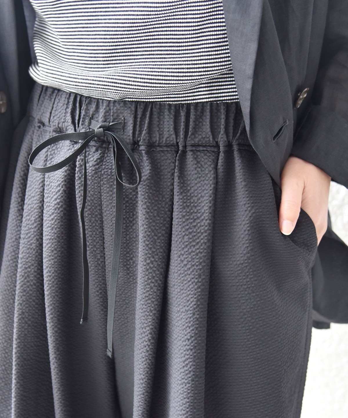 ウエストインした際にデザインポイントにもなるように、ゴムの上にフリルデザインを施し女性らしい印象になるようにしました。