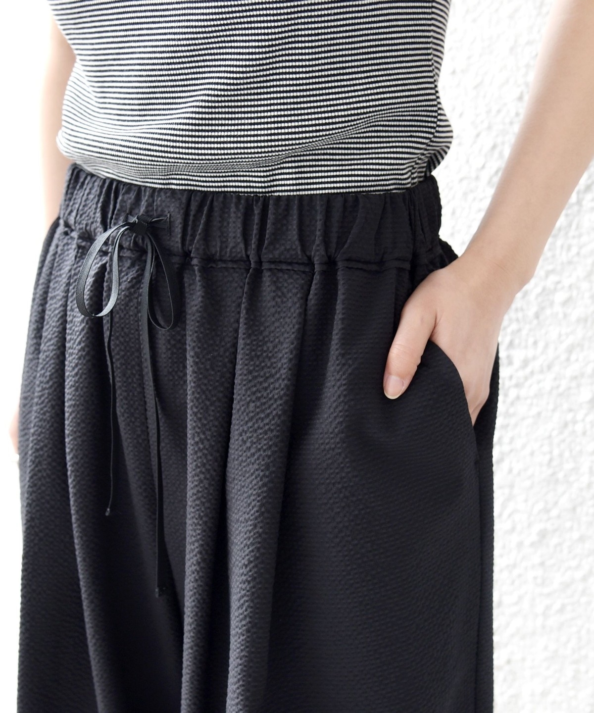 太めのシルエットにウエストゴム仕様でリラックス感のある穿き心地になります。