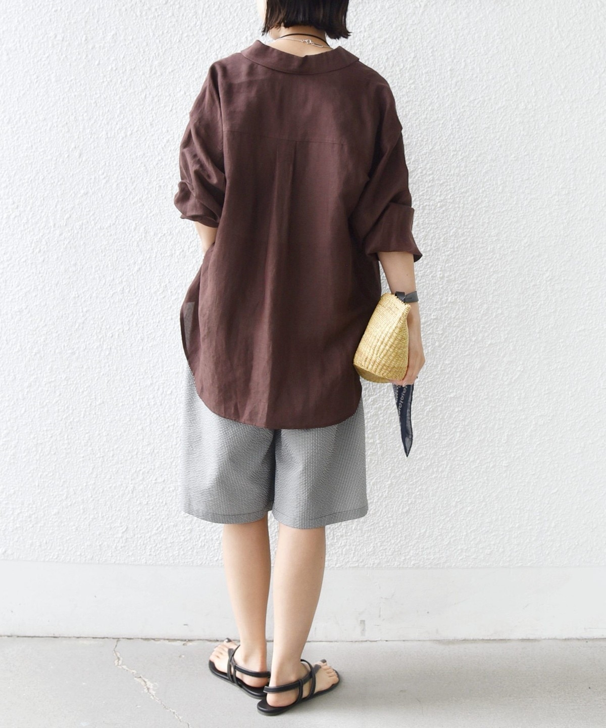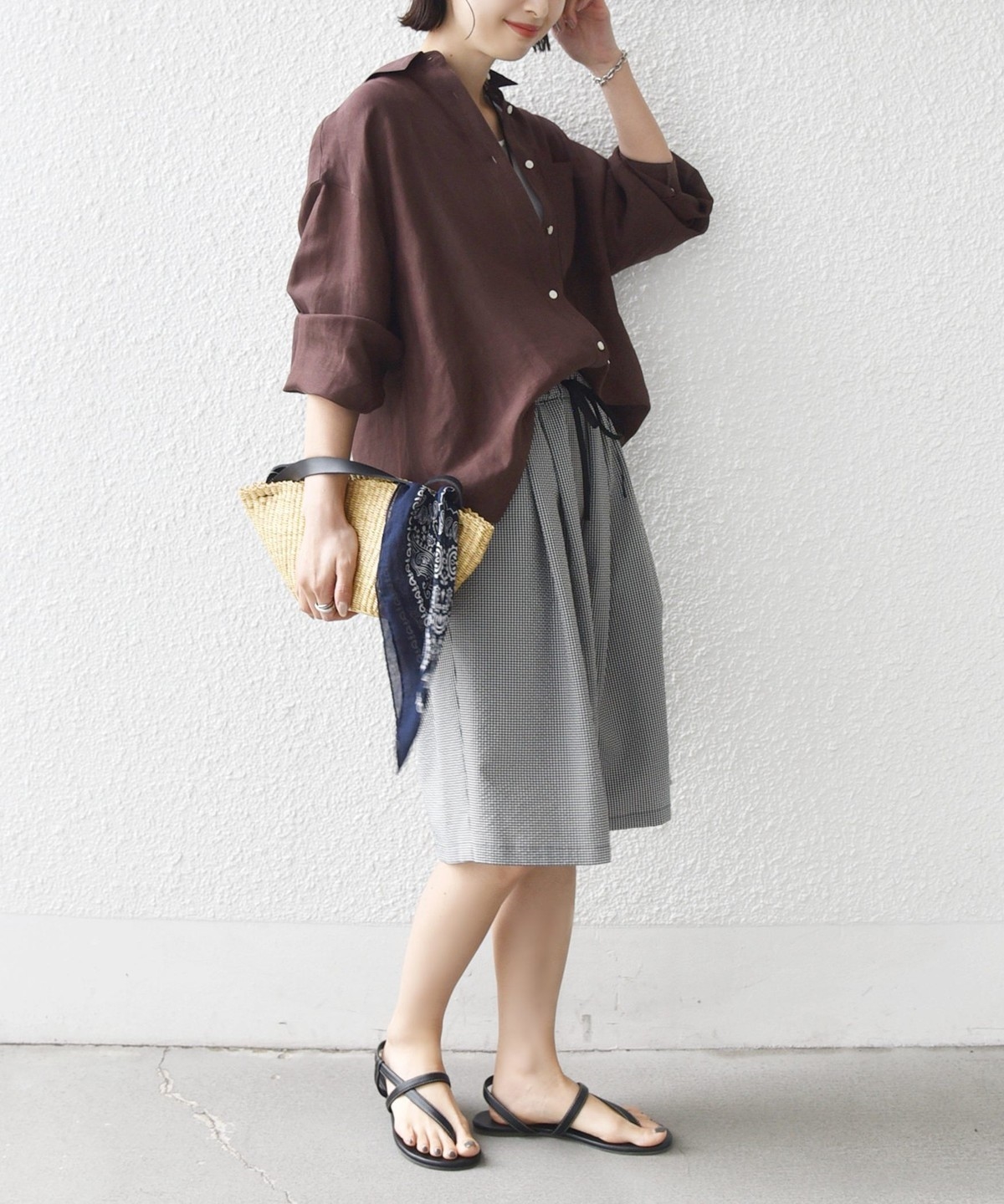 子供っぽくなりがちなギンガムですが、大人っぽい雰囲気で取り入れやすい無地見えの細かいギンガムになります。