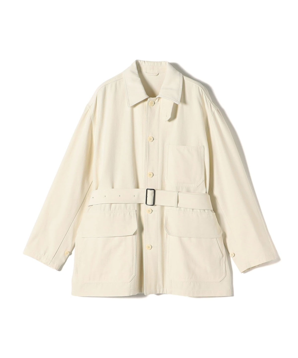 カバーオールのベルトを付けたデザインで、ハーフコートのような着方ができるとても軽いアウターです。
