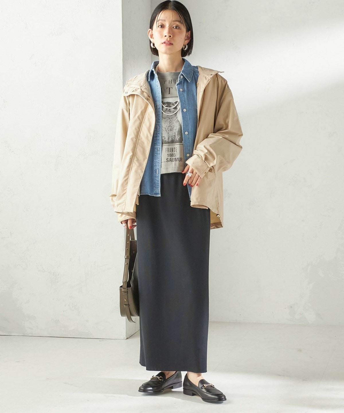 ワンピースの上から羽織ってカジュアルに着崩した着こなしも。