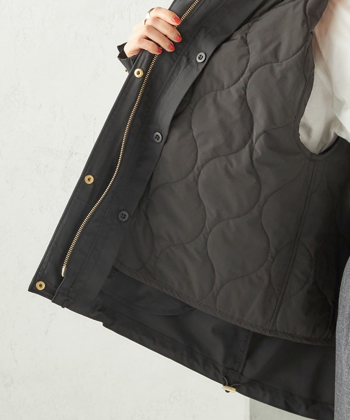 ライナーのキルトは中綿入りで薄く、軽い仕上がりに着ぶくれしないように仕上げました。