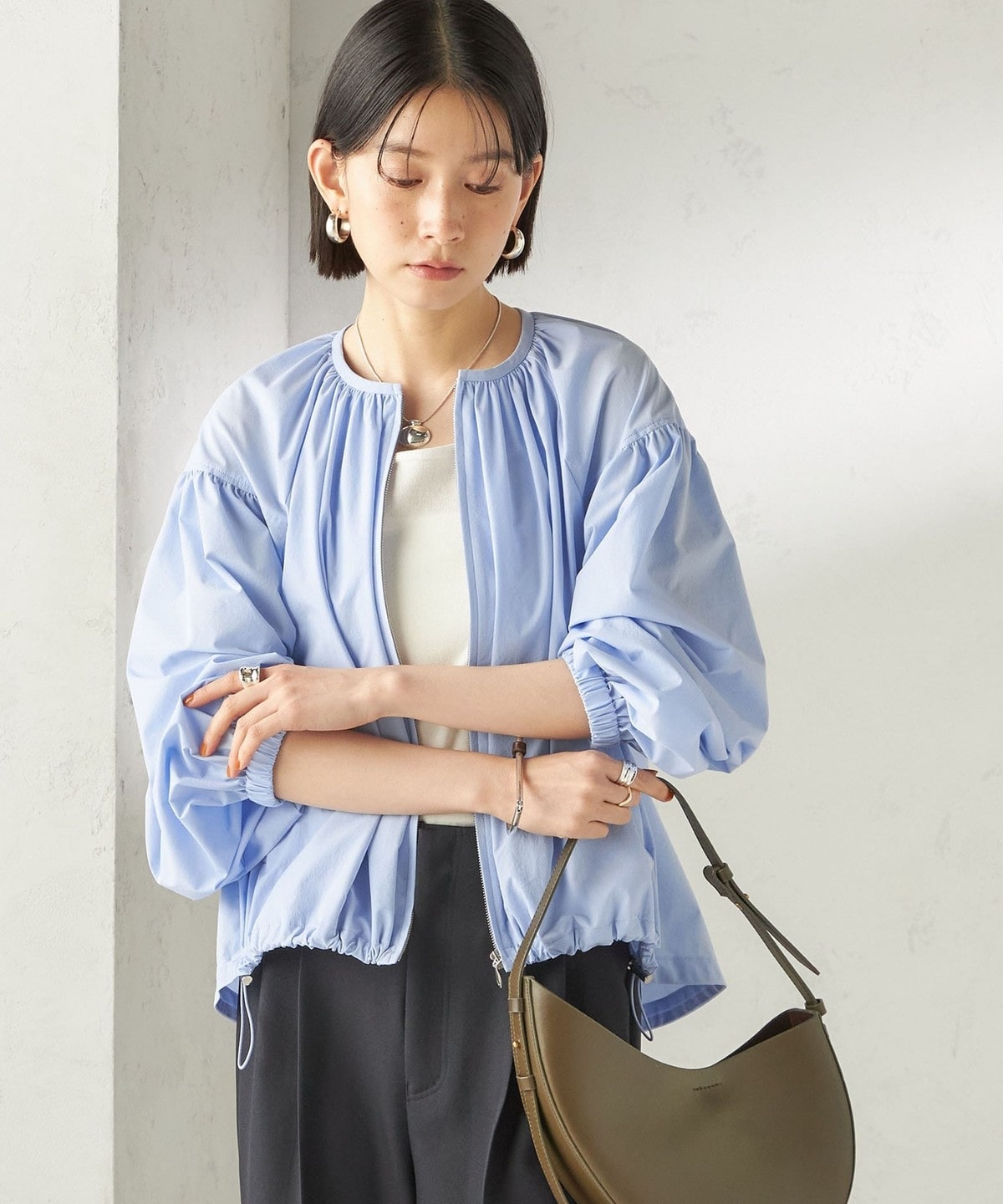 機能性素材を使用した、軽やかなギャザーデザインの羽織ブルゾン