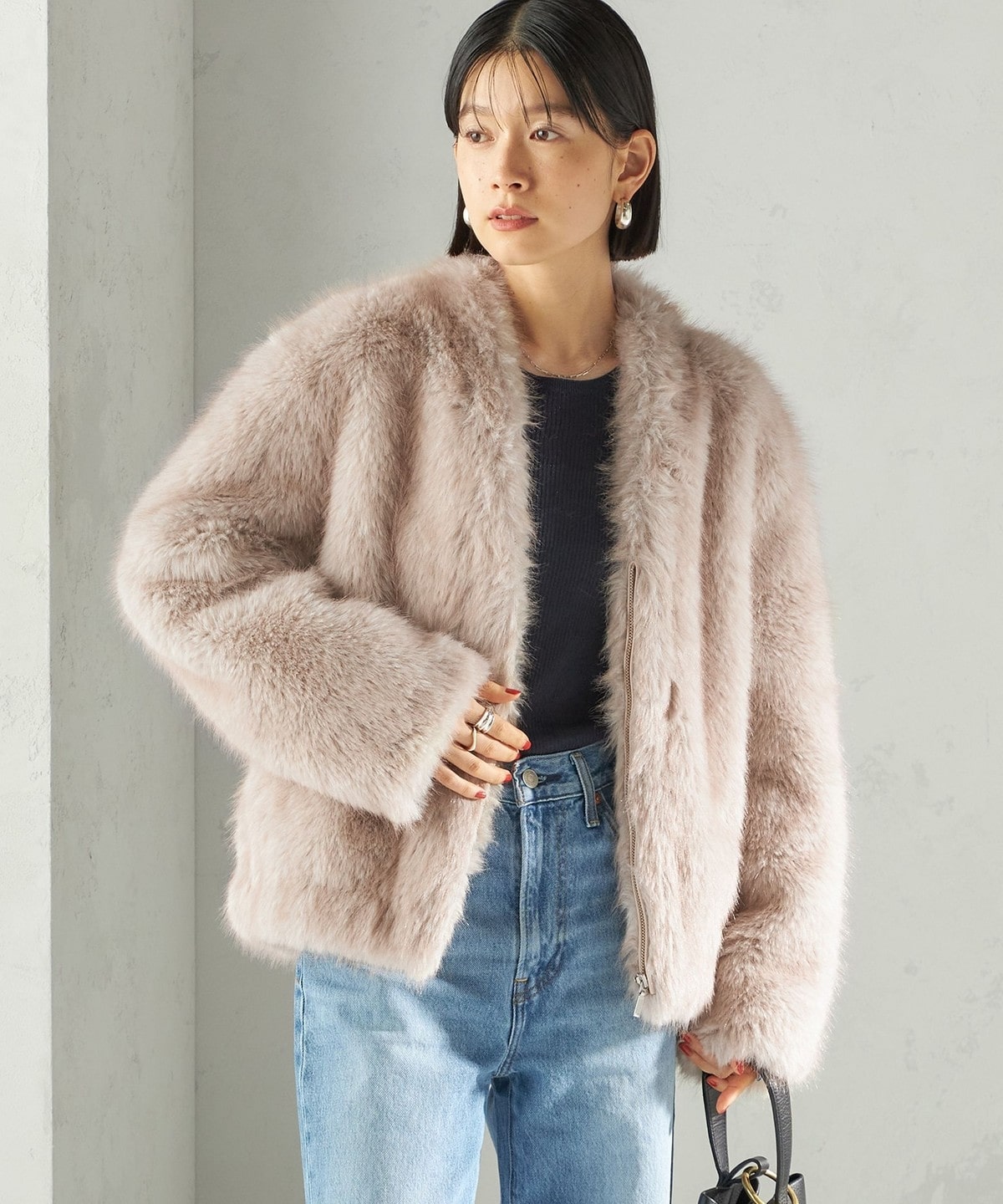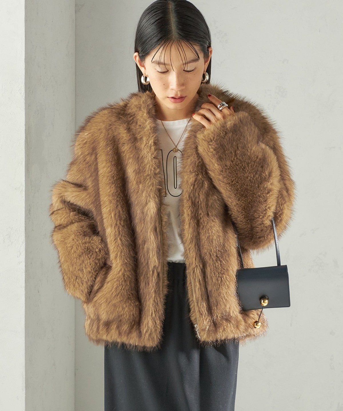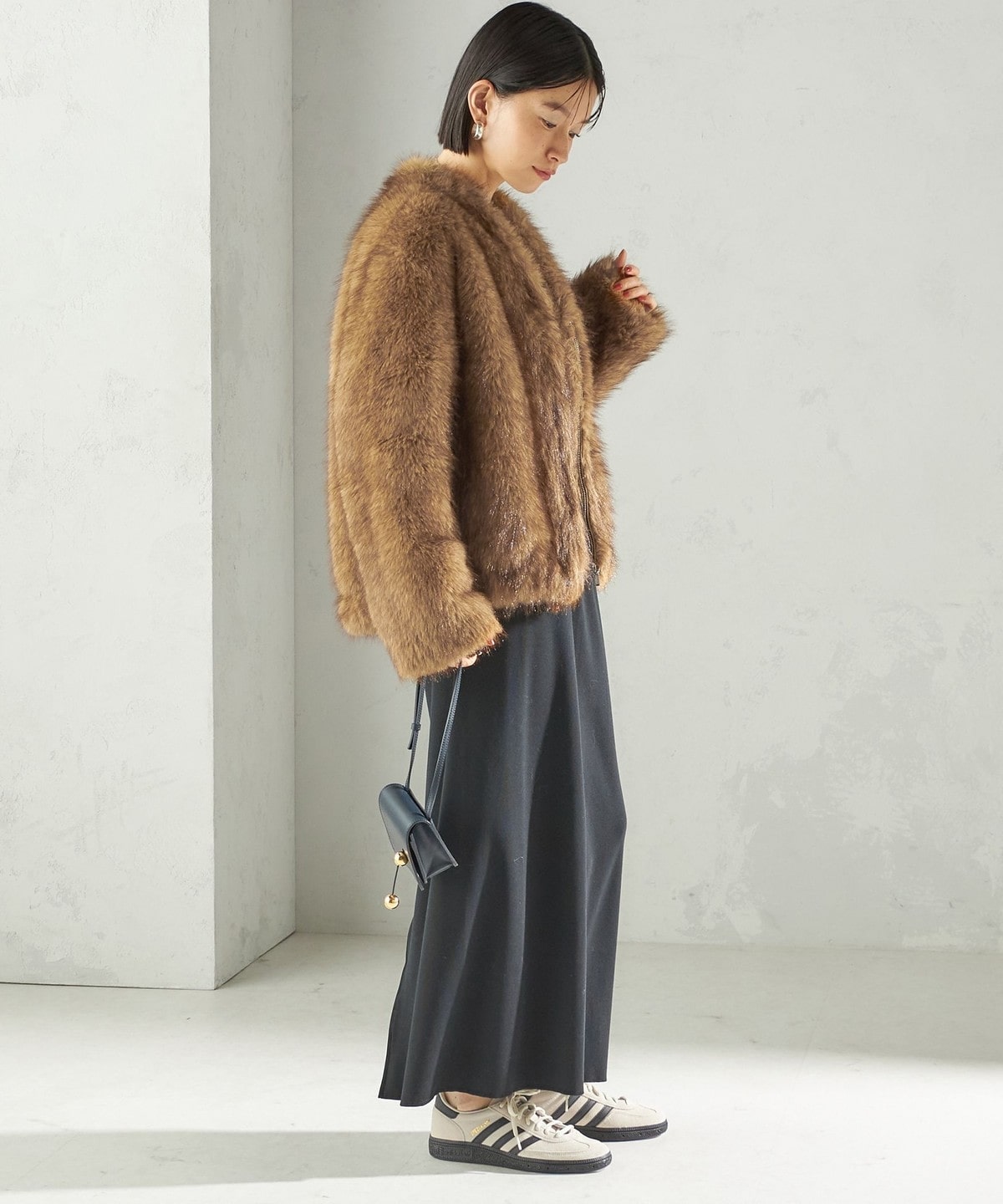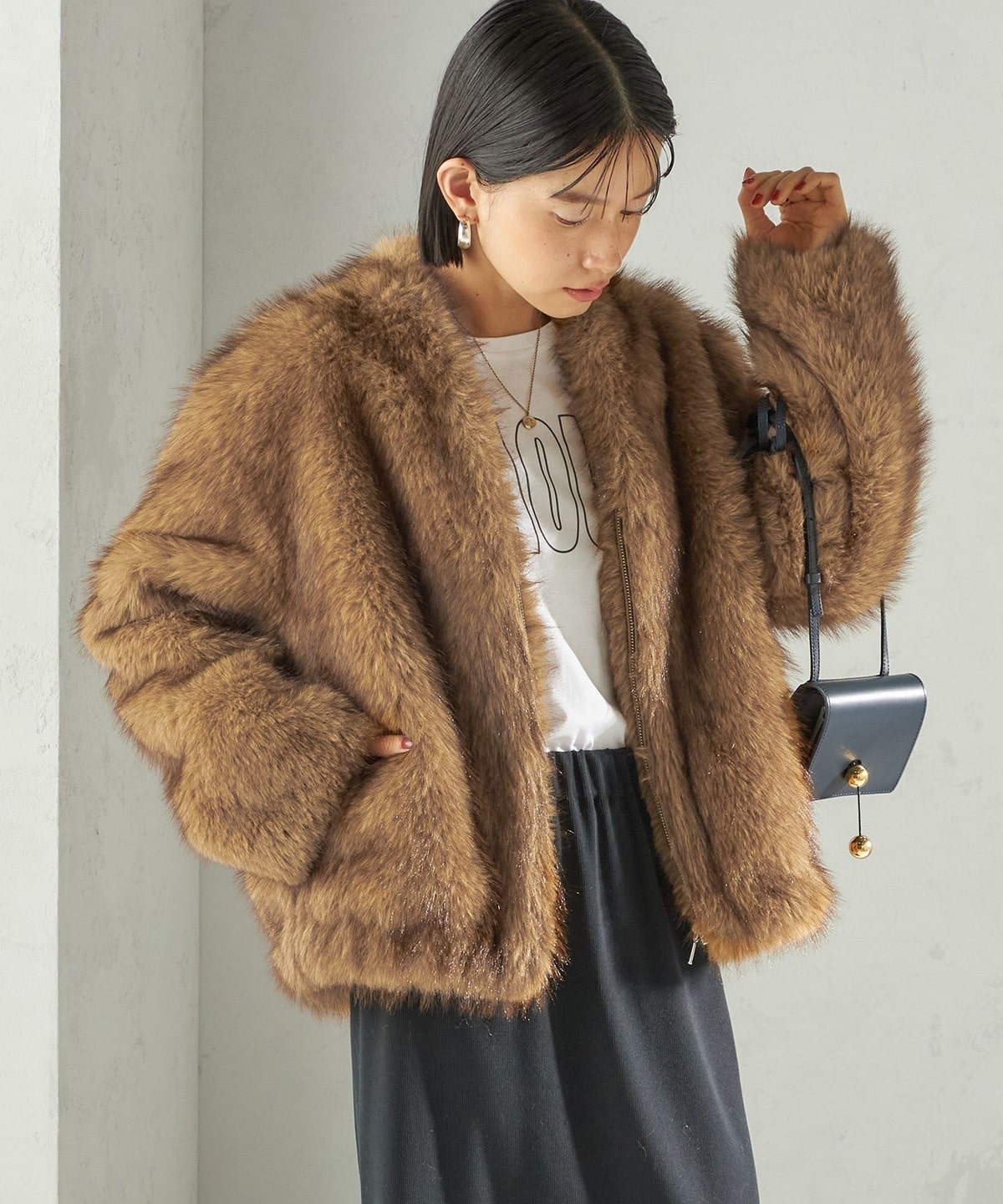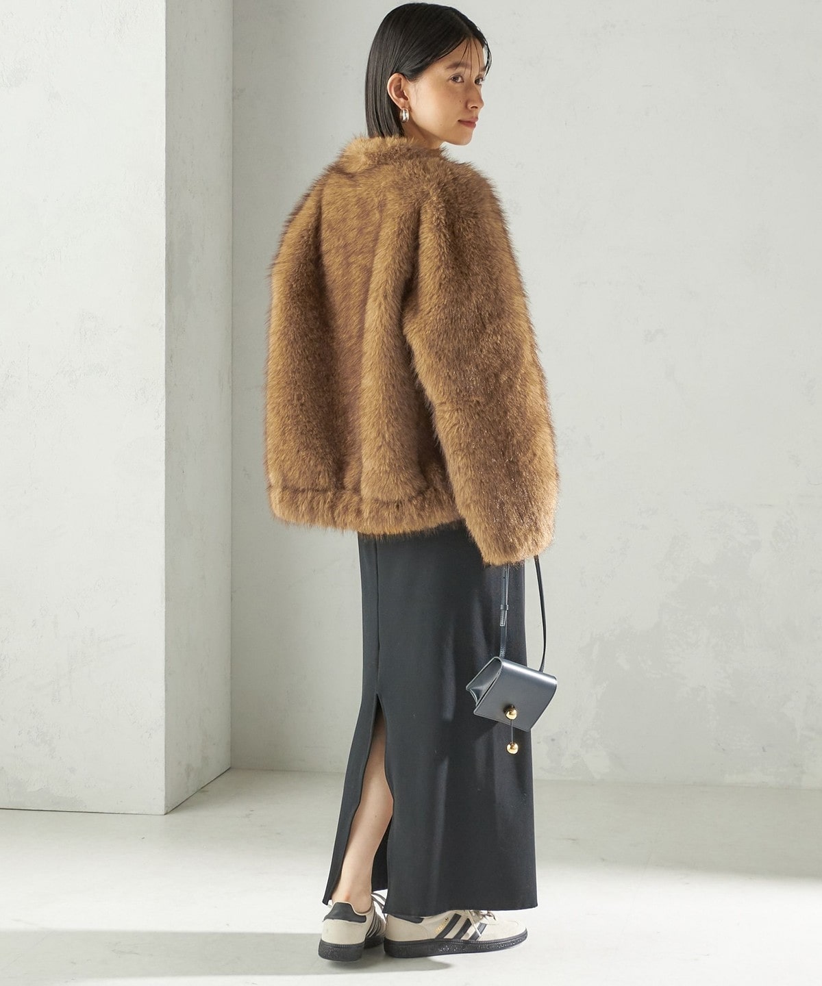 前の着丈を少し短めにし、ボリュームのあるファーとバランスを取りやすくしました。