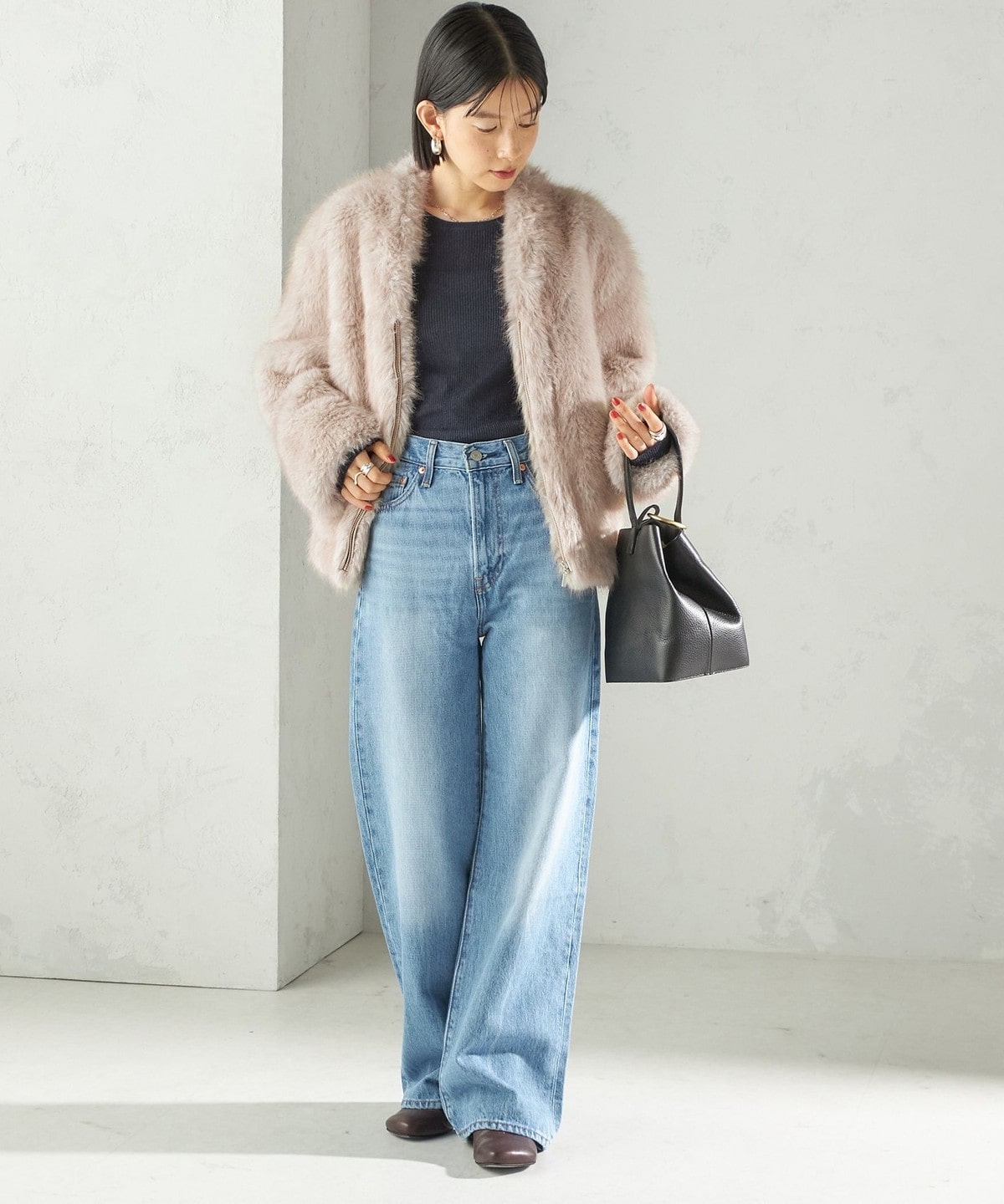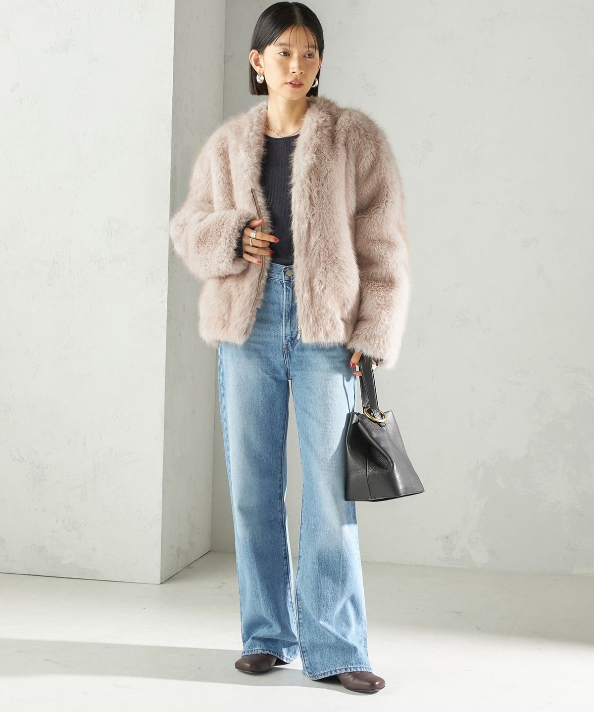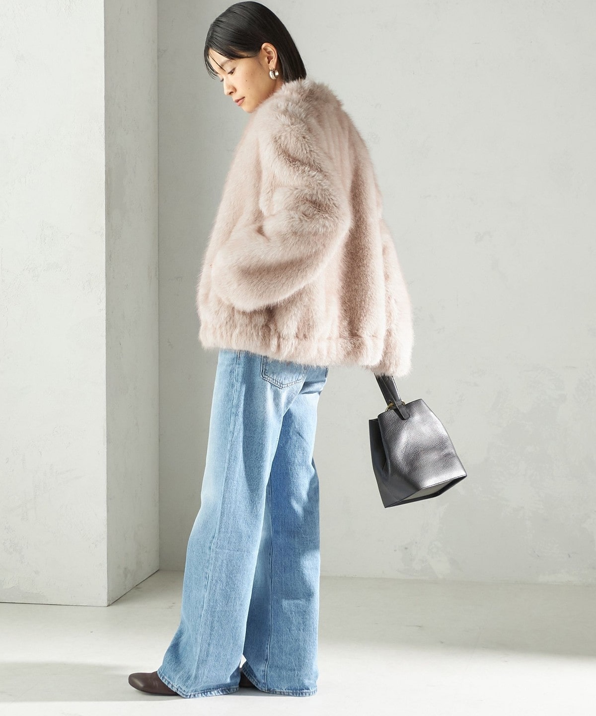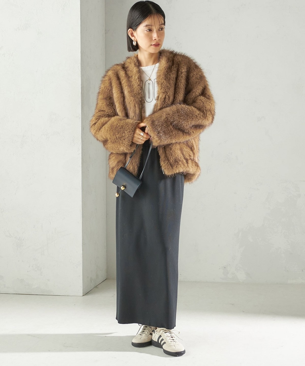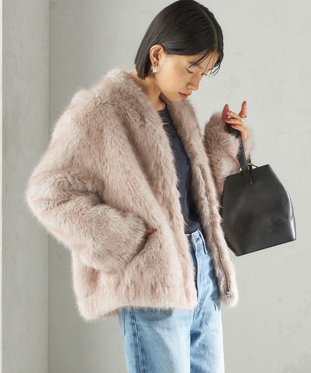 前の着丈を少し短めにし、ボリュームのあるファーとバランスを取りやすくしました。