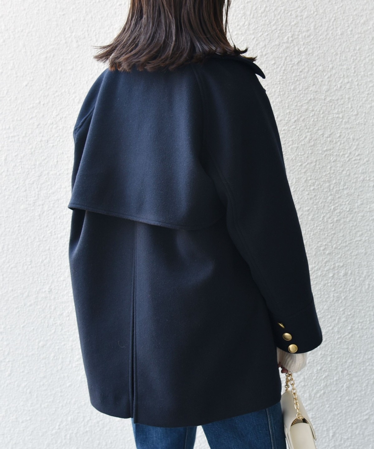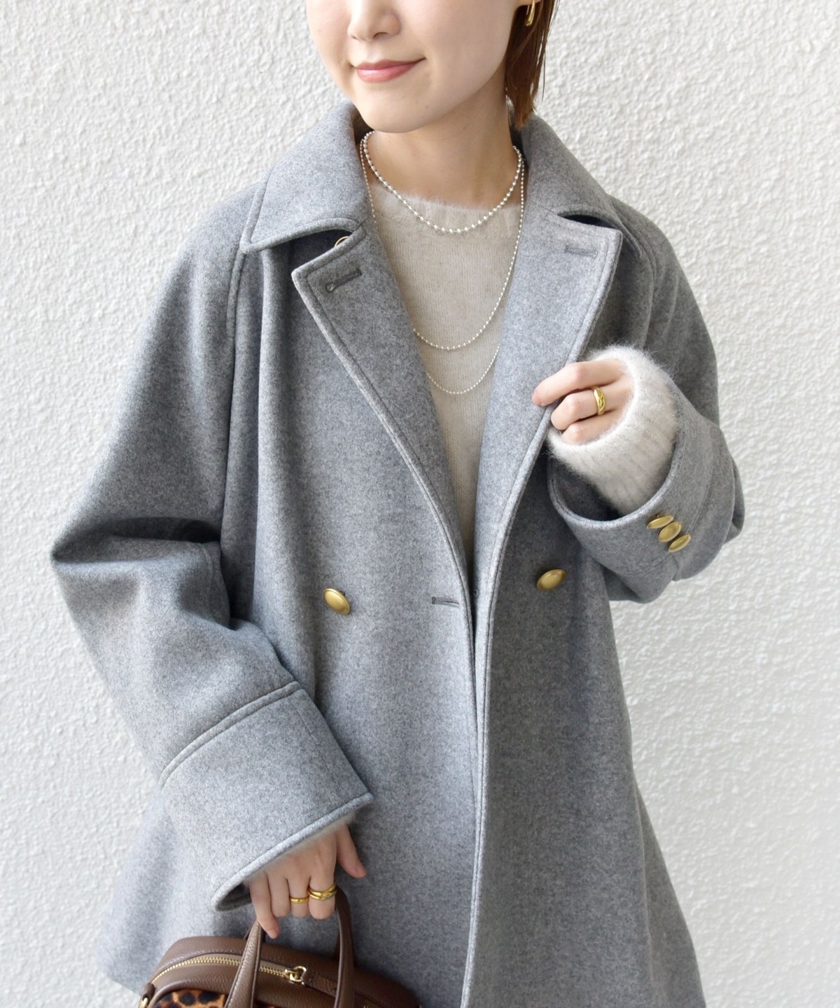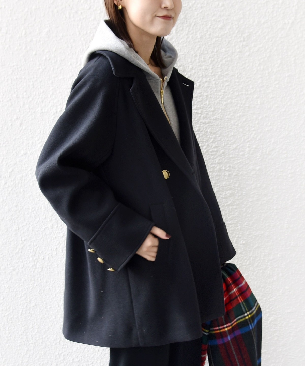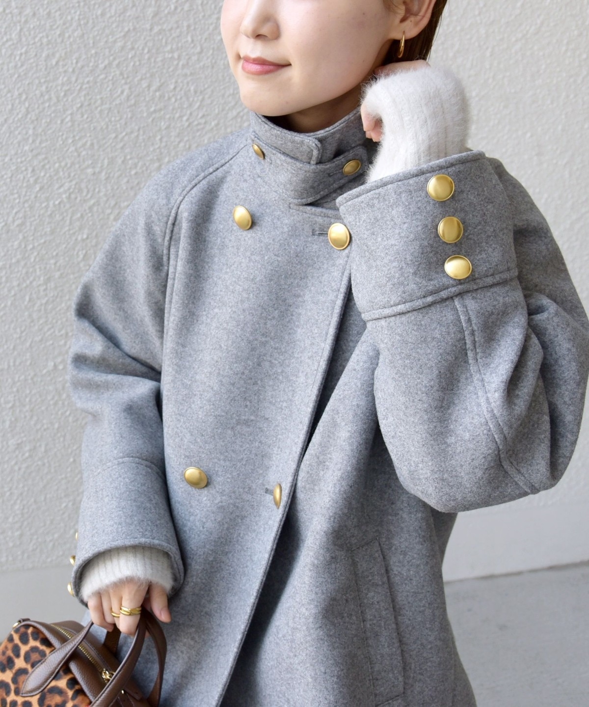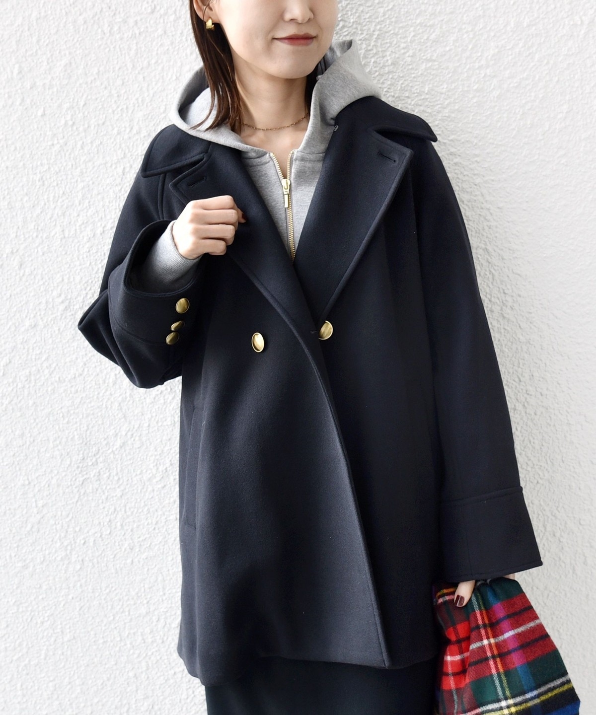 暖かさと着やすさを兼ね備えた、メタルボタンのミディ丈Pコート