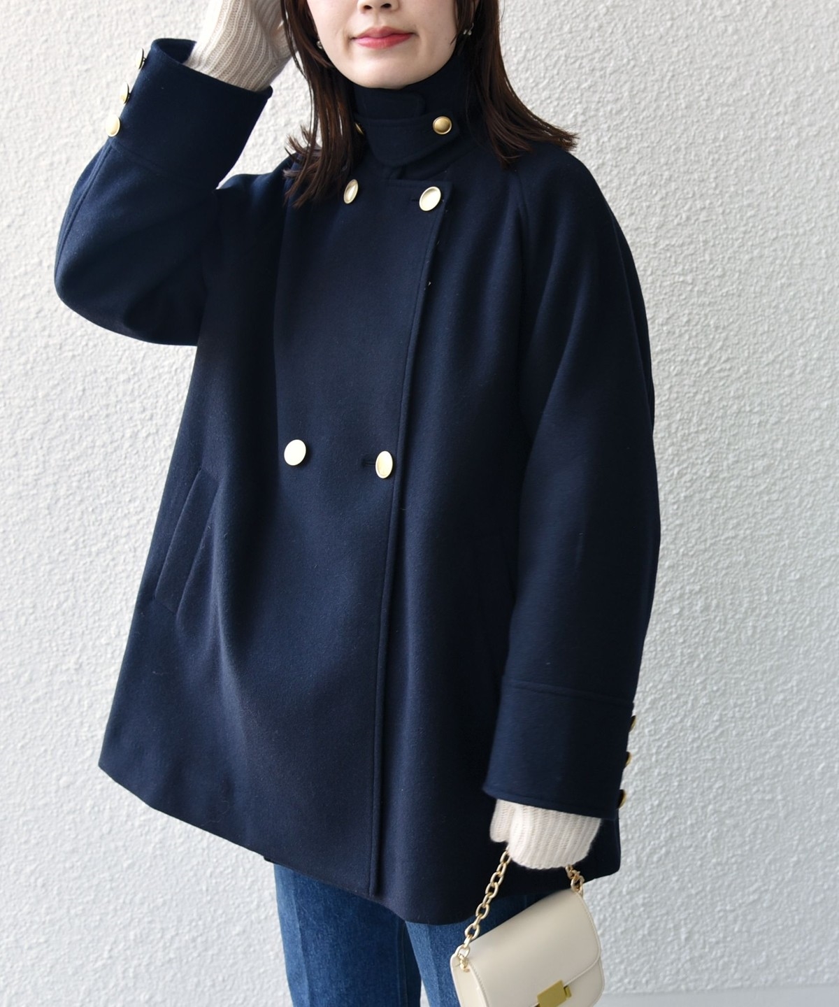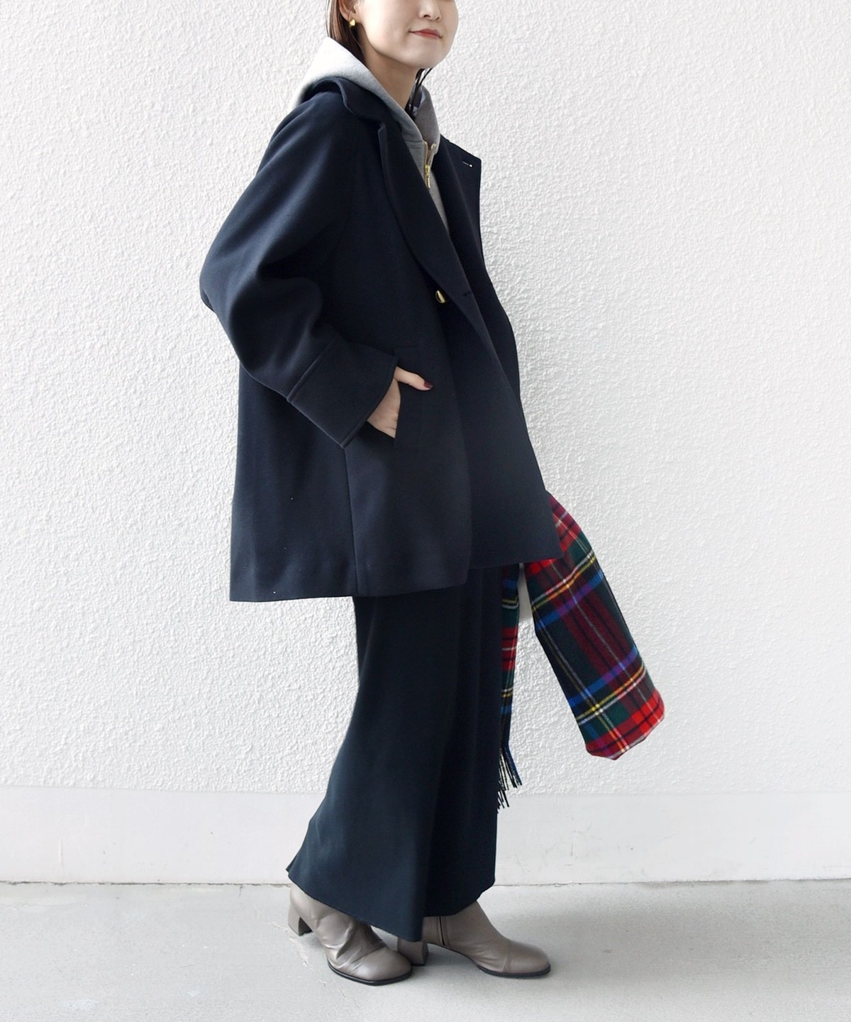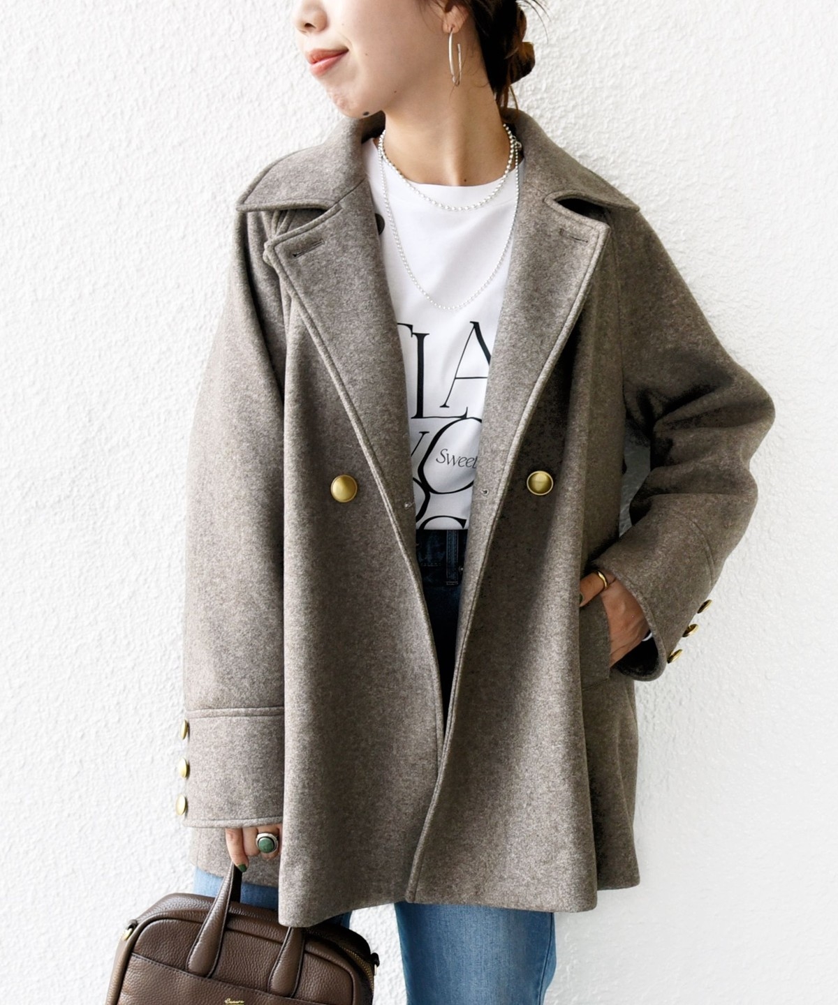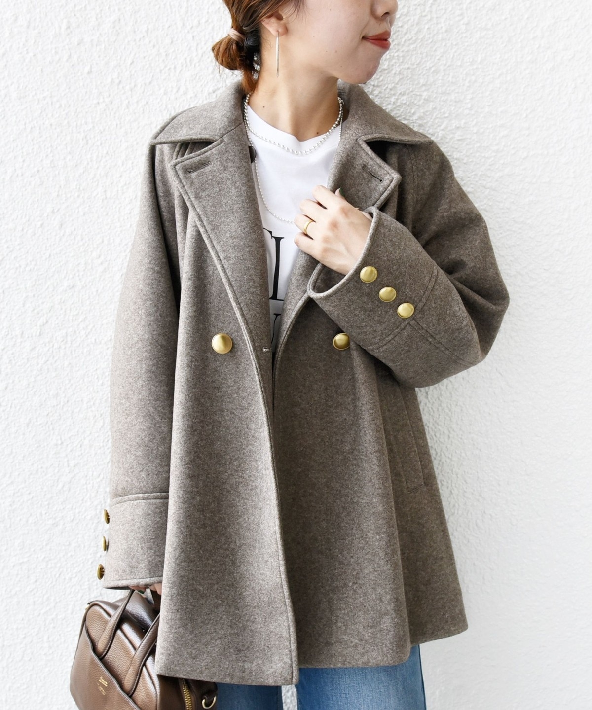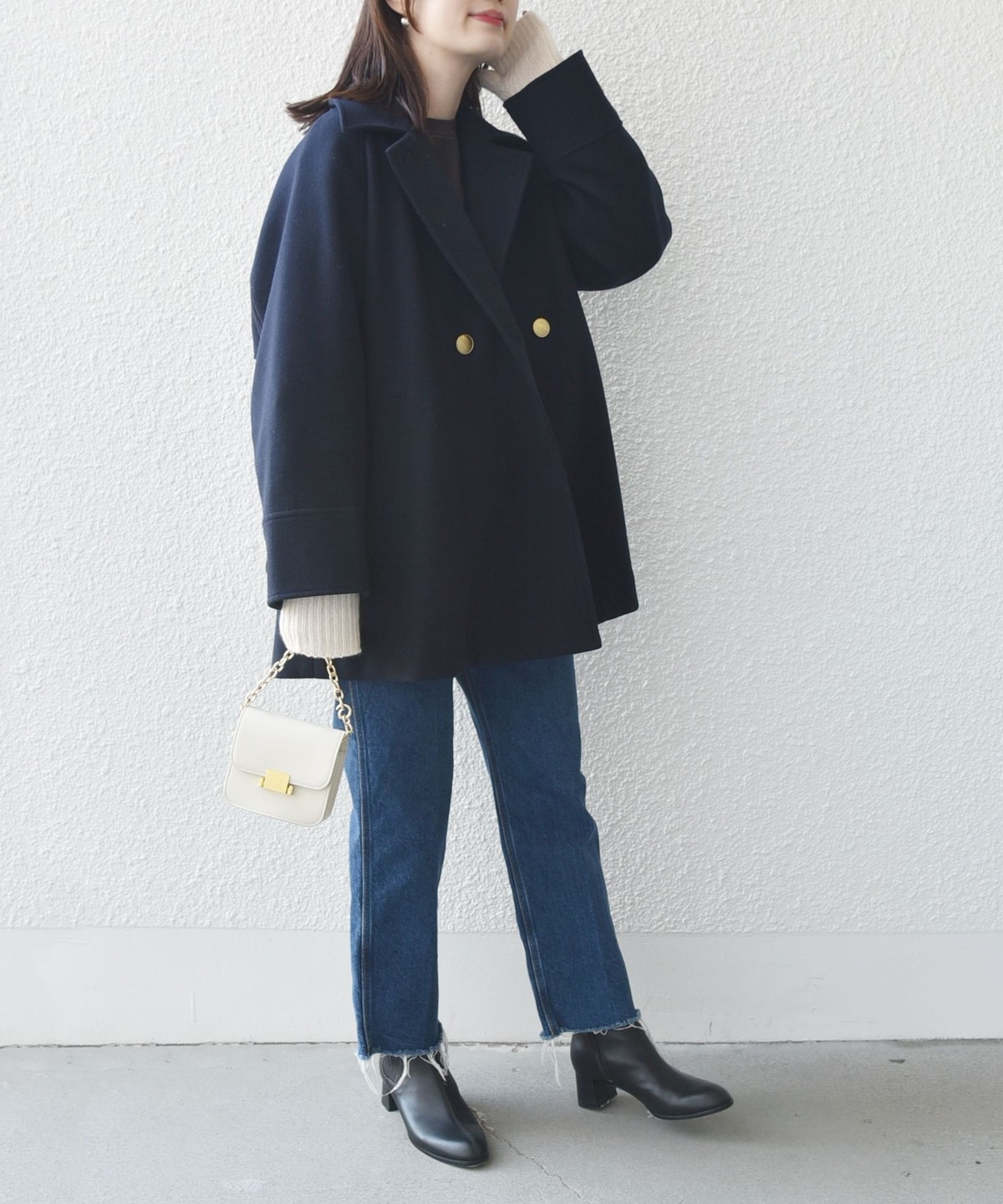 暖かさと着やすさを兼ね備えた、メタルボタンのミディ丈Pコート