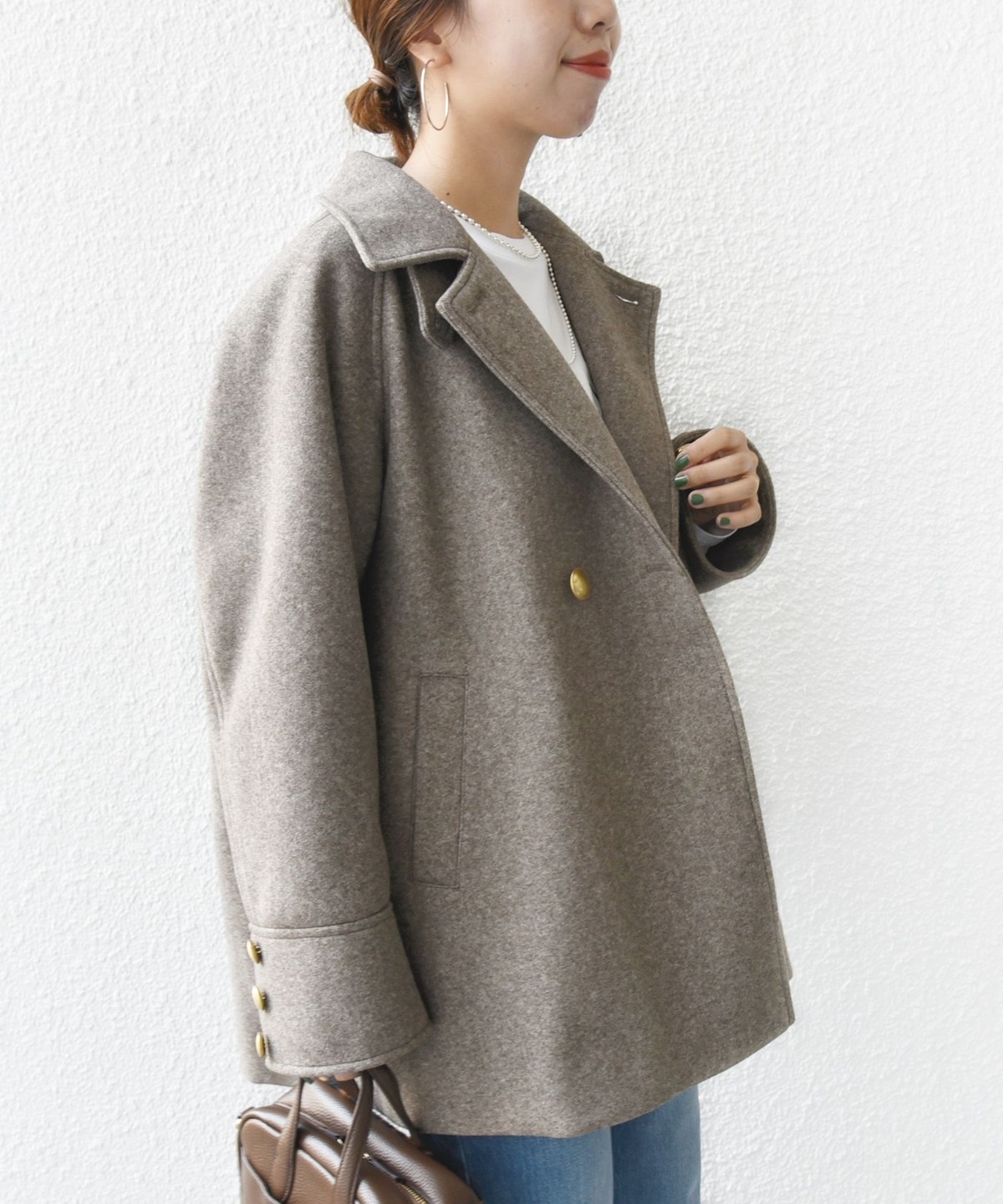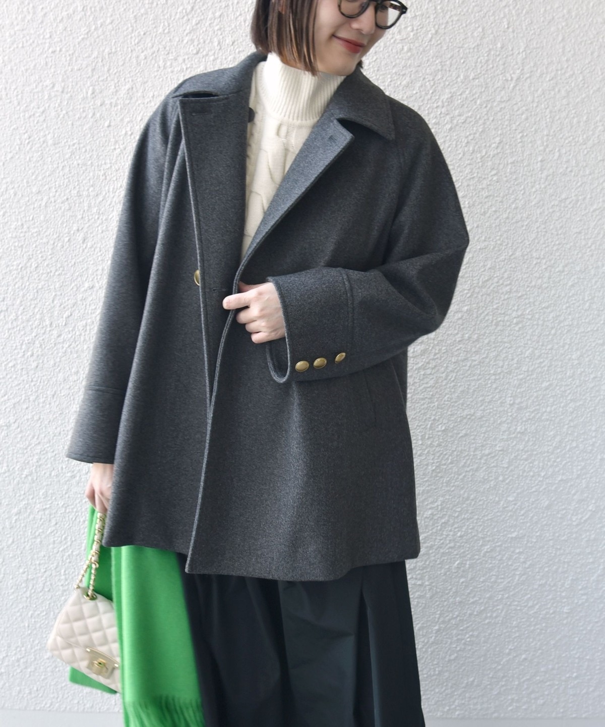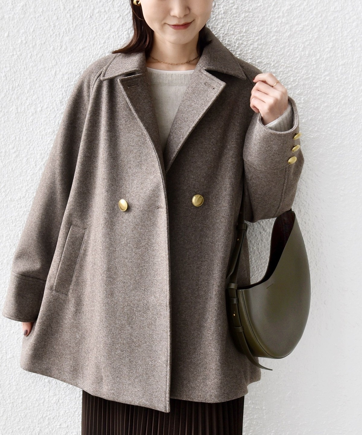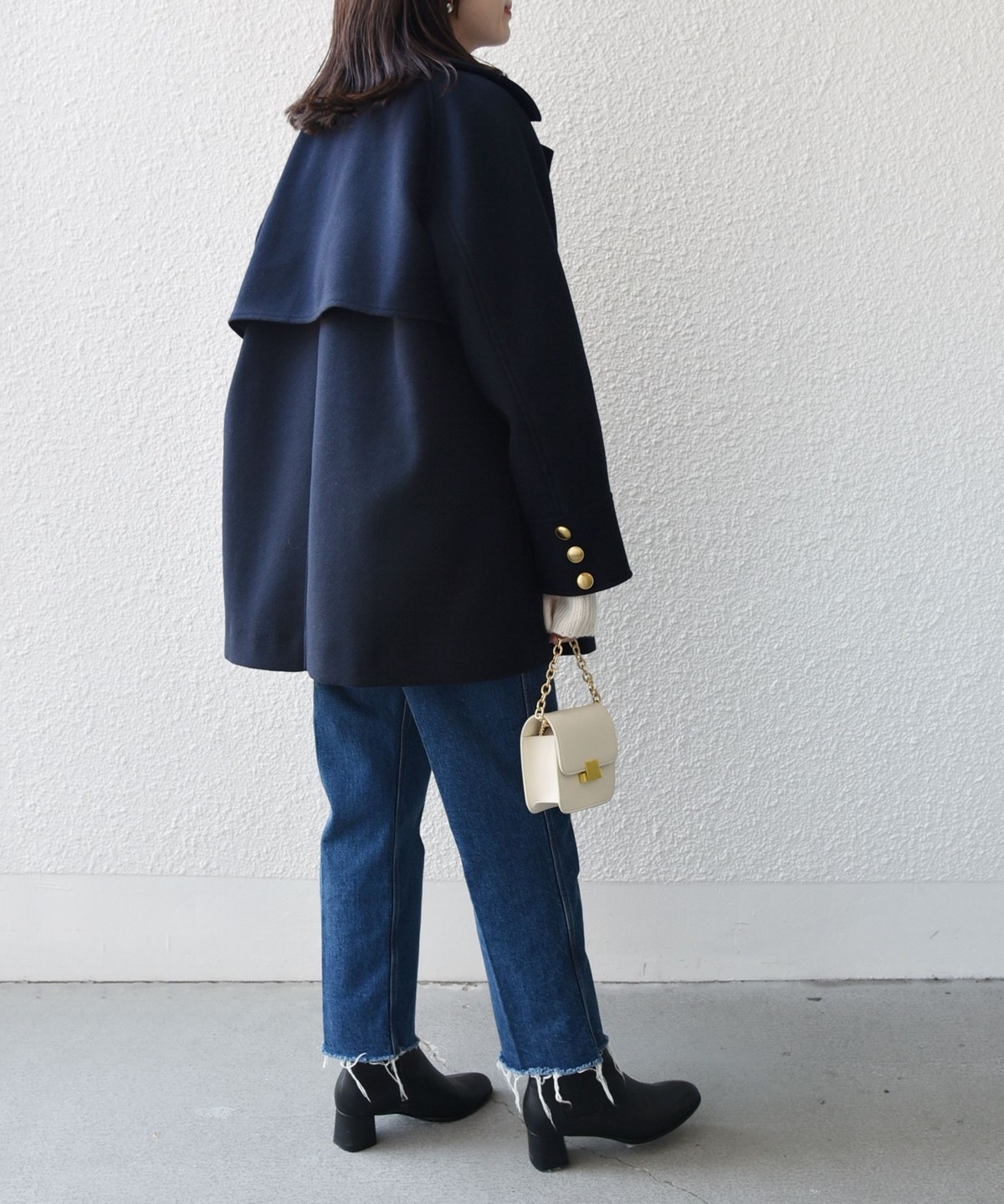 暖かさと着やすさを兼ね備えた、メタルボタンのミディ丈Pコート