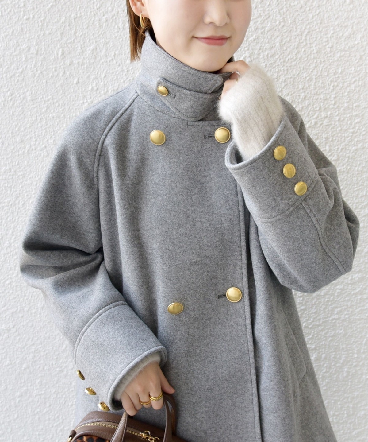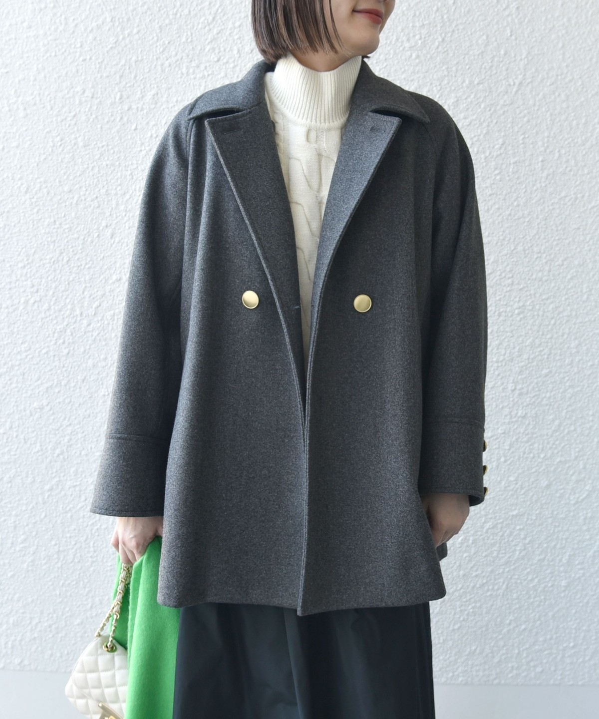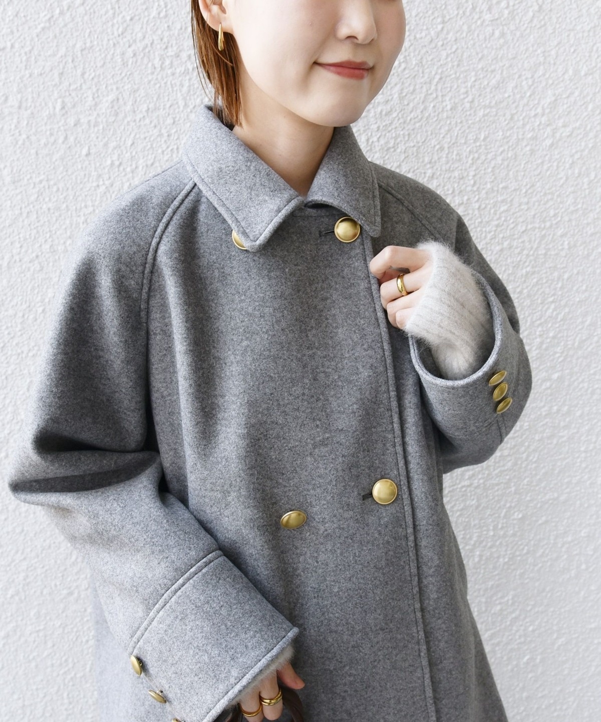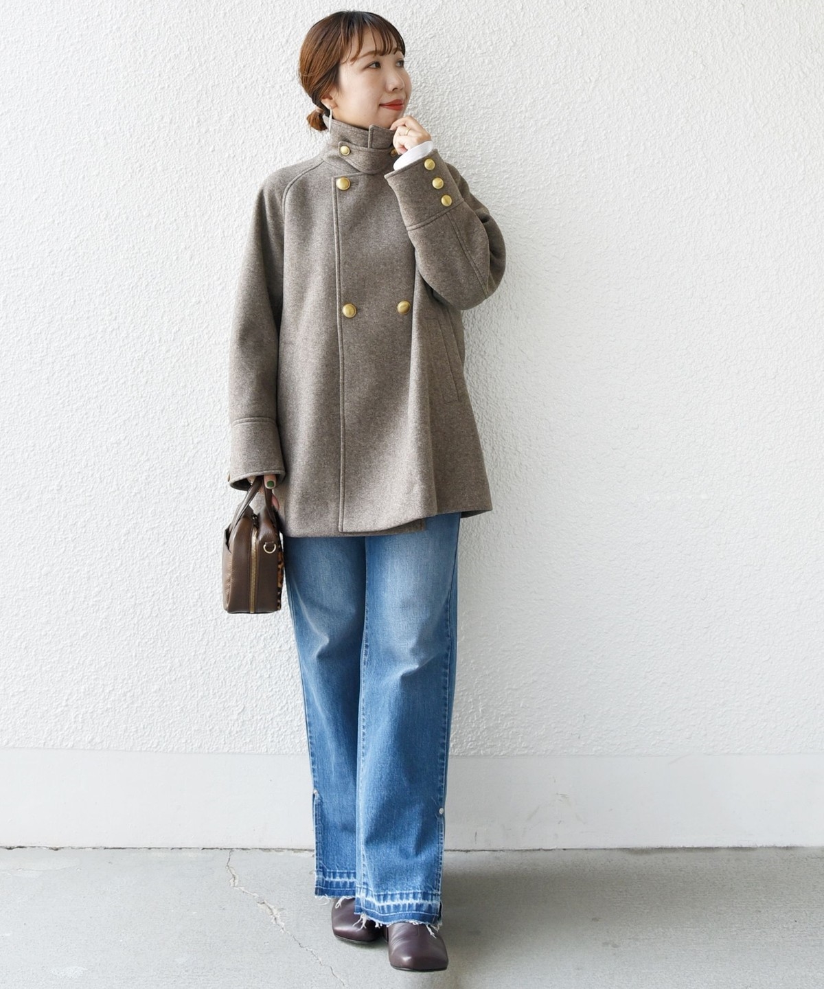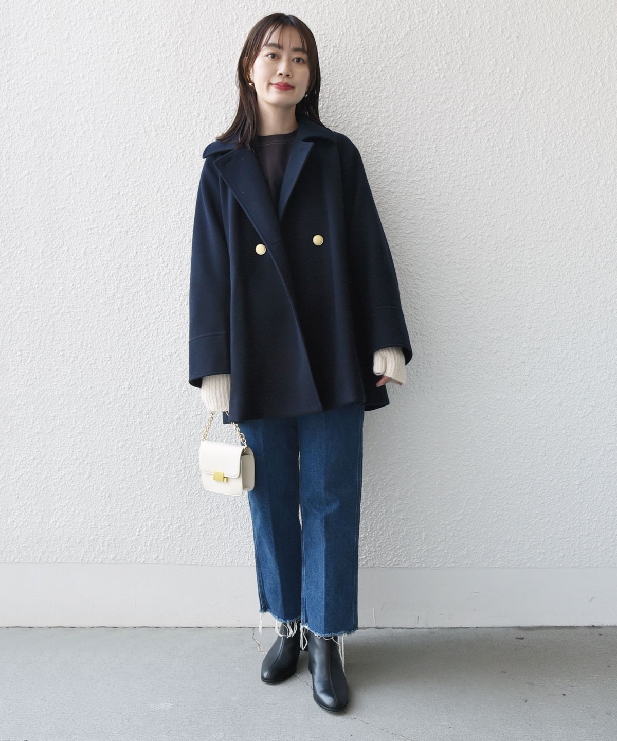 暖かさと着やすさを兼ね備えた、メタルボタンのミディ丈Pコート