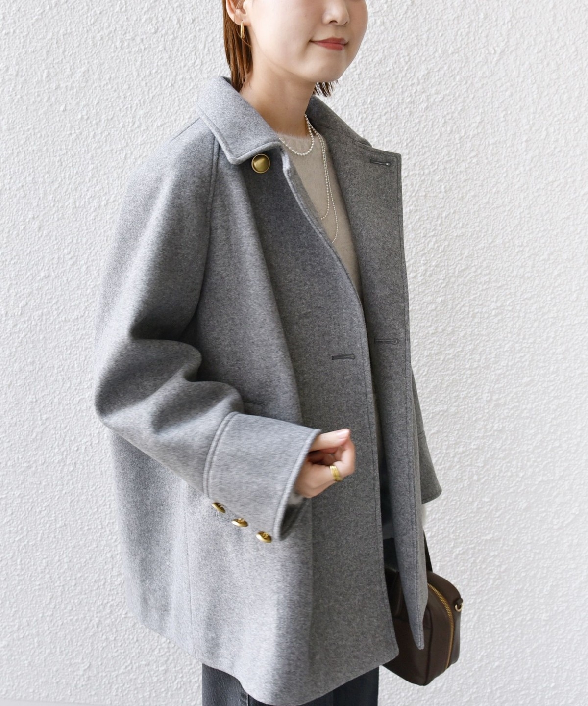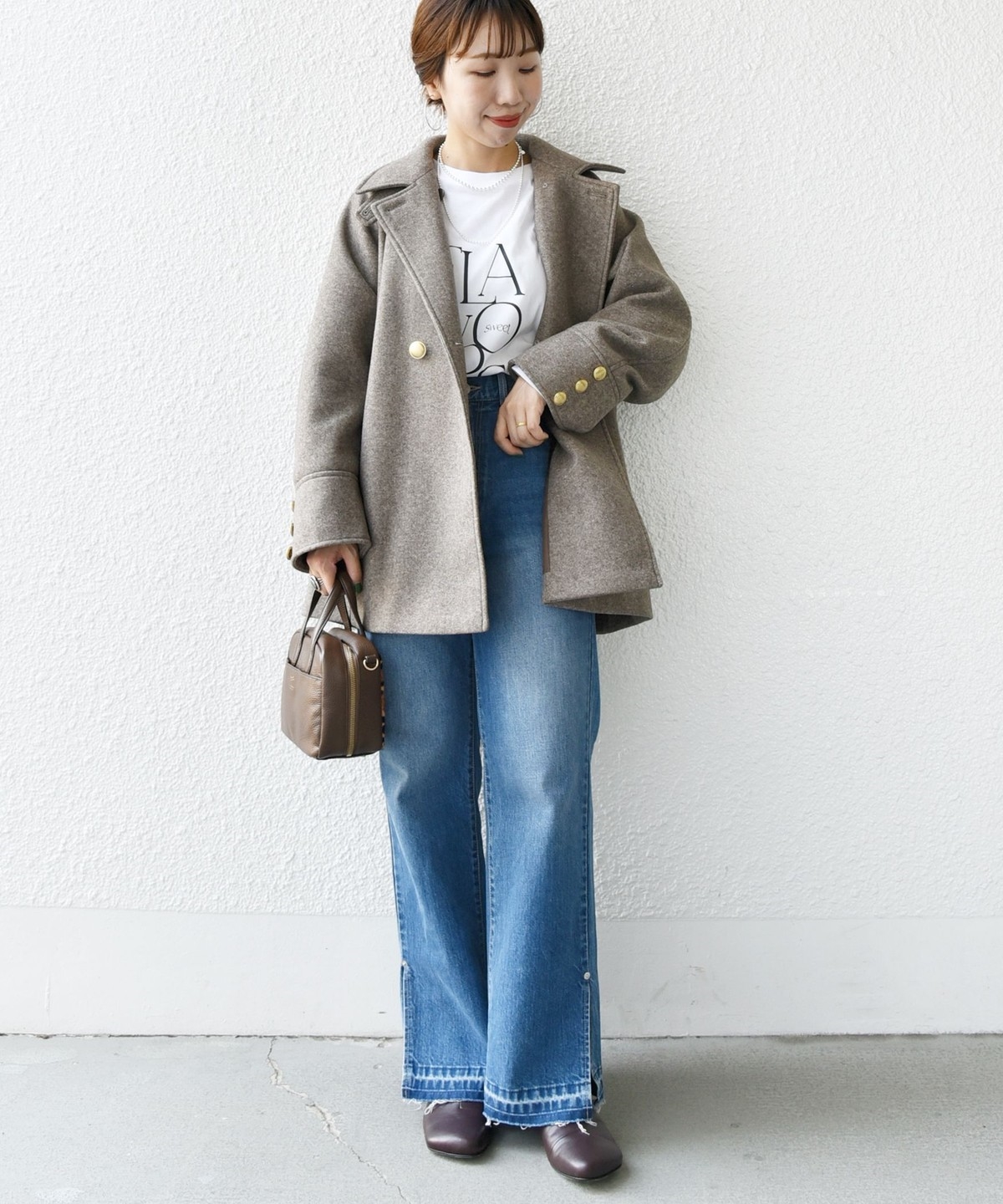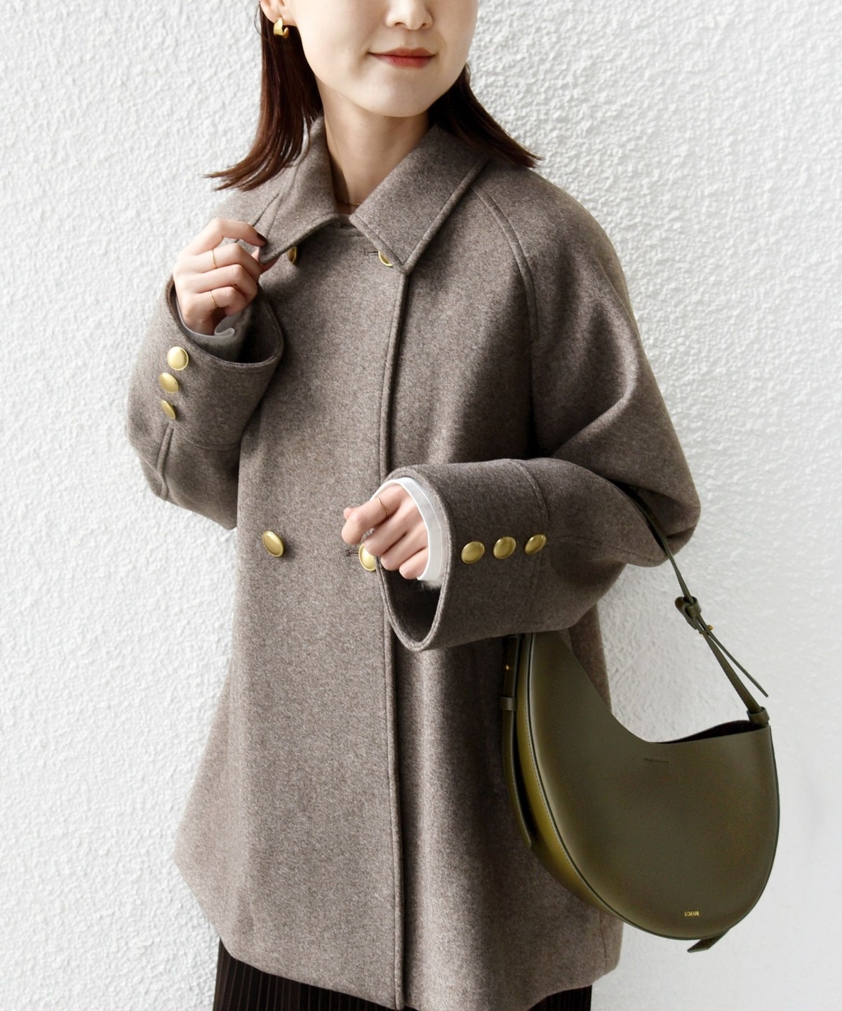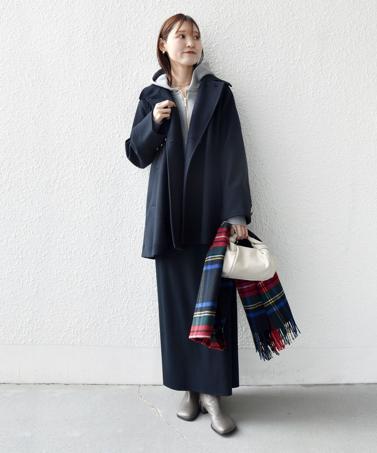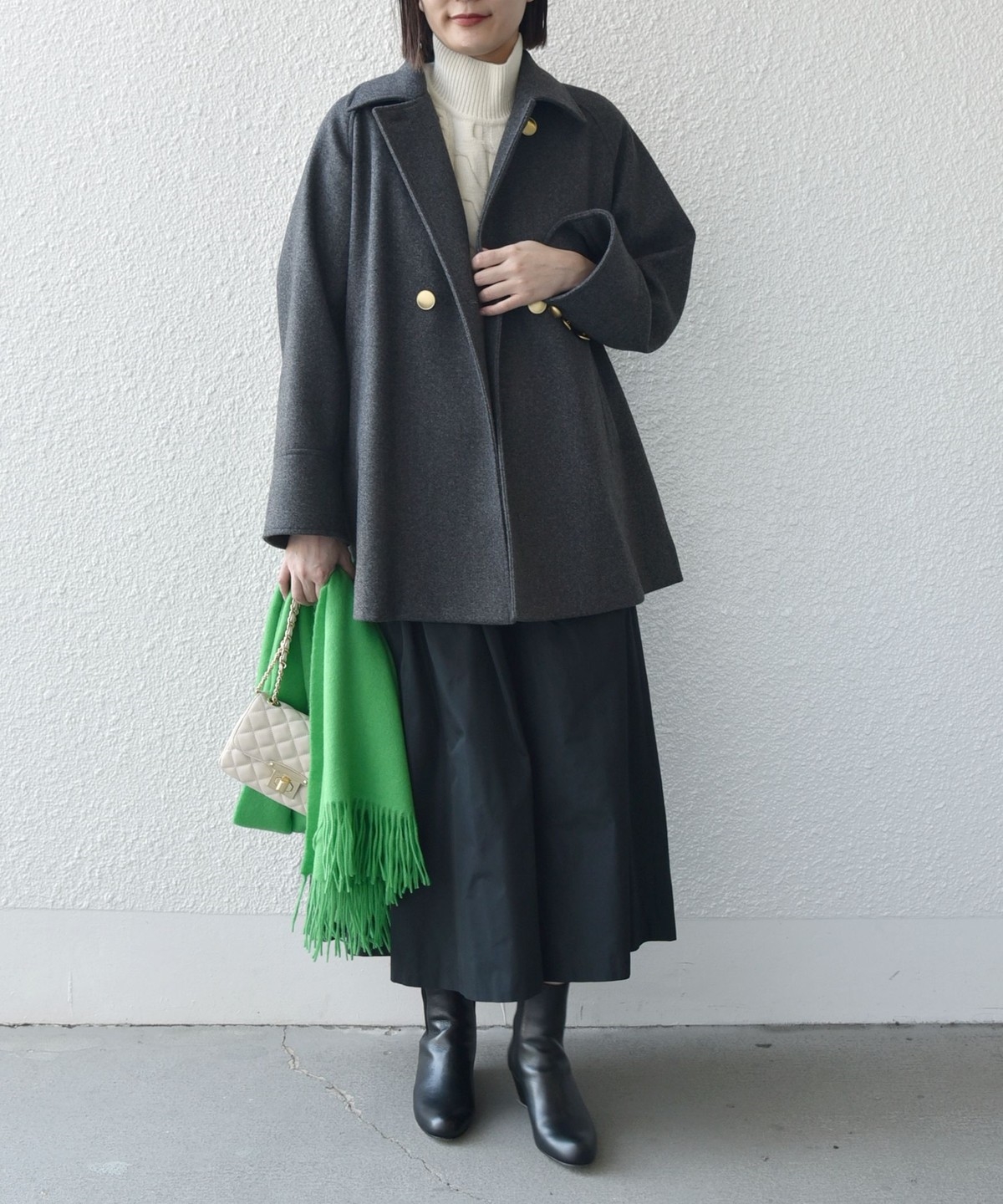 暖かさと着やすさを兼ね備えた、メタルボタンのミディ丈Pコート