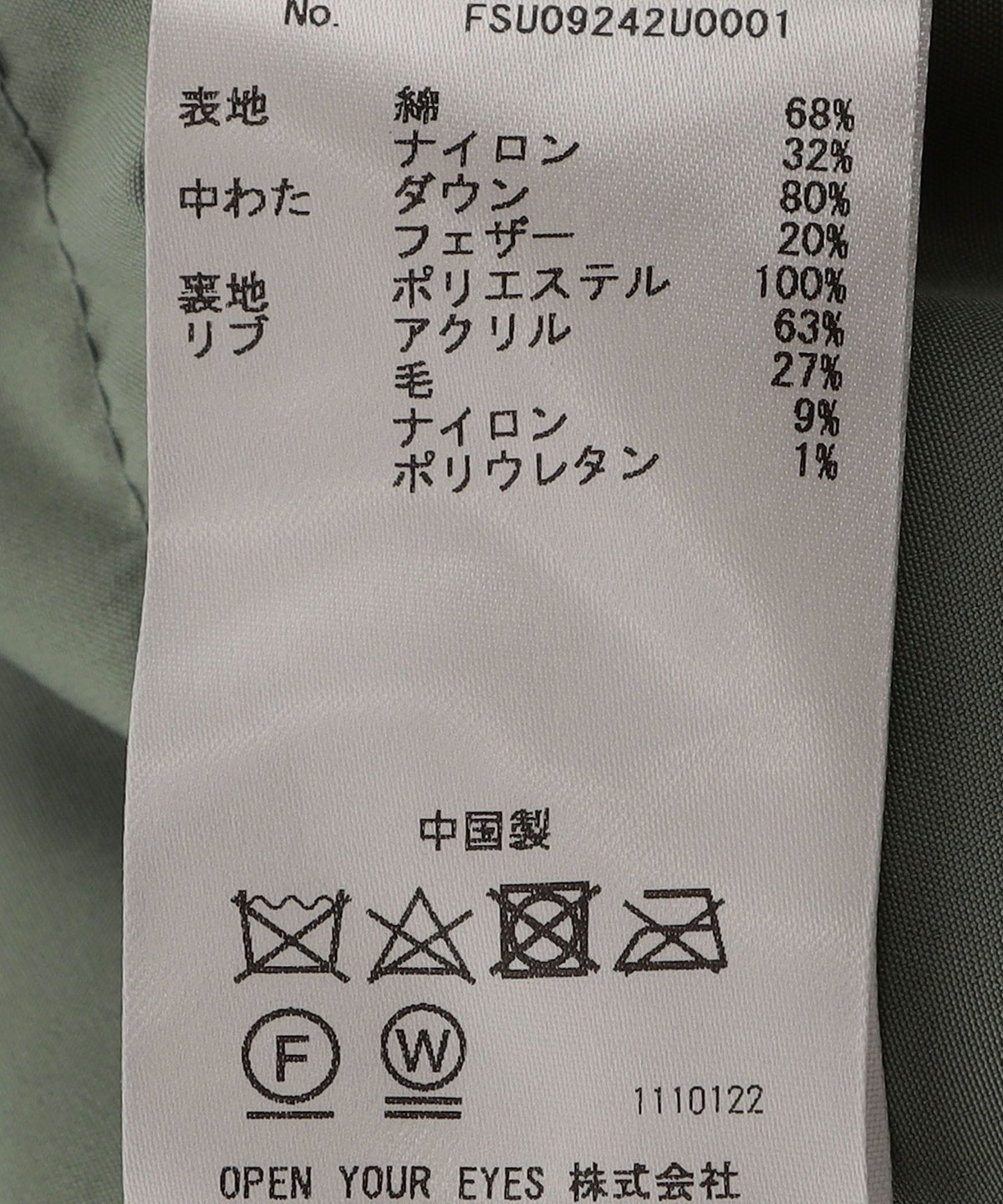 素材:表地: 綿68%, ナイロン32%, 中わた: ダウン80%, フェザー20%, 裏地: ポリエステル100%, リブ: アクリル63%, 毛27%, ナイロン9%, ポリウレタン1%