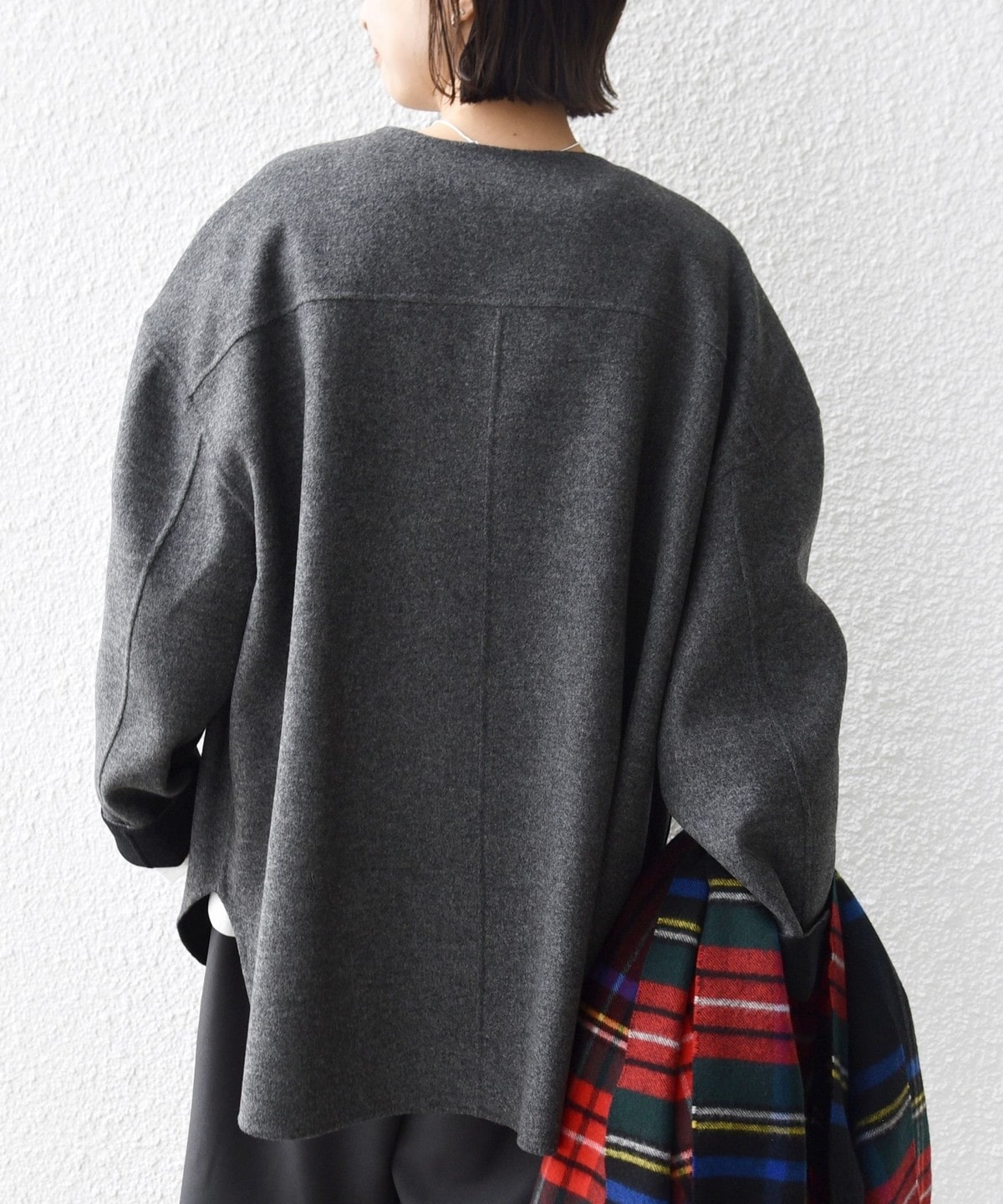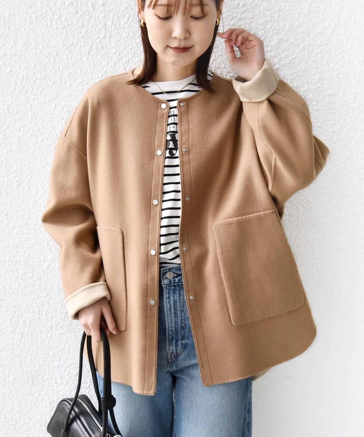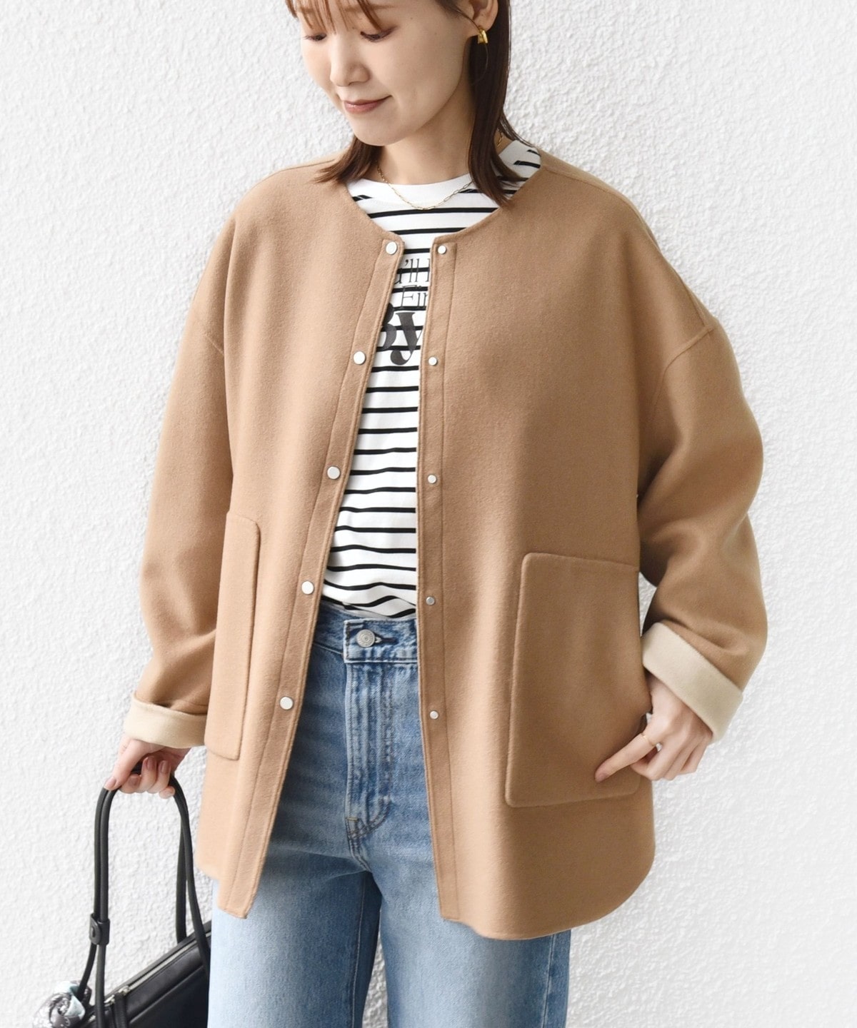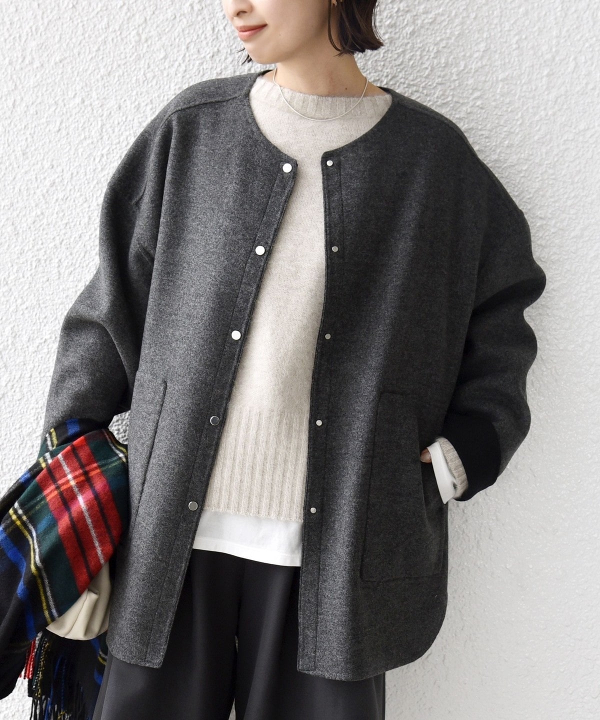 3. セミ 梳毛 配色 リバー ノーカラー コート
