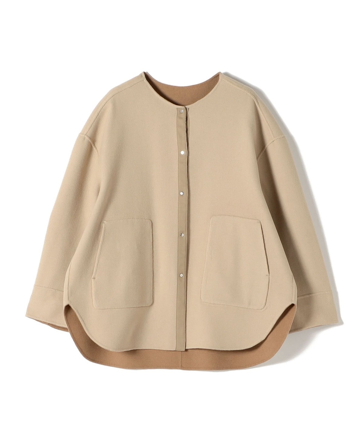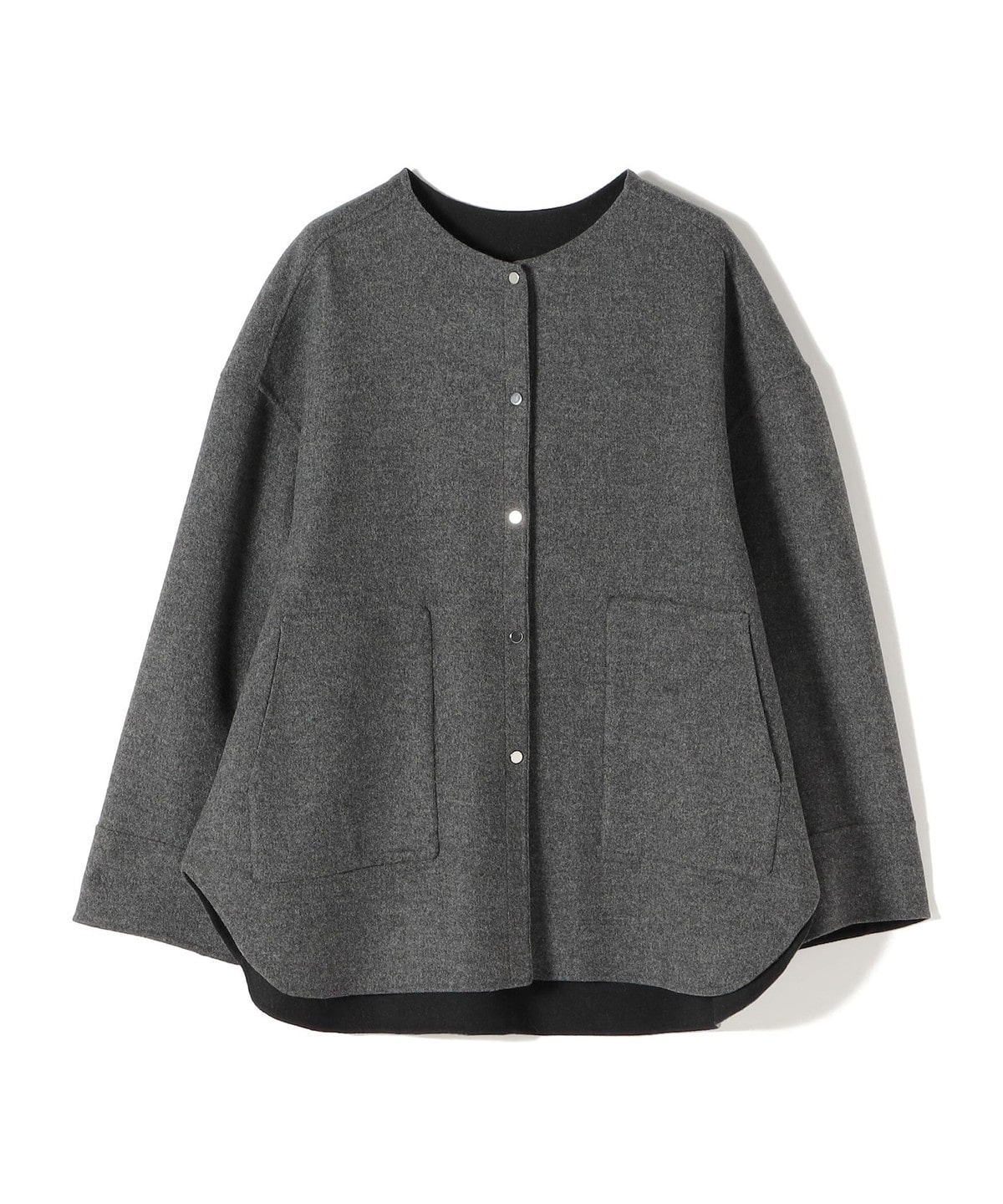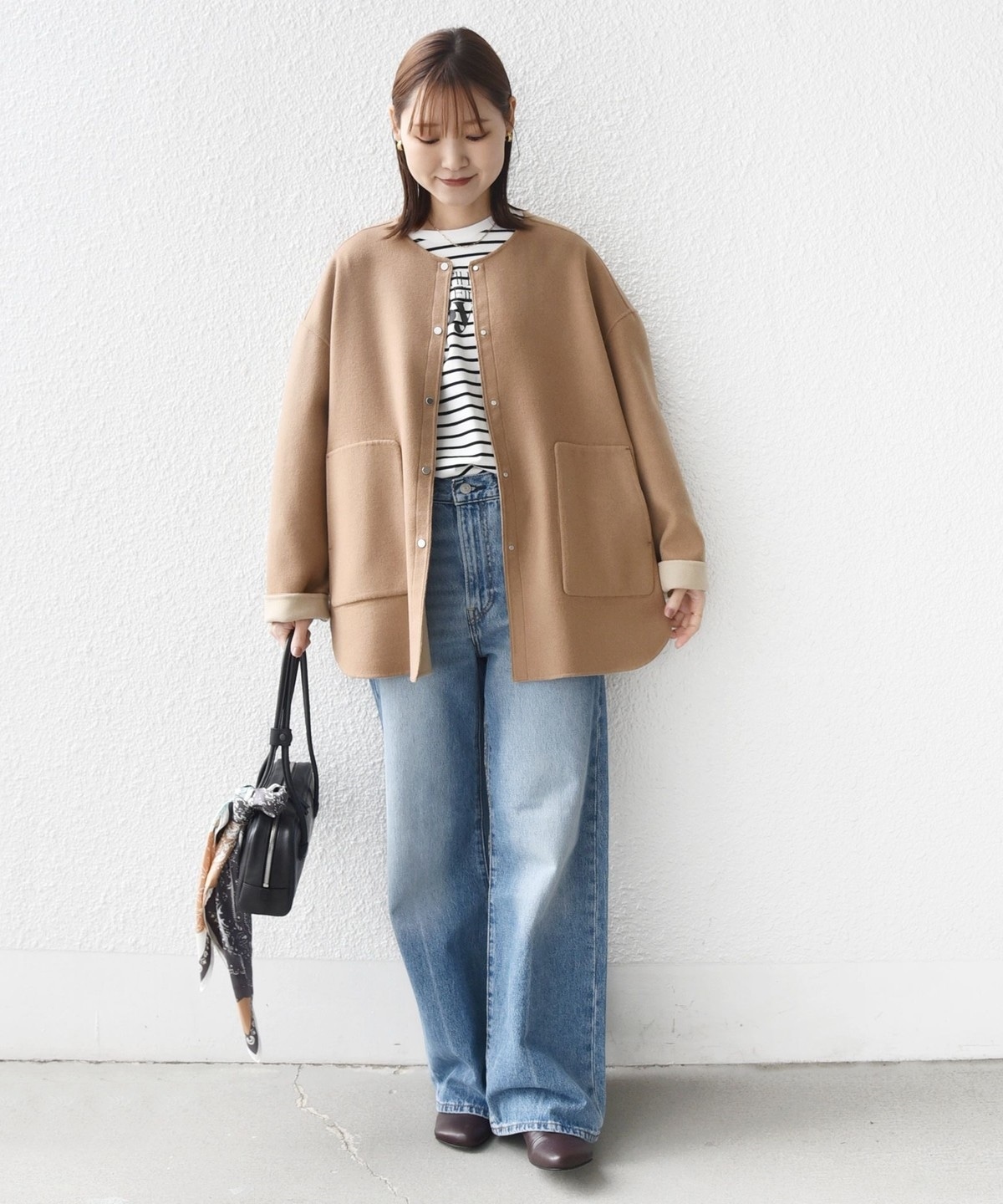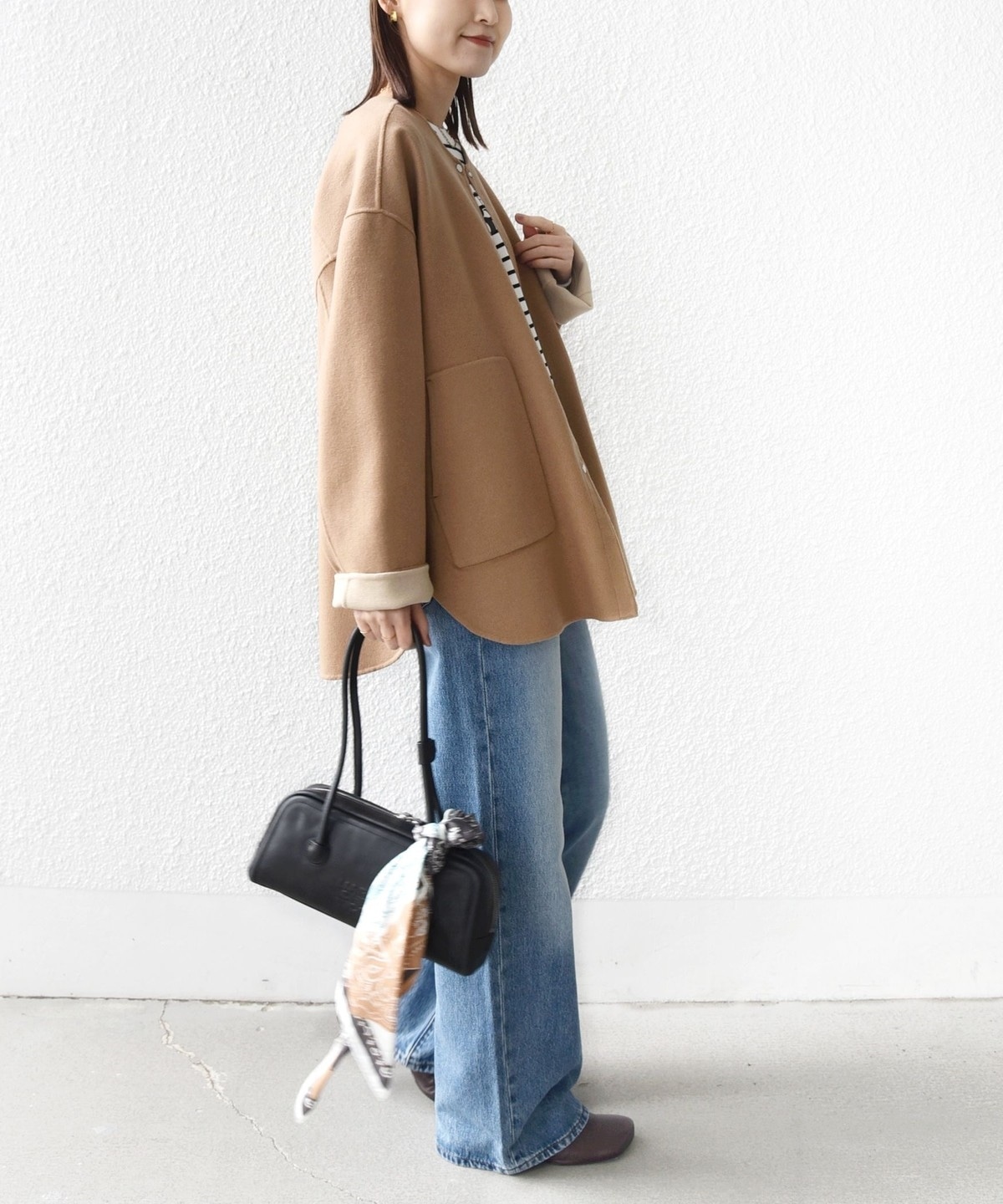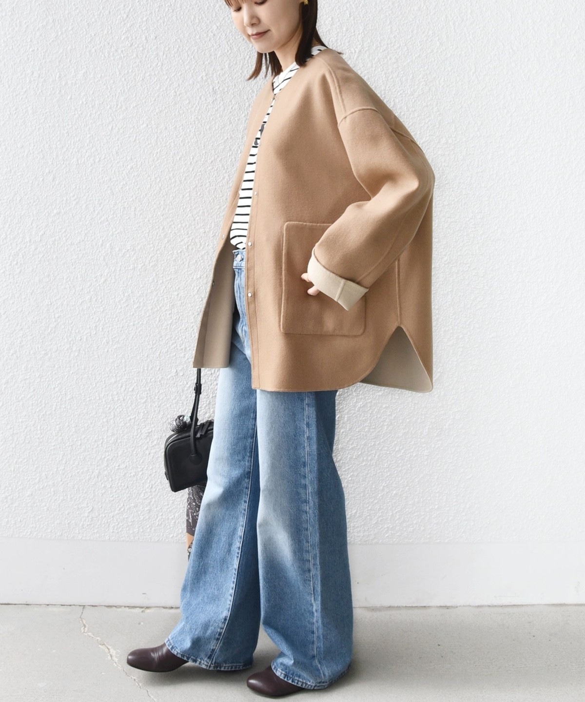 3. セミ 梳毛 配色 リバー ノーカラー コート