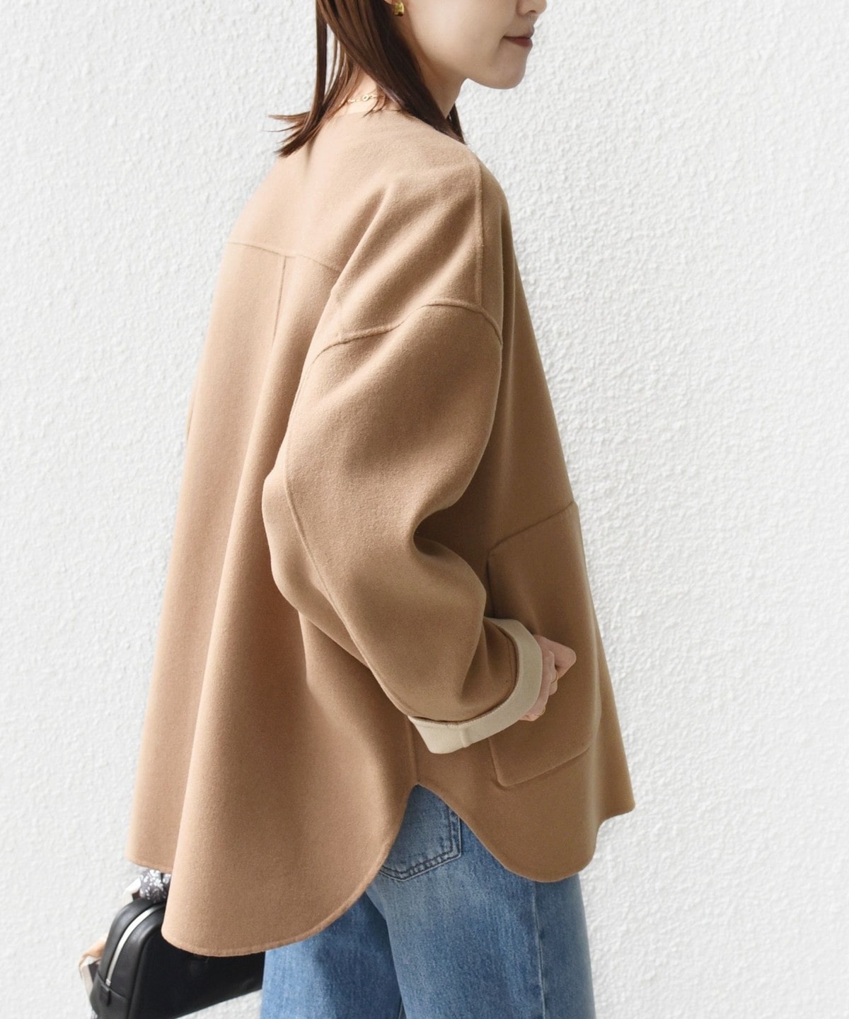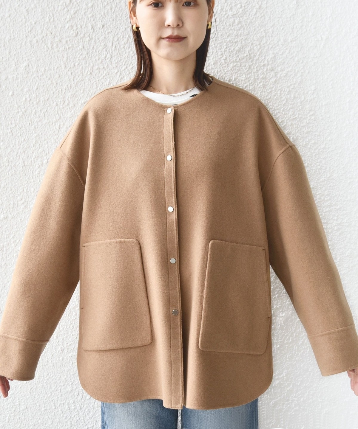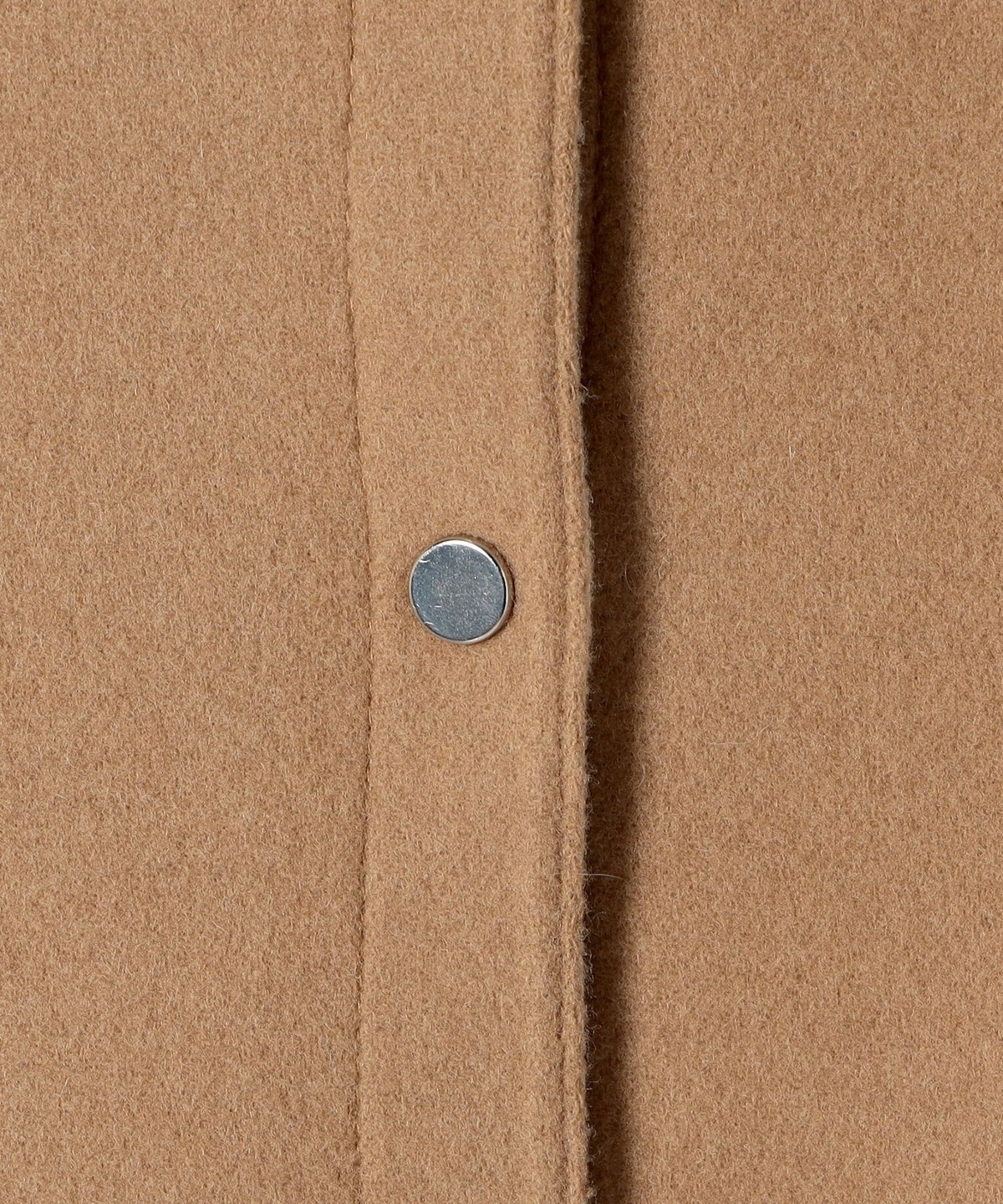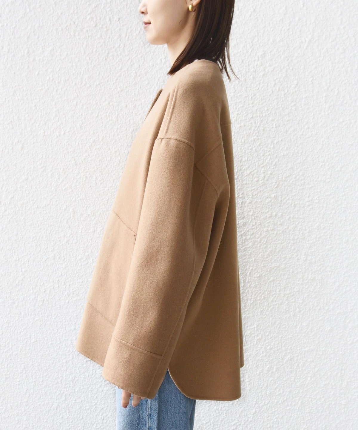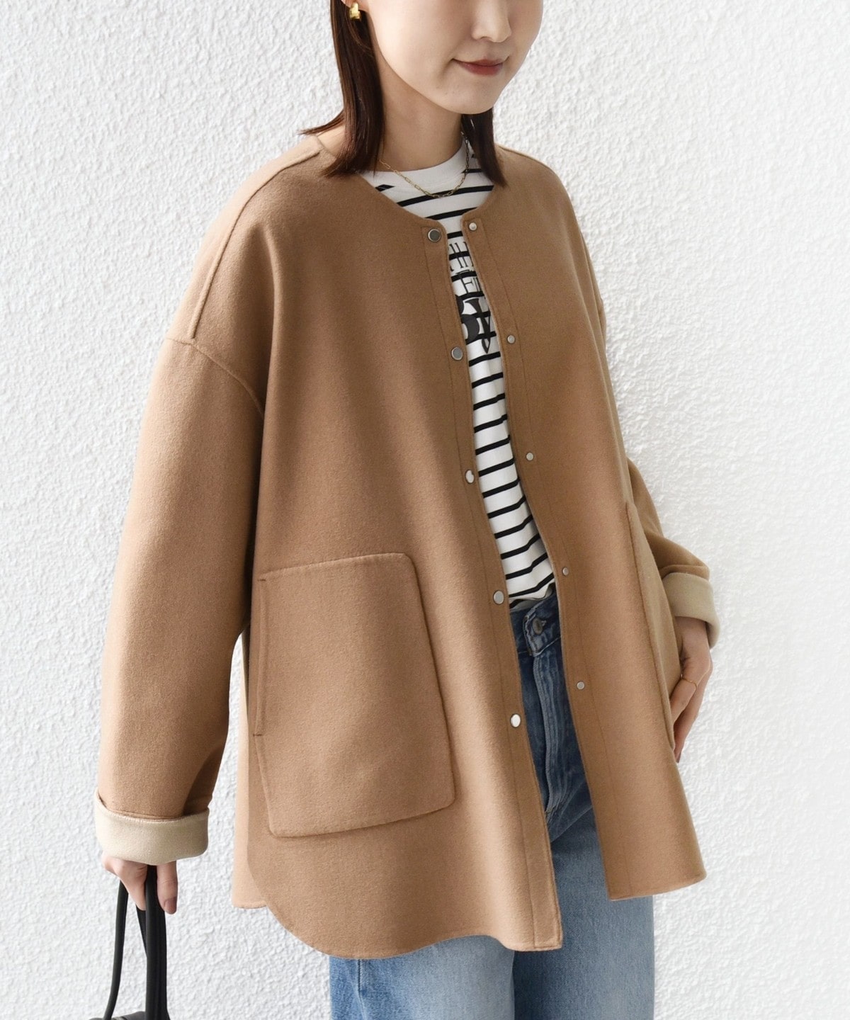 2. セミ 梳毛 配色 リバー ノーカラー コート キャメル