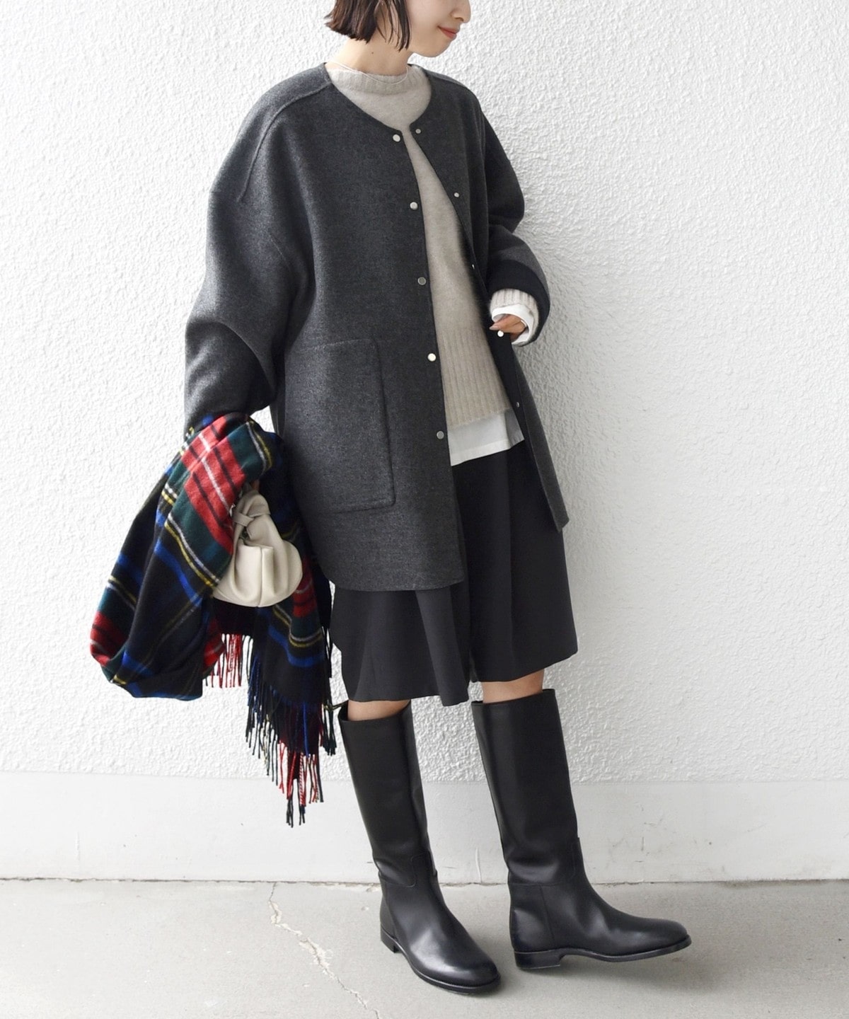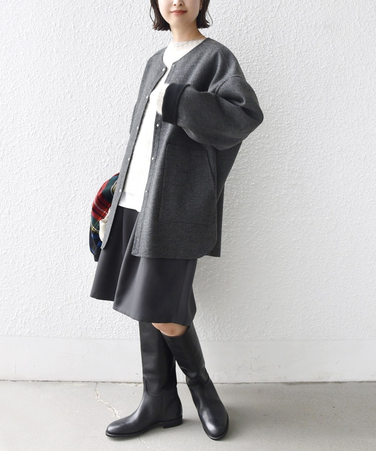 4. セミ 梳毛 配色 リバー ノーカラー コート
