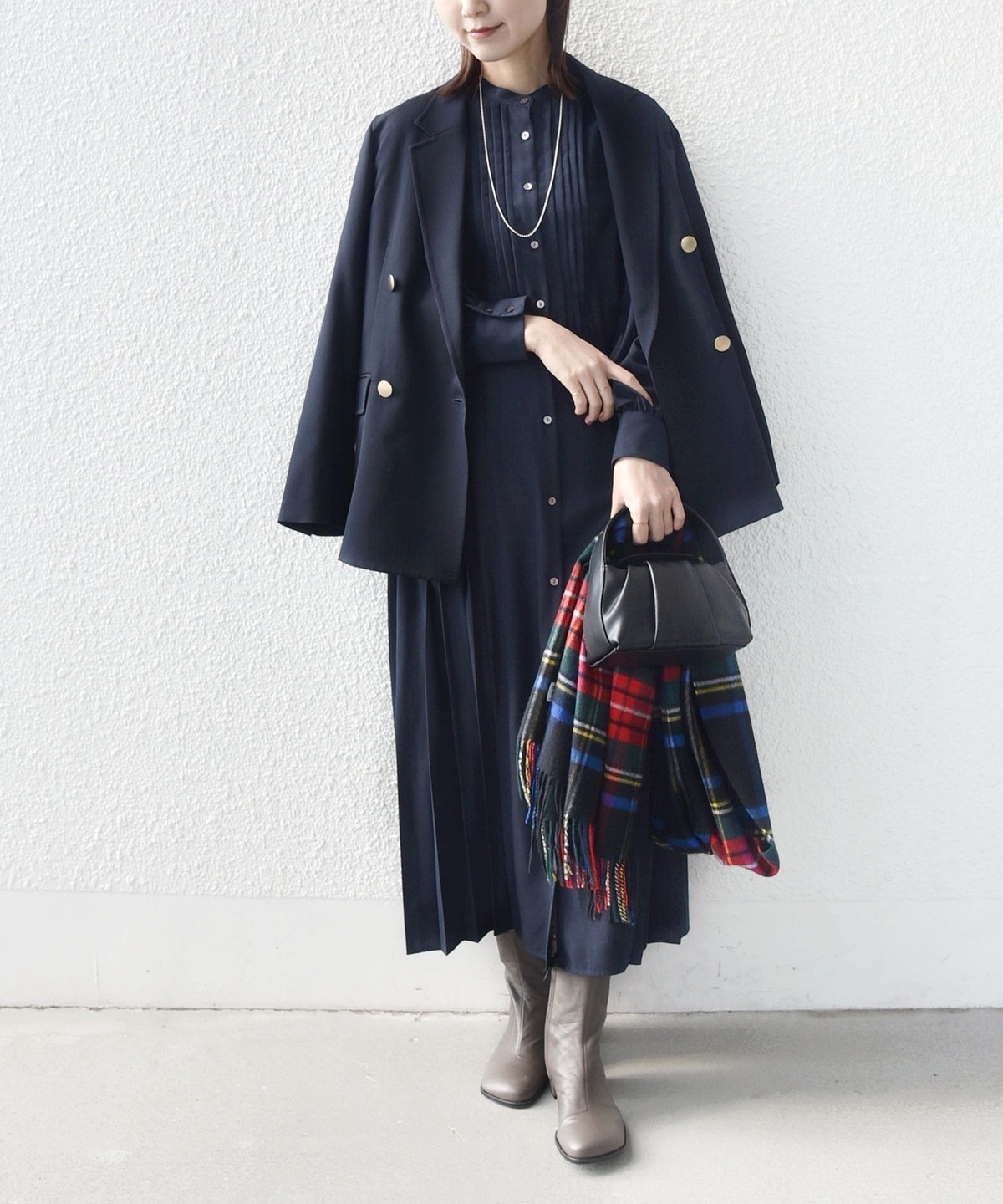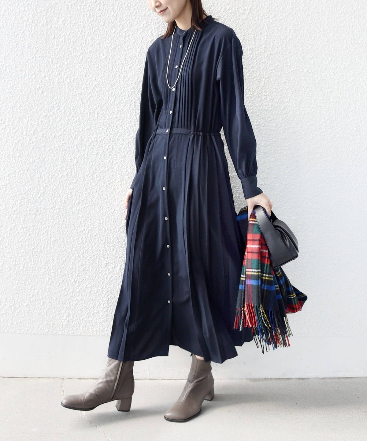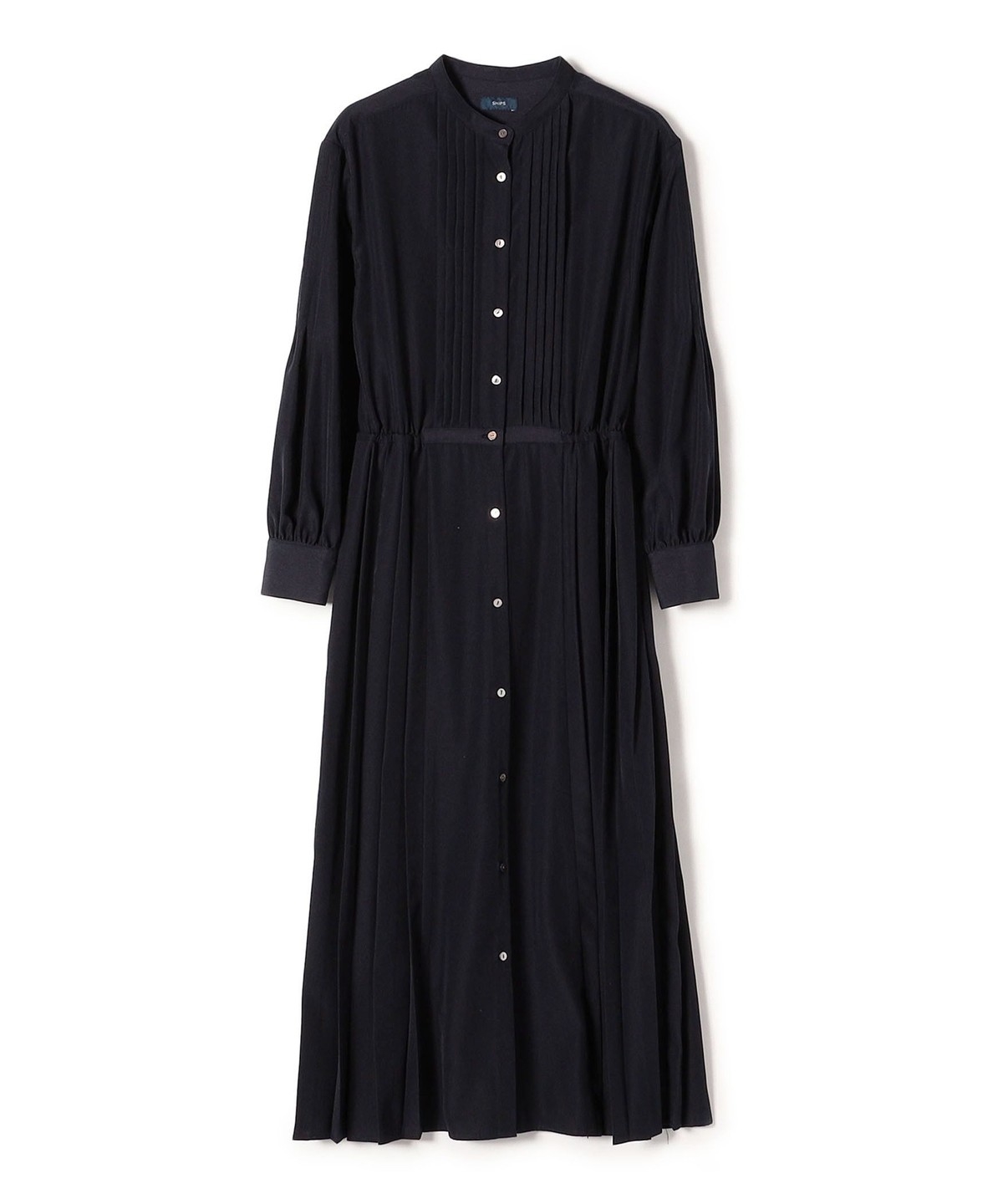 バンドカラーのサイドプリーツワンピースです。