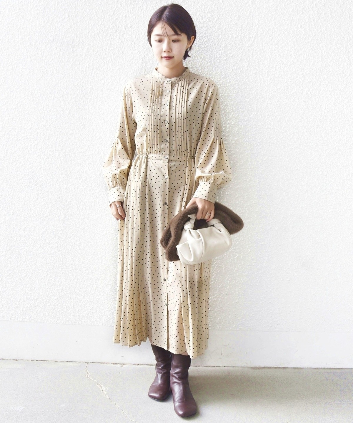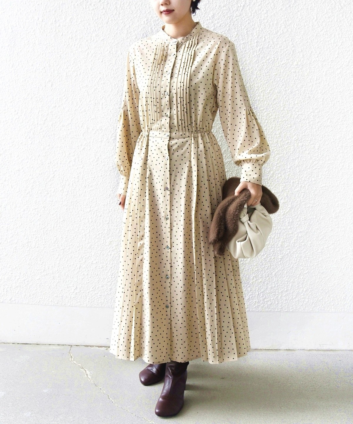 > > >  > 【WEB限定】〈手洗い可能〉ドット / 花柄 バンドカラー サイド プリーツ ワンピース