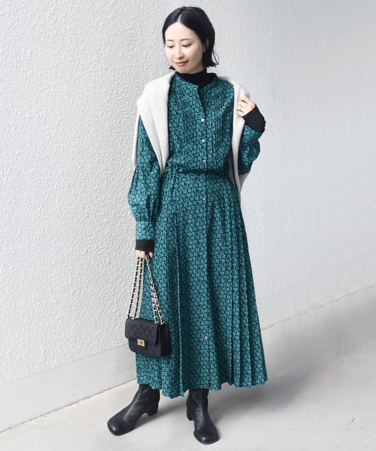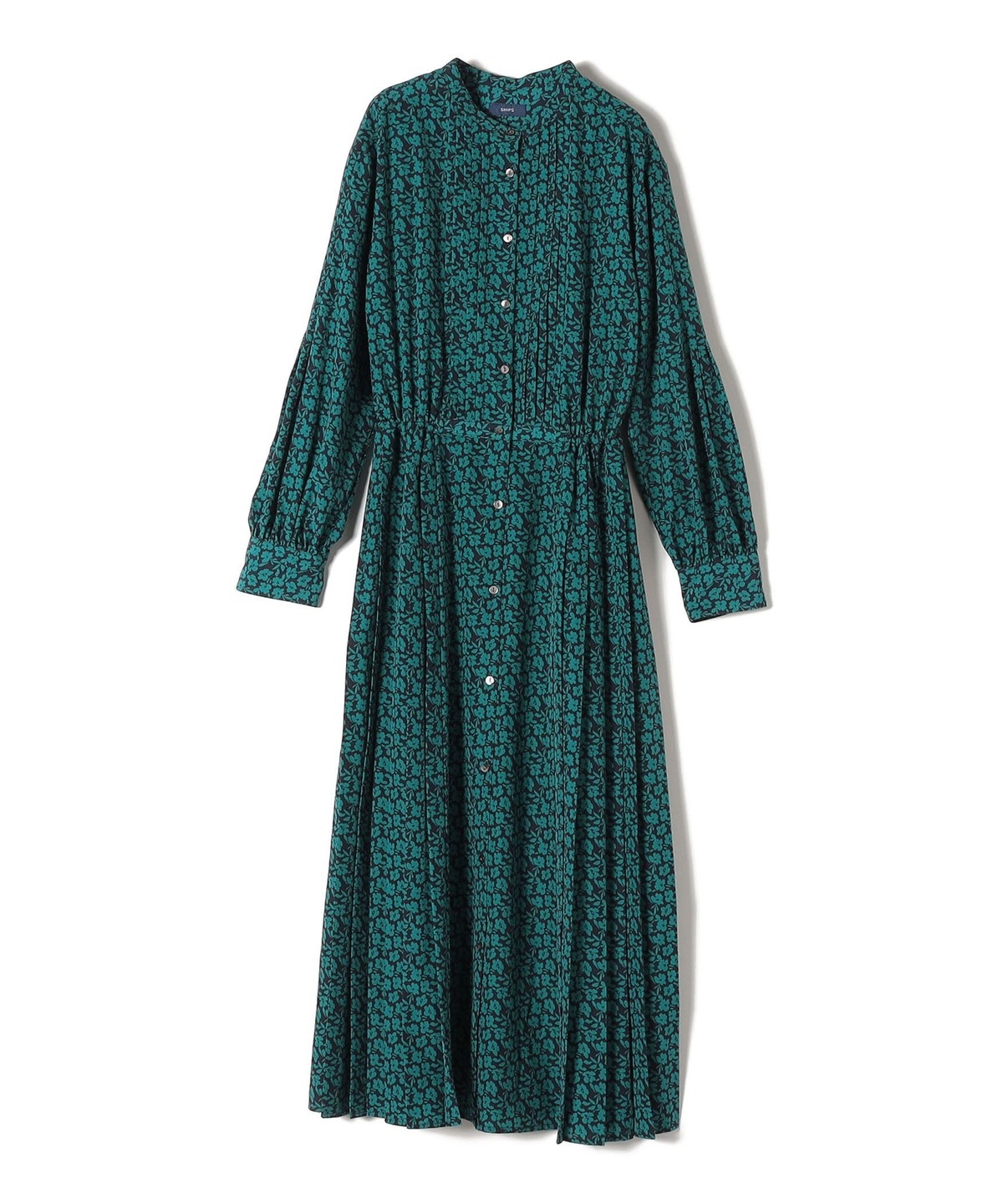 5. 【WEB限定】〈手洗い可能〉ドット / 花柄 バンドカラー サイド プリーツ ワンピース ダークグリーン