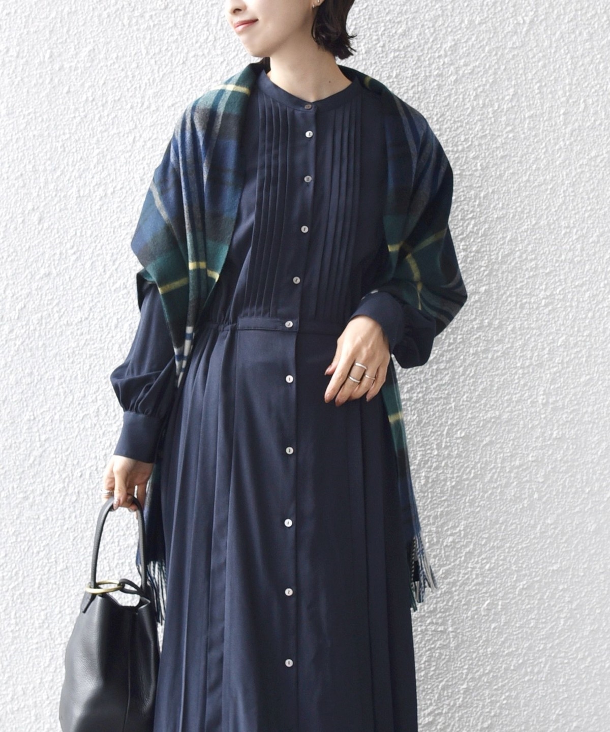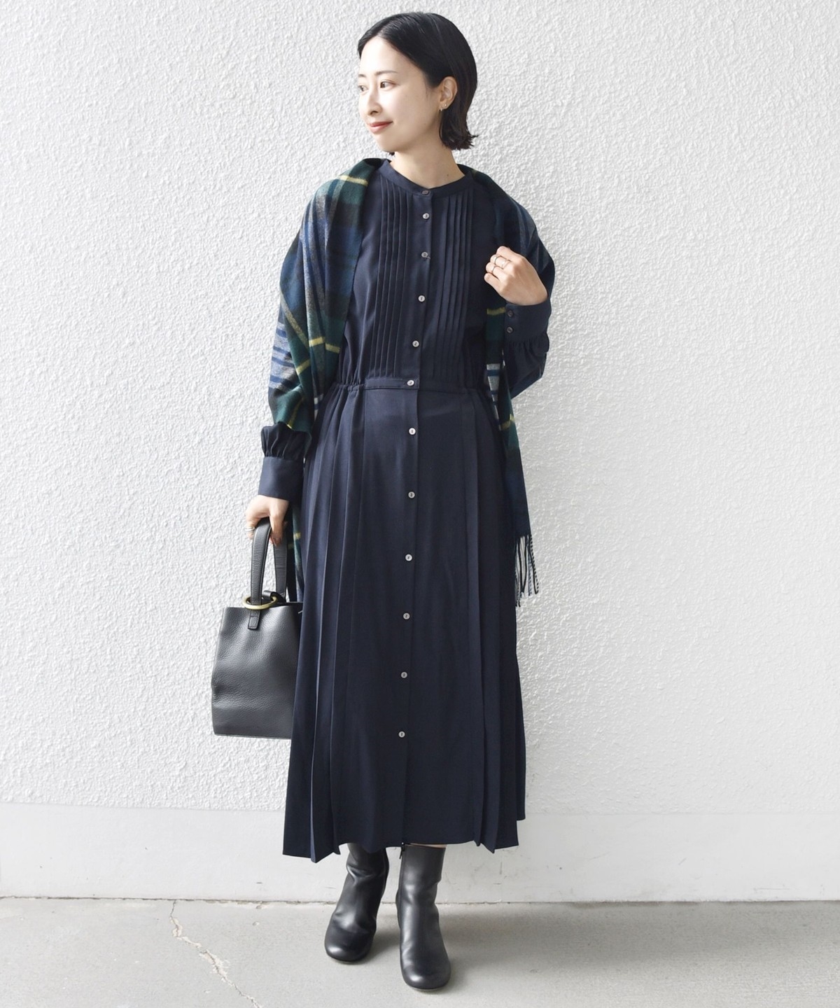 1. 【WEB限定】〈手洗い可能〉ドット / 花柄 バンドカラー サイド プリーツ ワンピース ネイビー