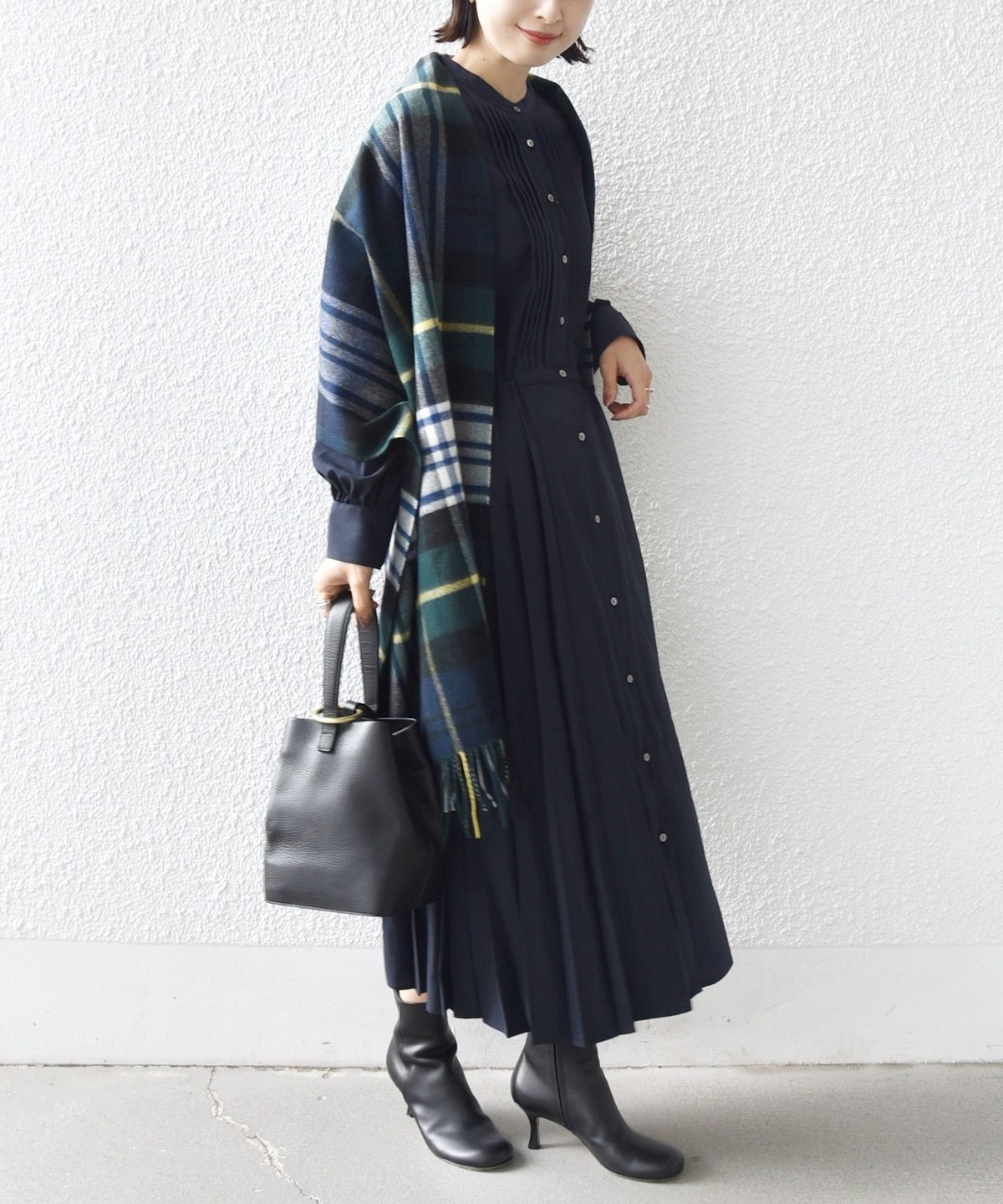 スカート部分には両脇プリーツ加工を施し、程よいボリュームがありながらも、すっきり見えします。