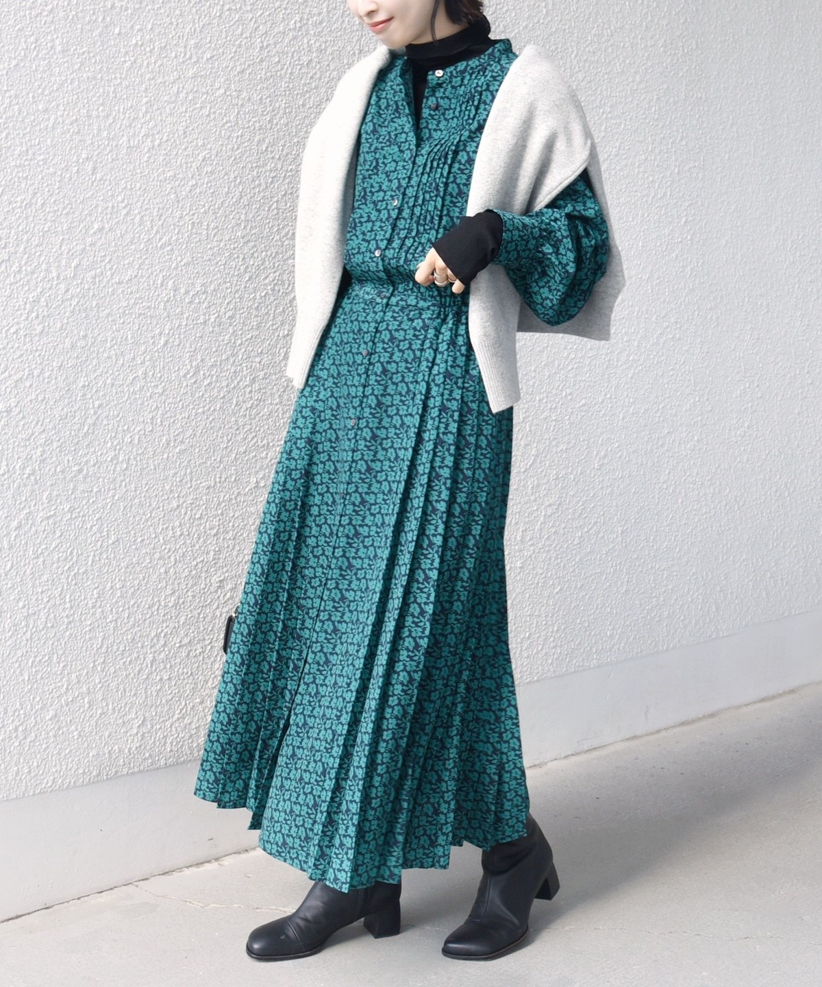 5. 《一部追加予約》【WEB限定】〈手洗い可能〉ドット / 花柄 バンドカラー サイド プリーツ ワンピース ダークグリーン