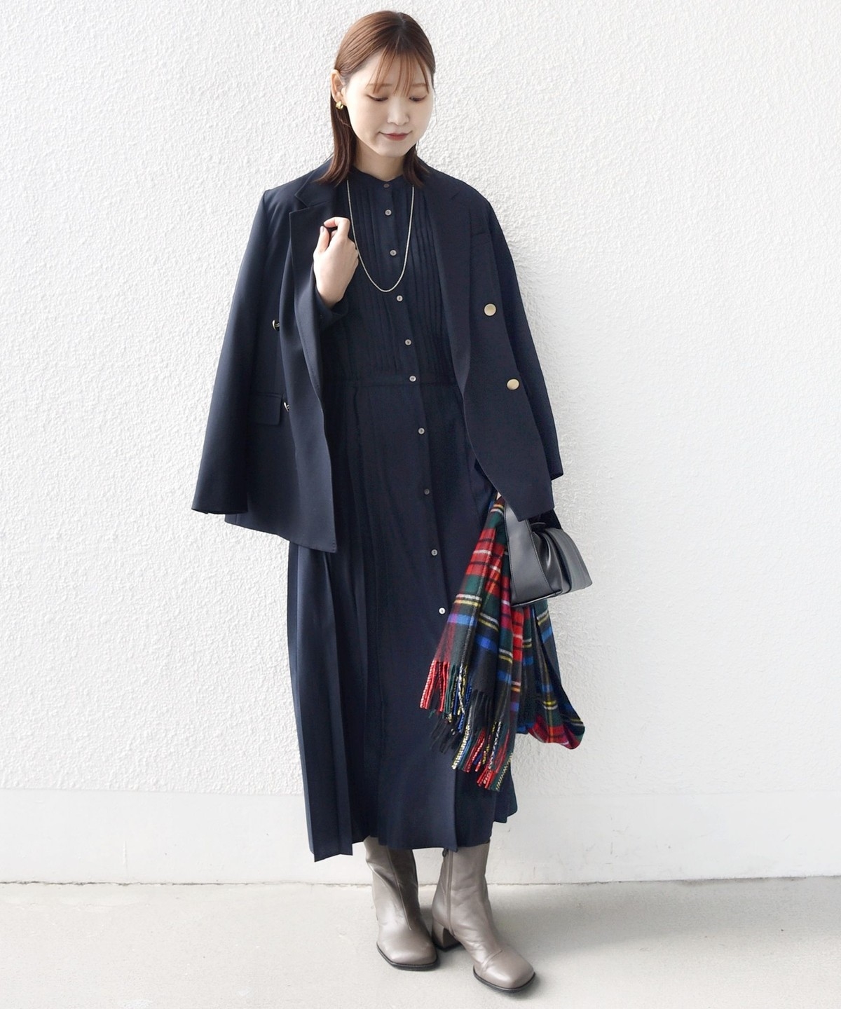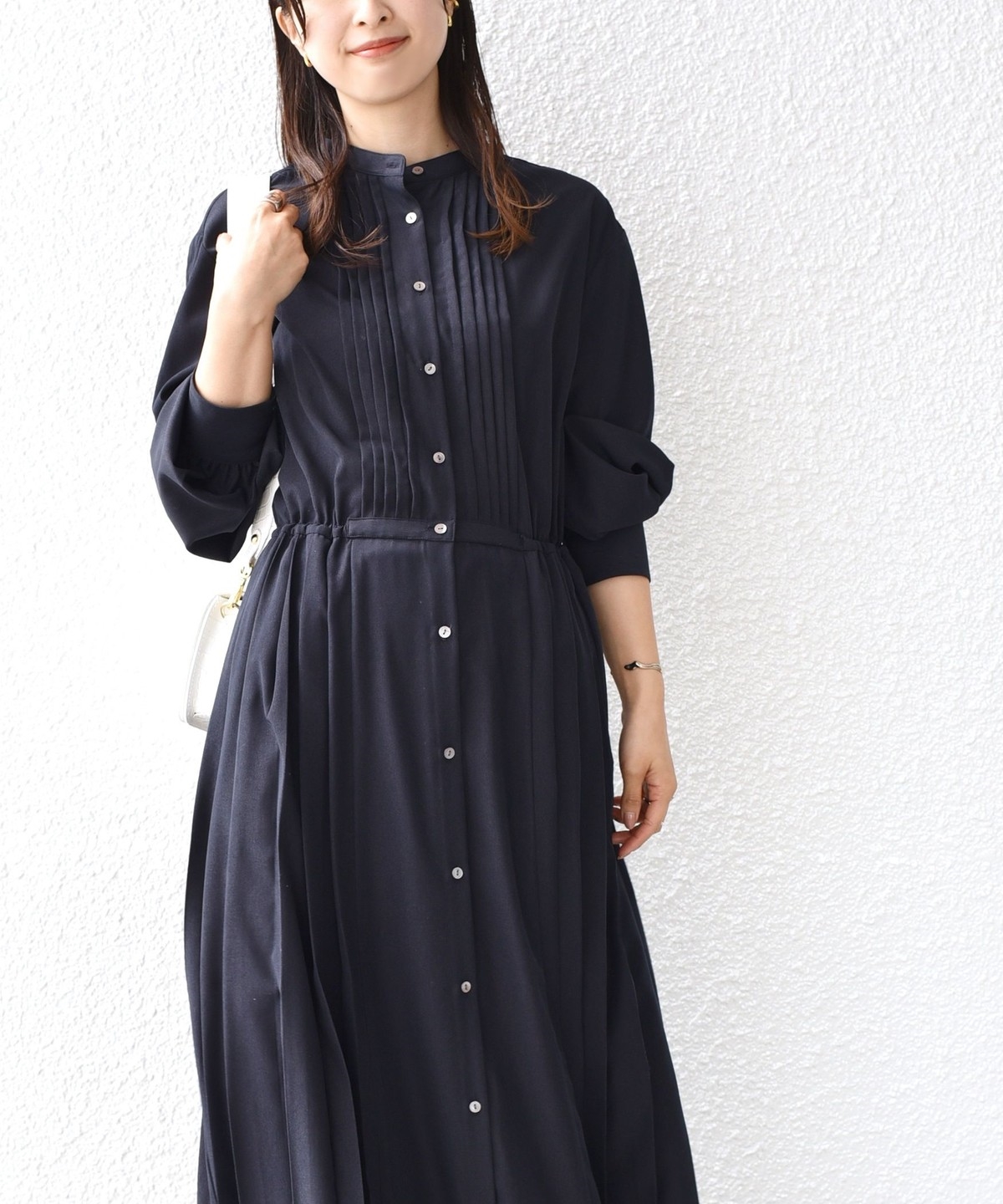 1. 《一部追加予約》【WEB限定】〈手洗い可能〉ドット / 花柄 バンドカラー サイド プリーツ ワンピース ネイビー