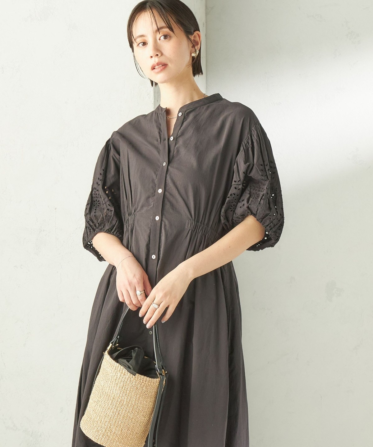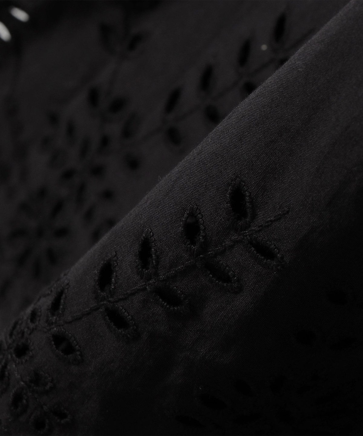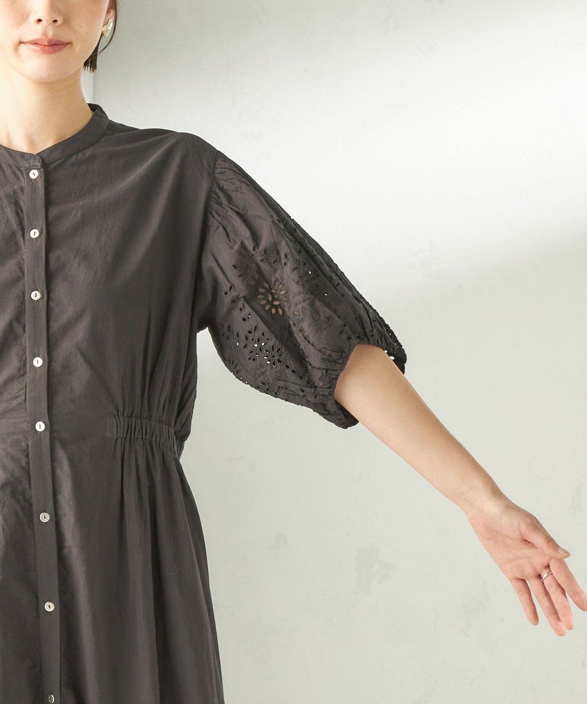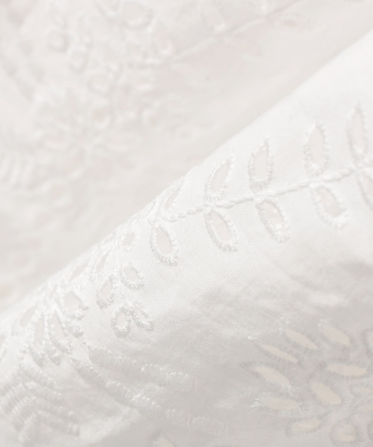 袖口は、ふんわりとしたパフスリーブにアイレット刺繍を施し、二の腕を華奢に見せながらフェミニンな印象。