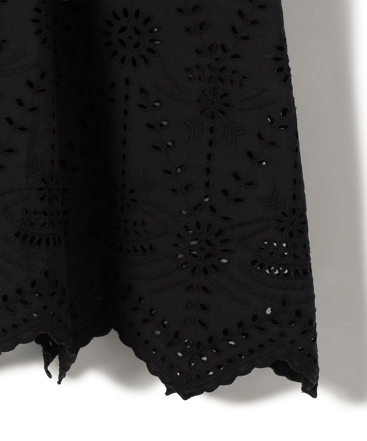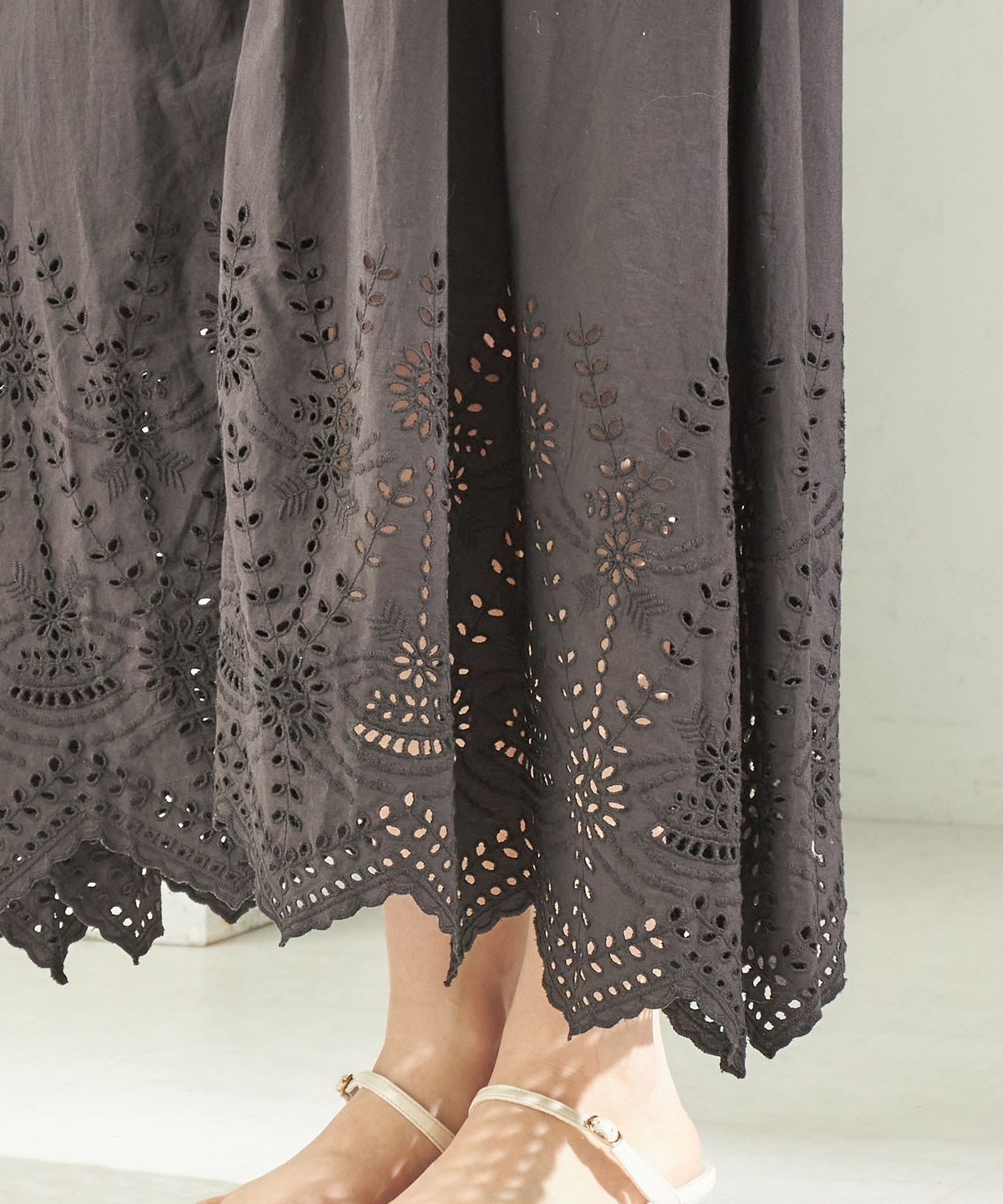 裾は、波打つようなスカラップ刺繍仕上げ。歩くたびに揺れる繊細なディテールが、足元を軽やかにします。