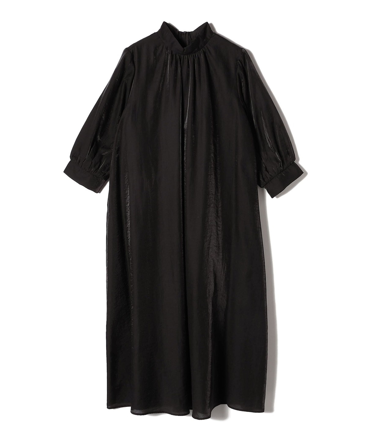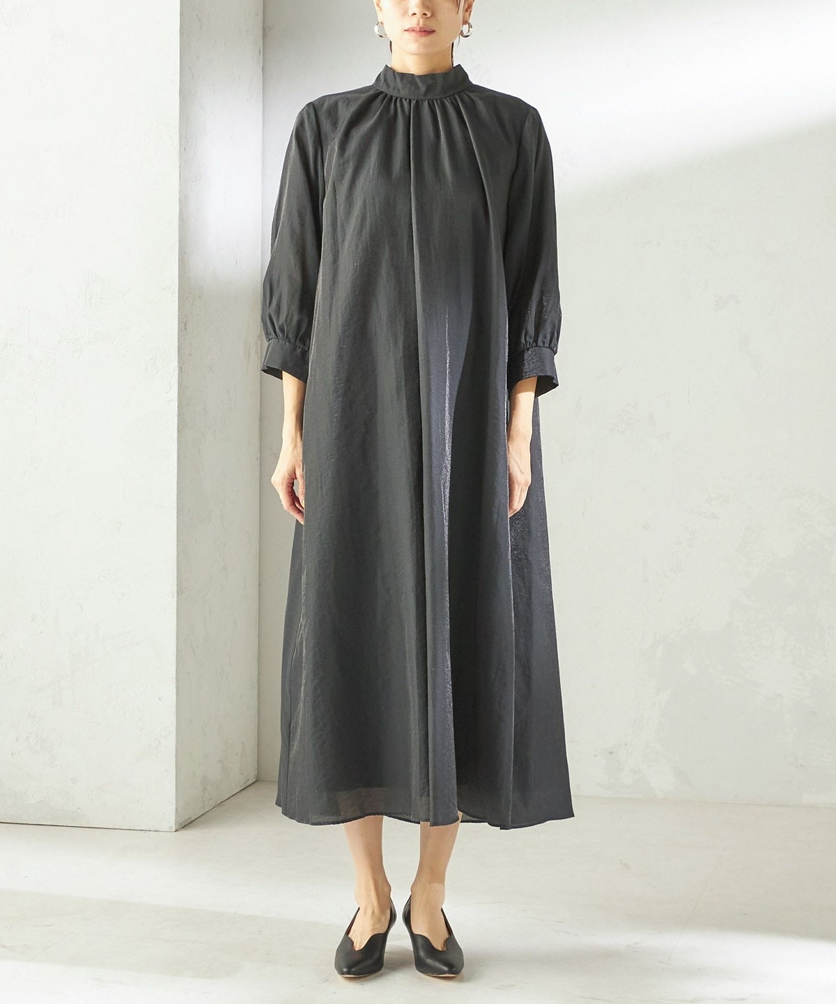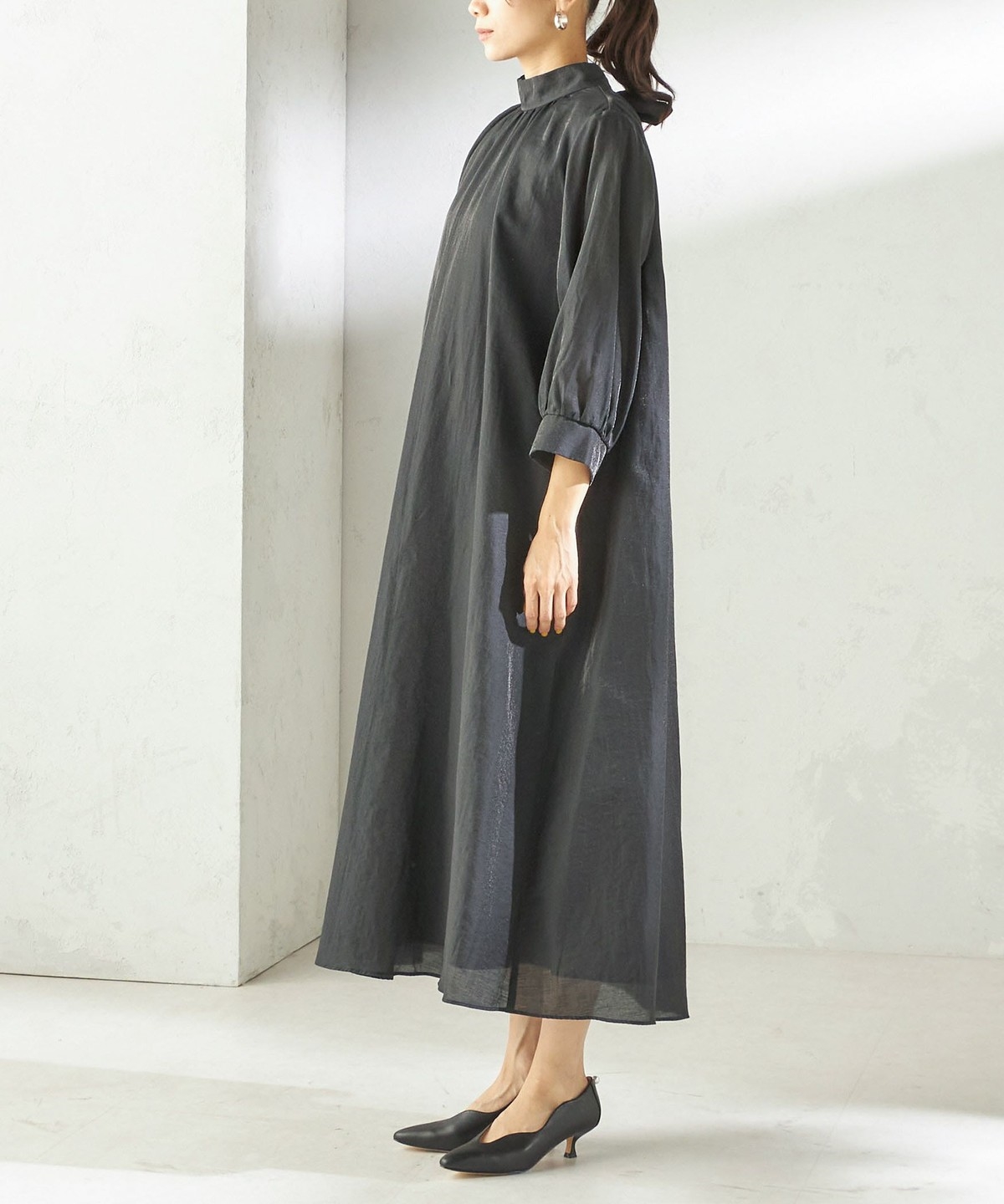 光の当たり方によって見え方が変わる、シャンブレー生地を使用した、上品な光沢感のあるドレス。