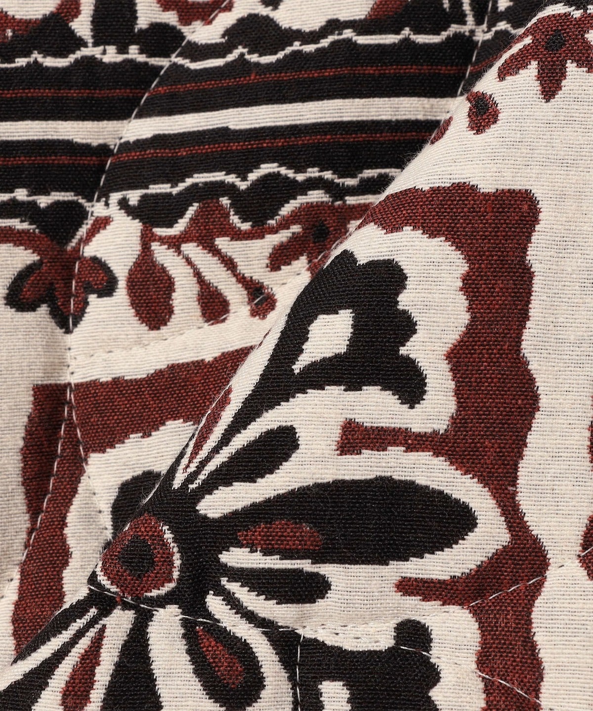 今シーズンのインスピレーションソースのひとつであるタイル柄のようなジャガード生地をフランスの生地サプライヤーからピックしリーフキルトパターンを施しました。