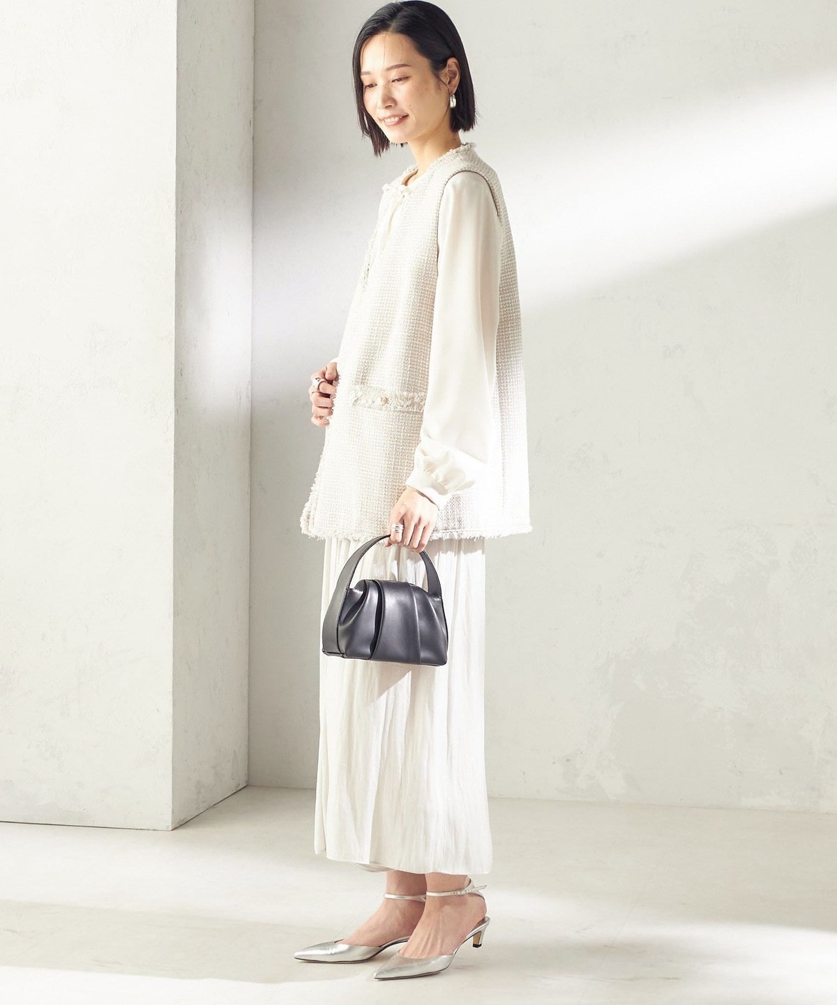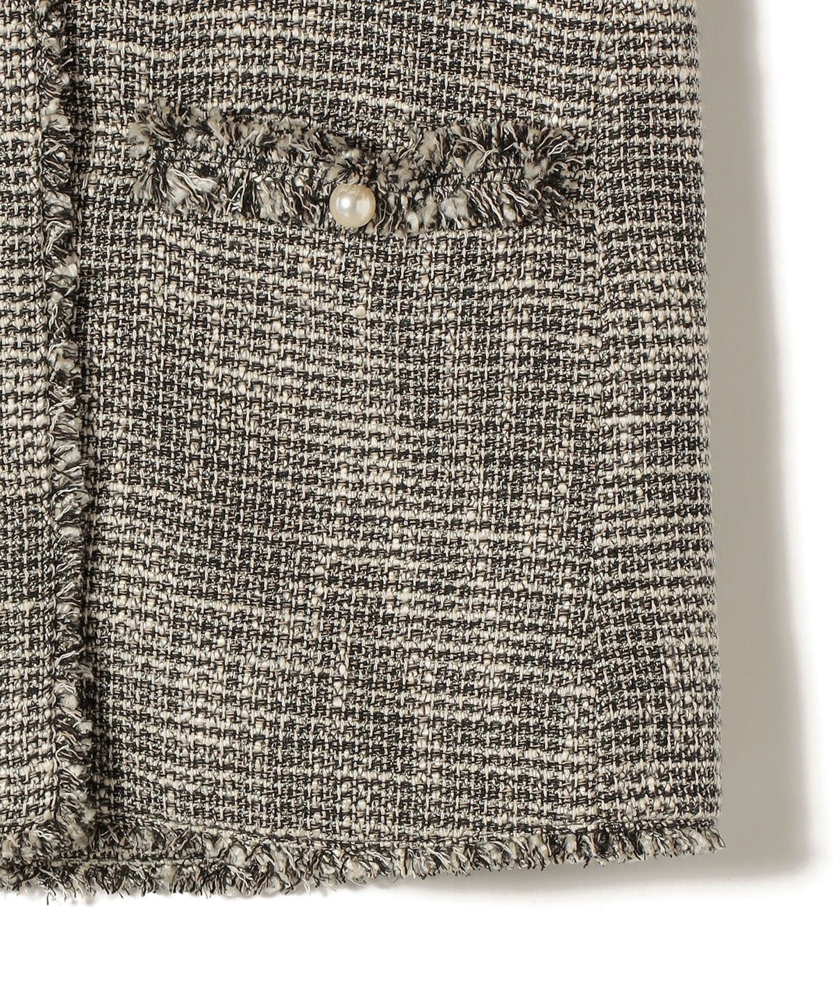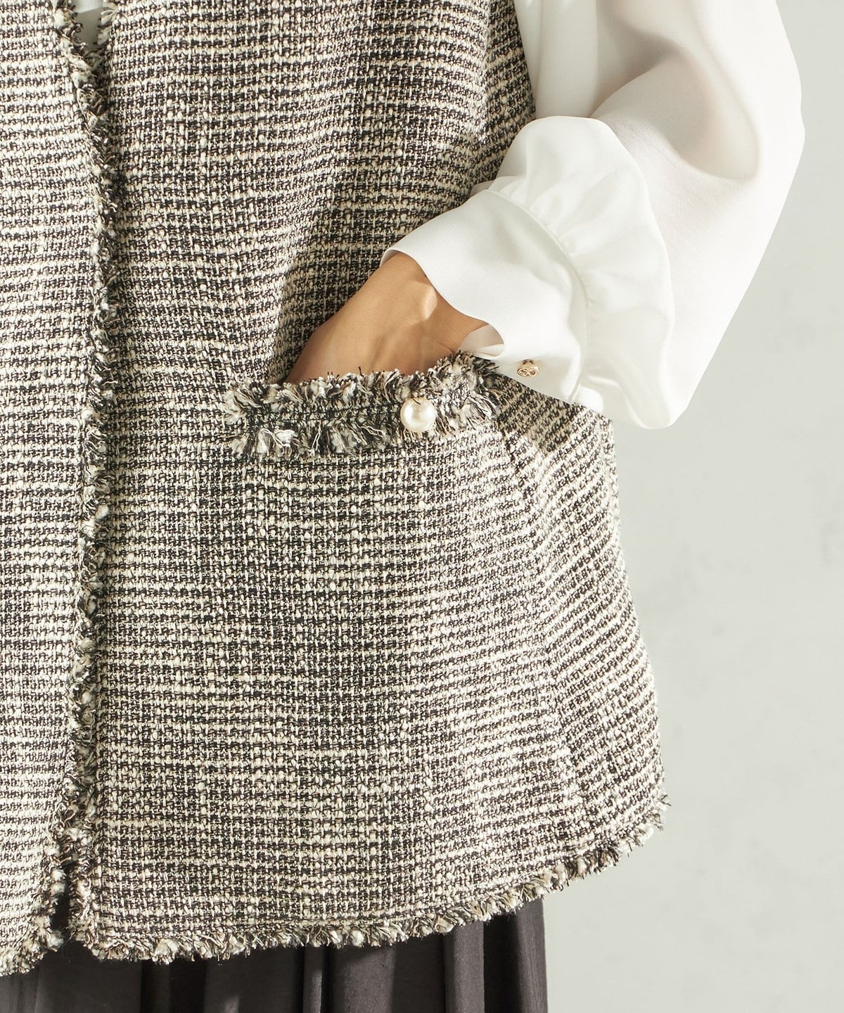 ポケットには存在感のあるパールモチーフボタンを施し、アクセサリーいらずで華やかさをプラスします。