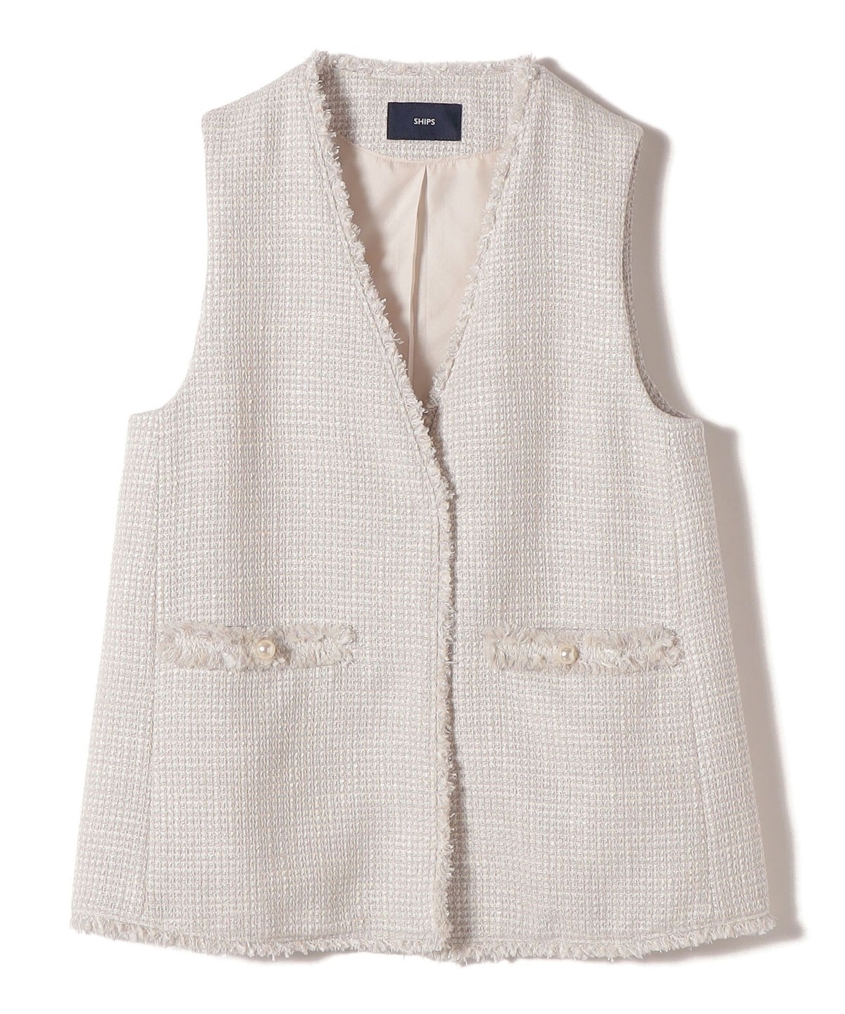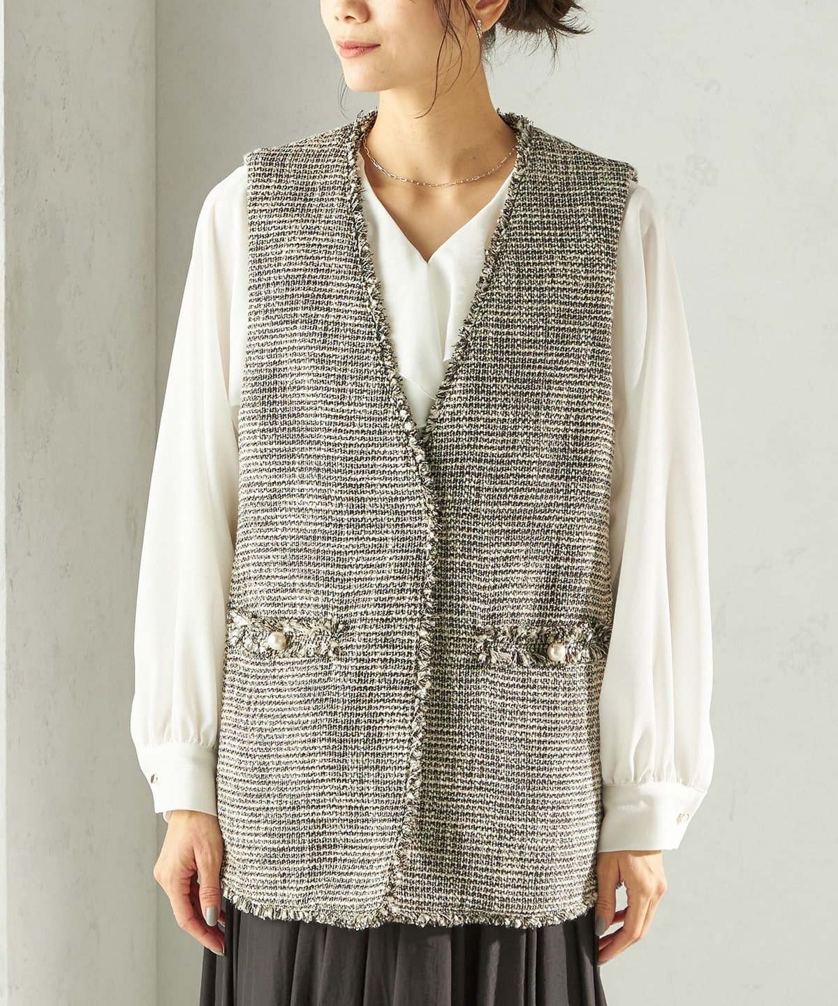 深めのVあきがポイントのツイードジレ。