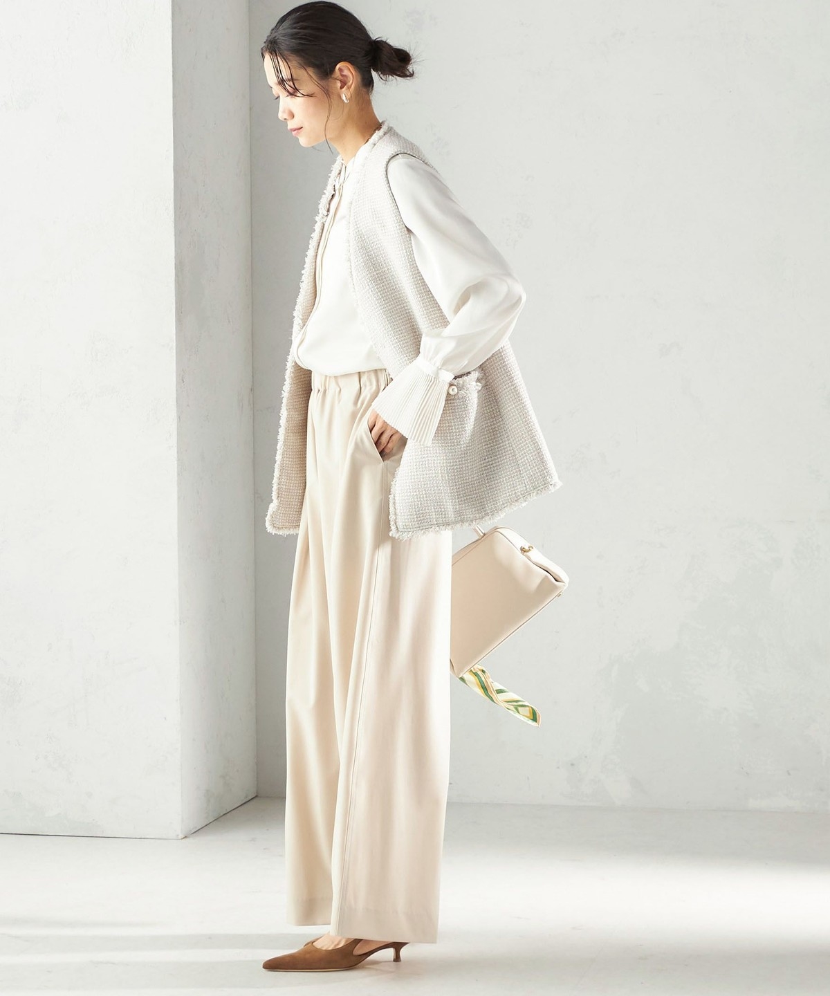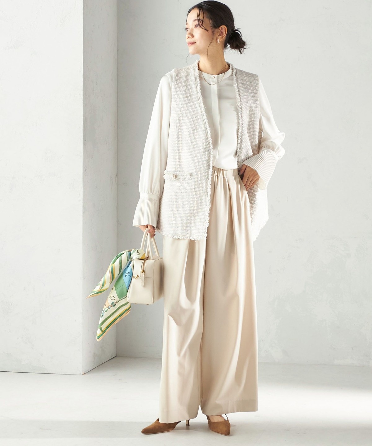 すっきりとしたシルエットで、テーパードパンツ・ワイドパンツ・スカートなど幅広いボトムと好相性。