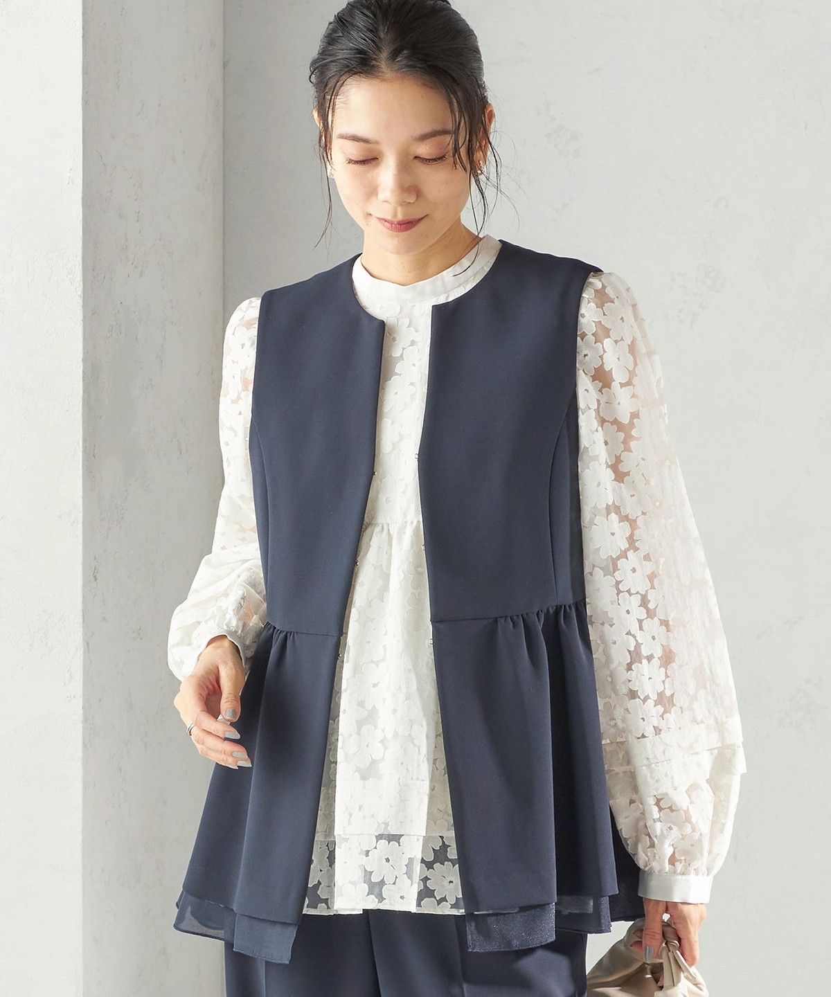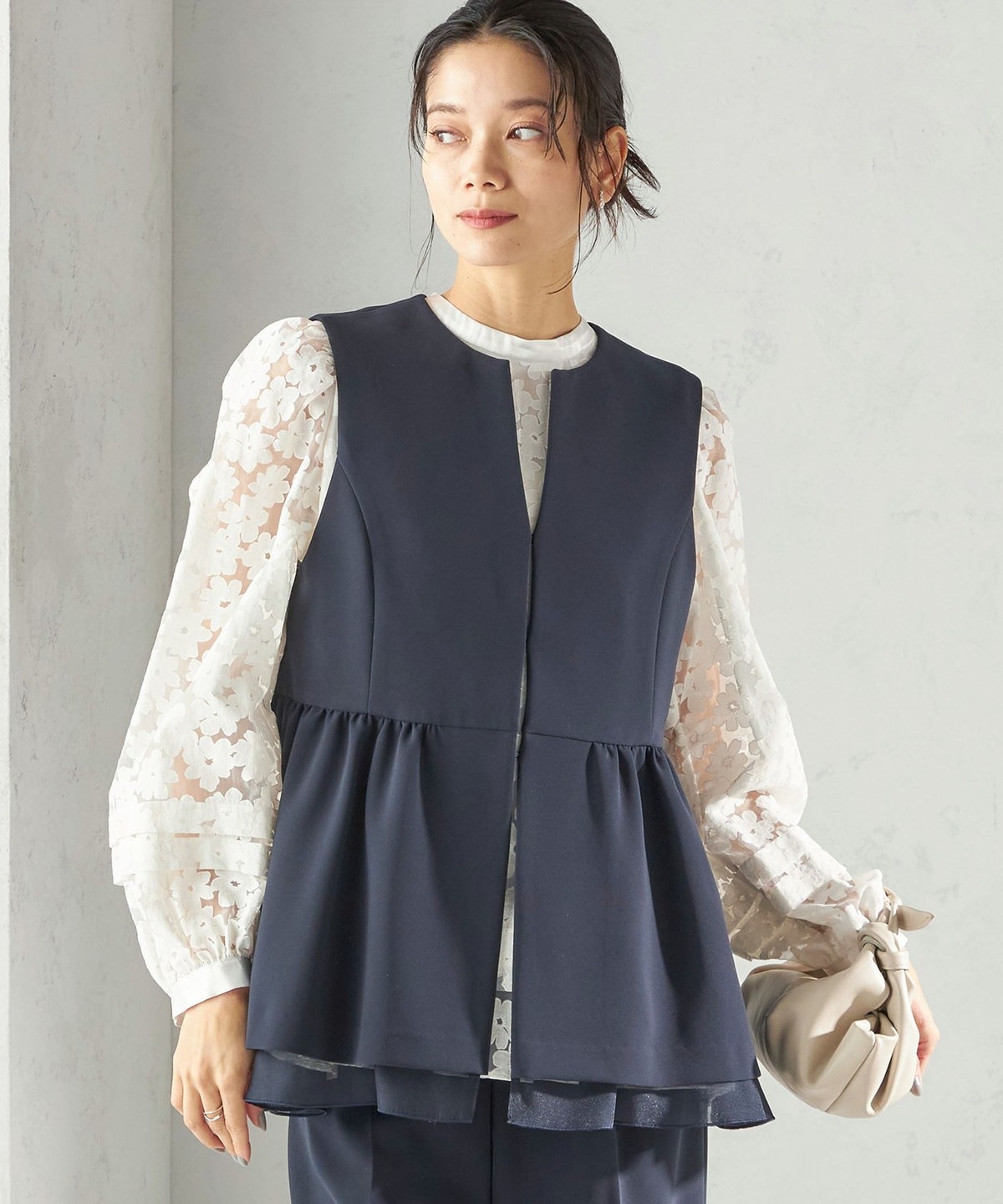 裾から重ねたオーガンジーが覗く、一枚で映えるデザインジレ。