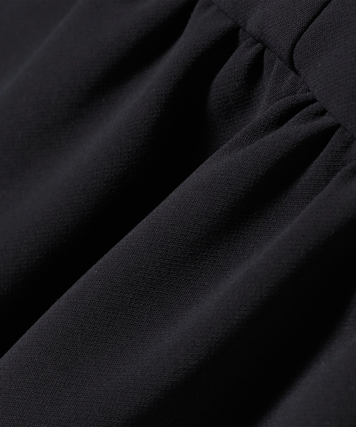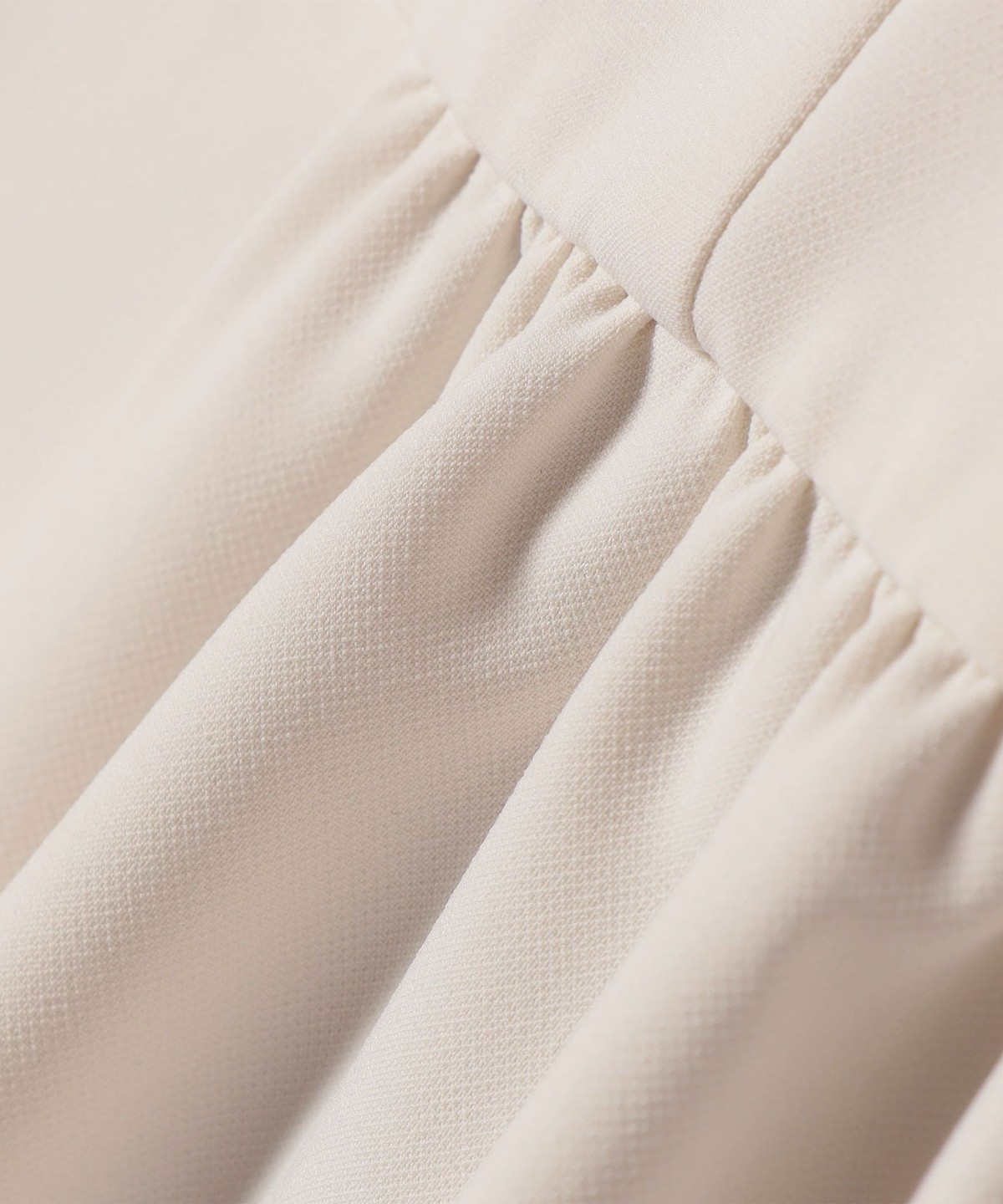 キーネックの首元や、ギャザーを入れたウエスト切り替えが上品な印象を演出します。