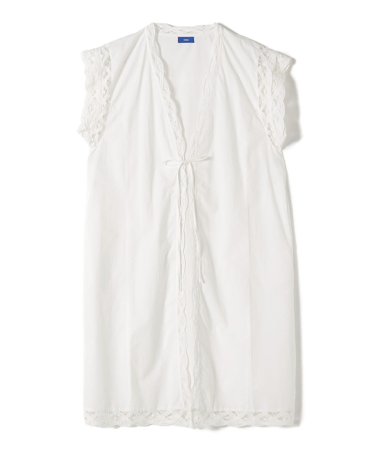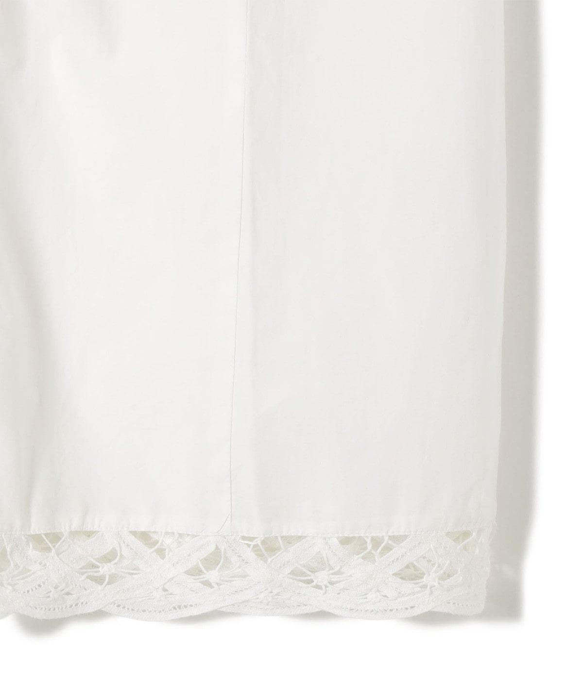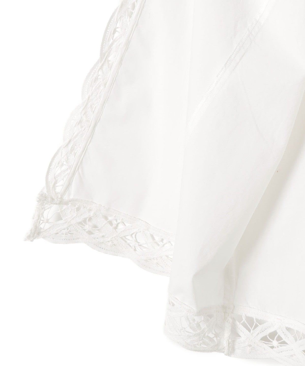 張りのあるポプリン生地に、アームから裾まで贅沢にバテンレースをあしらったロングジレ。