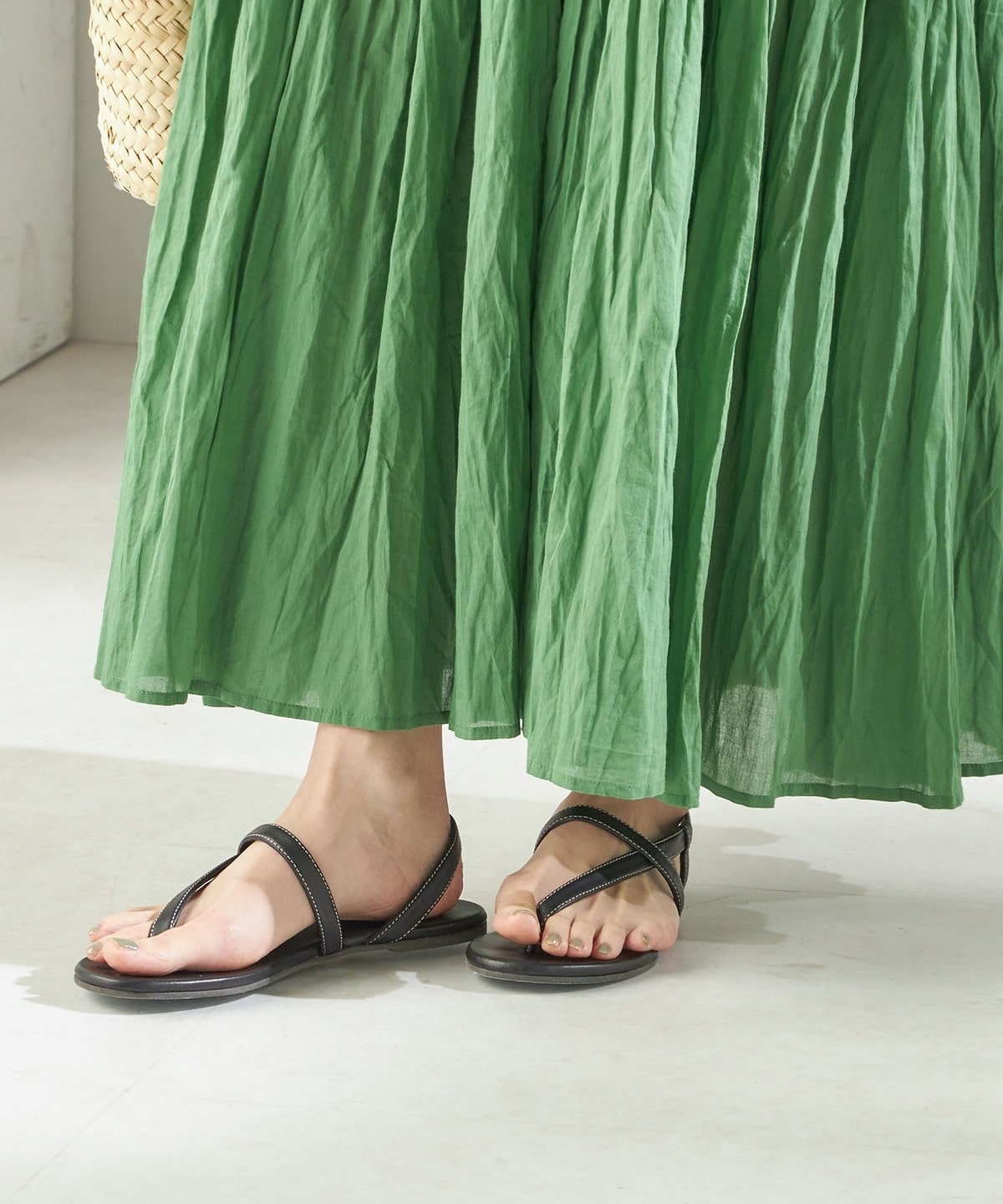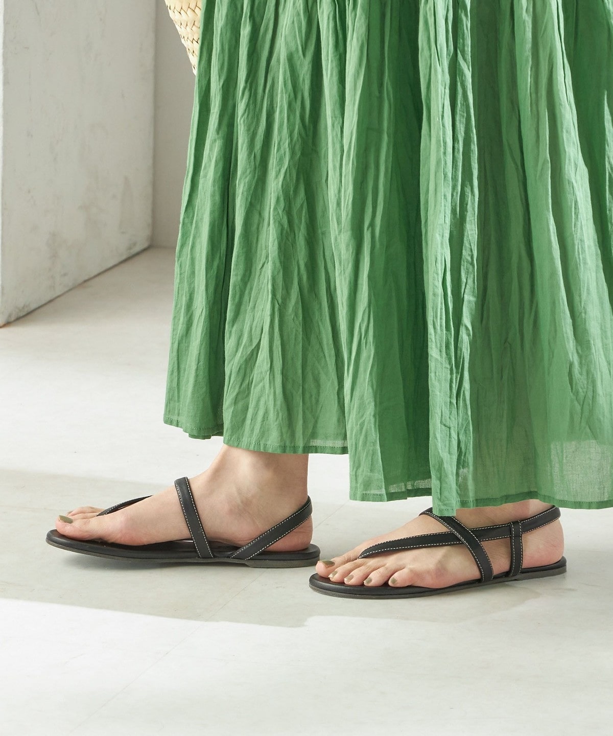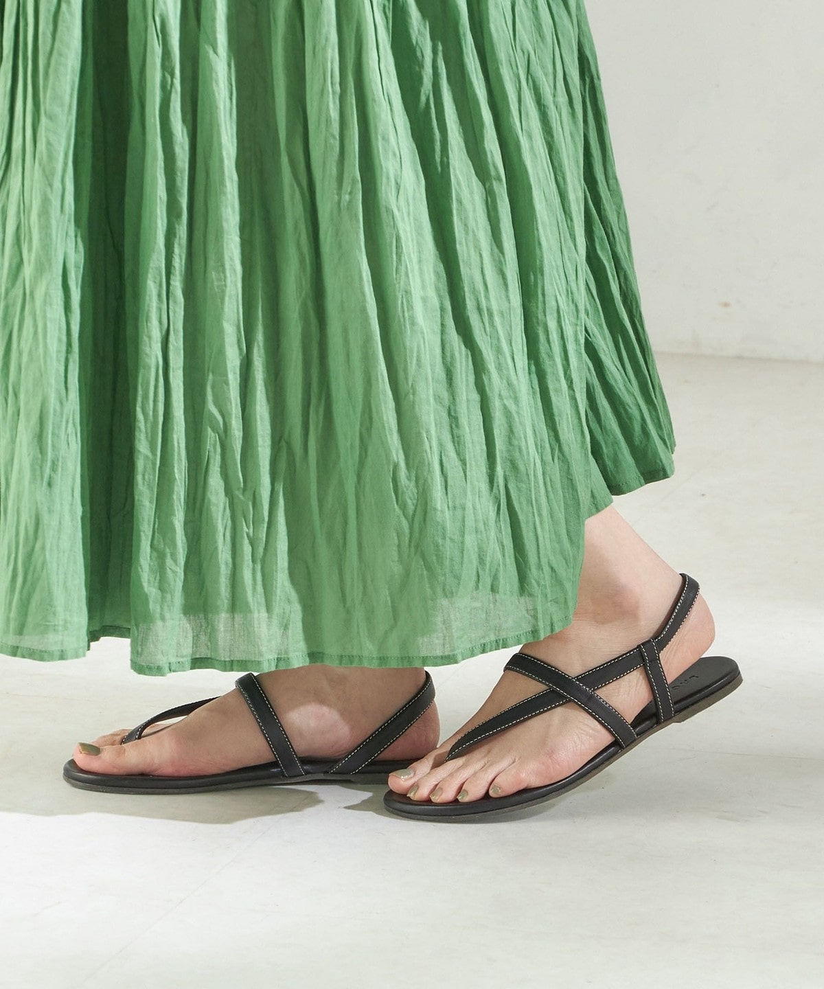 リラックス感のあるムードと上品さを兼ね備えた、レザー素材のフラットサンダル。