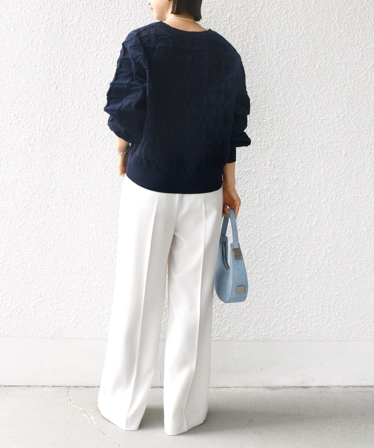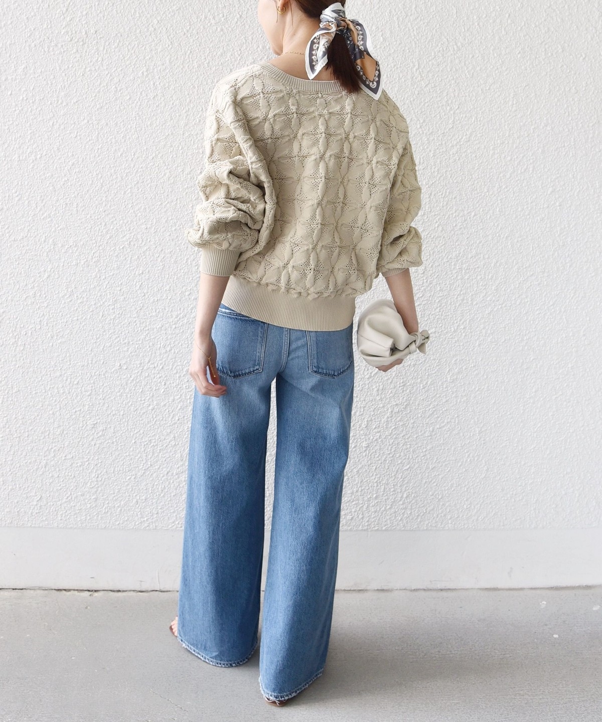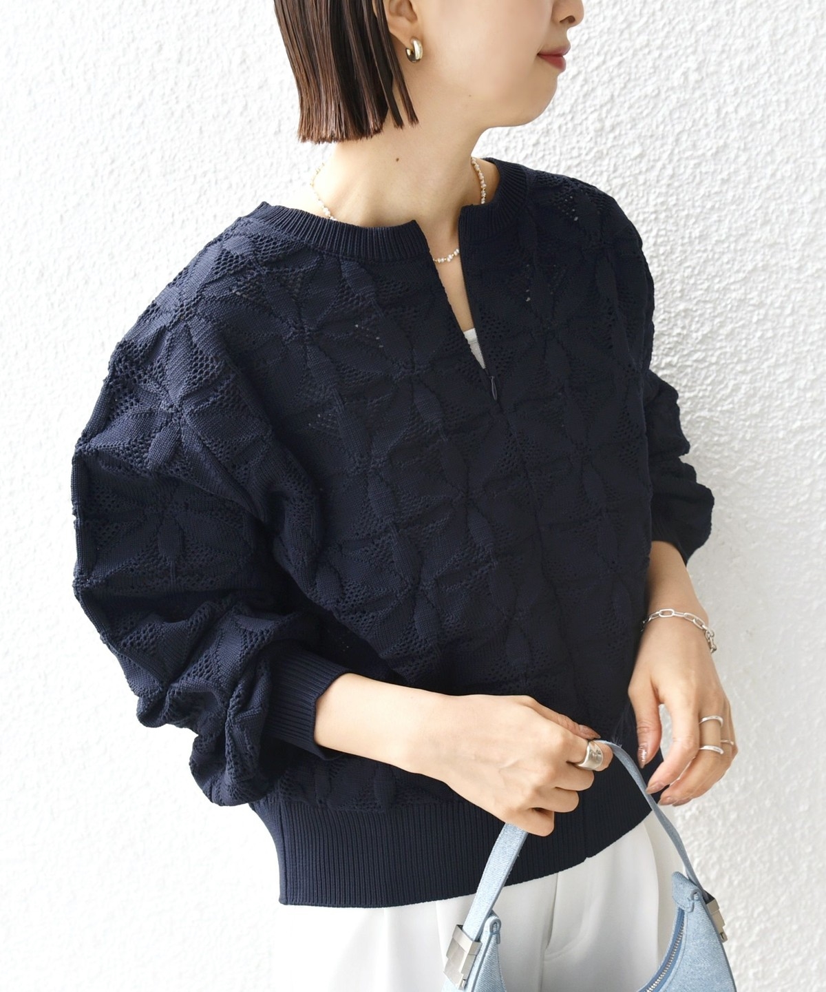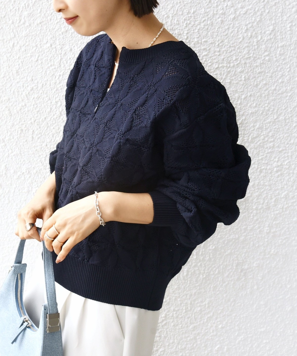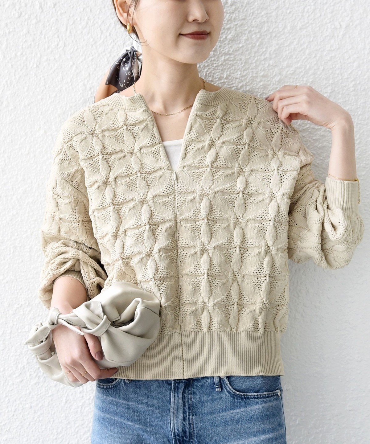 お花モチーフが春らしく、ニットならではの表面感で大人っぽい雰囲気に仕上がっています。