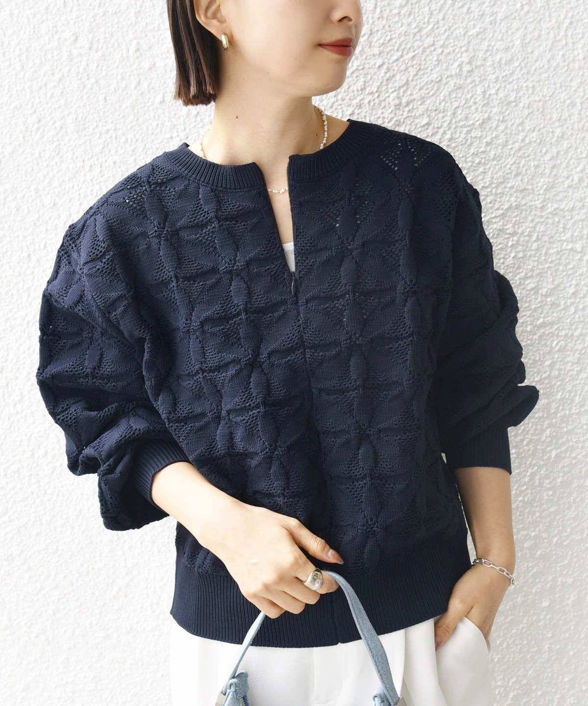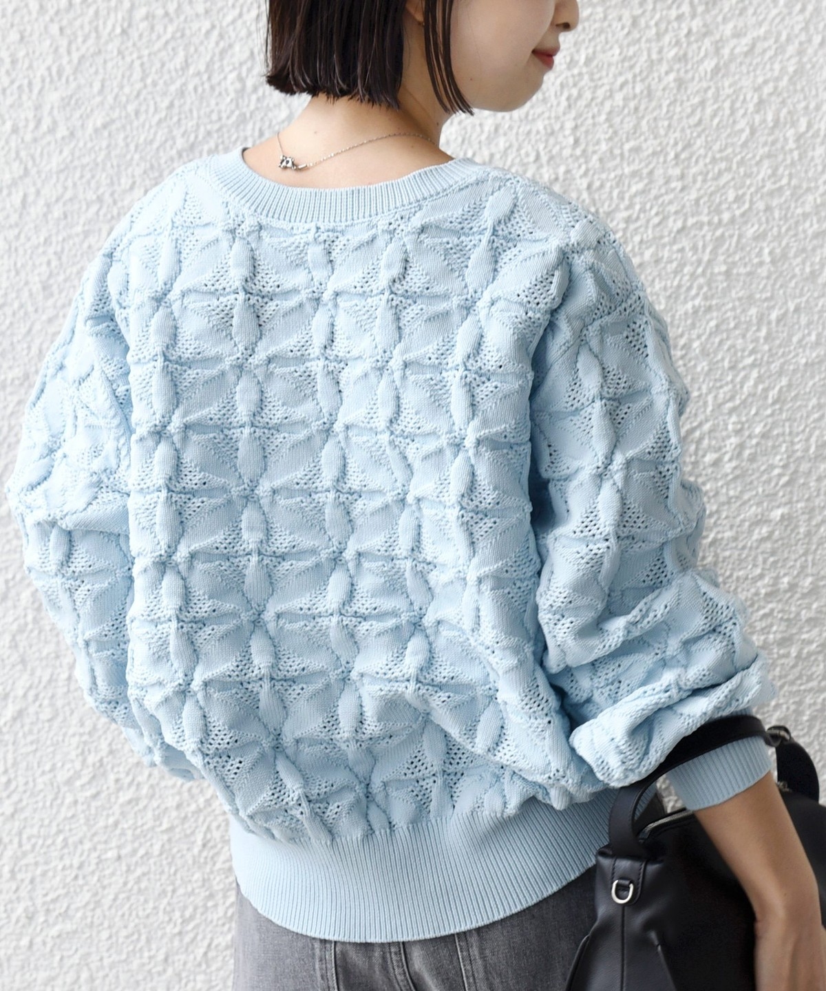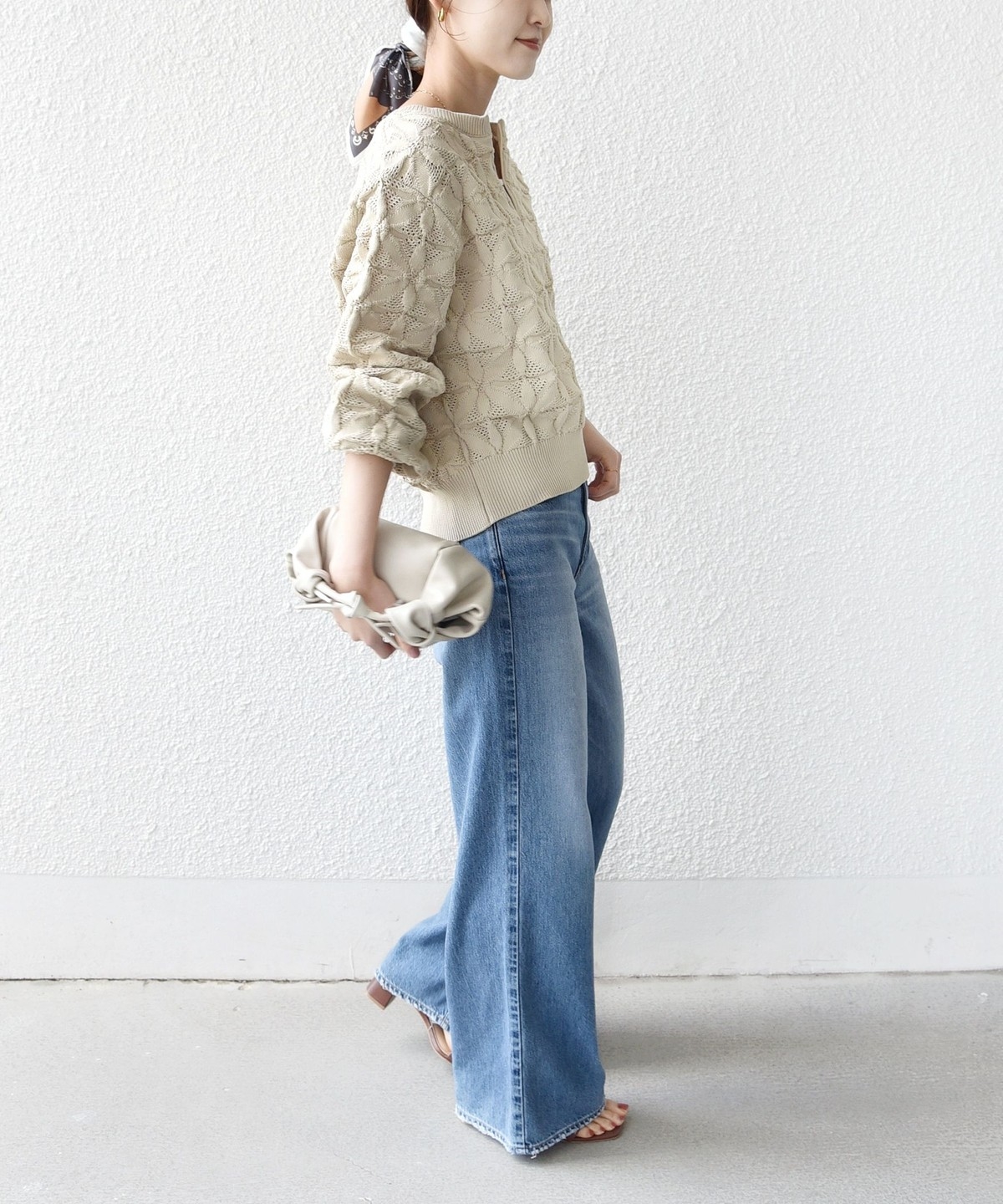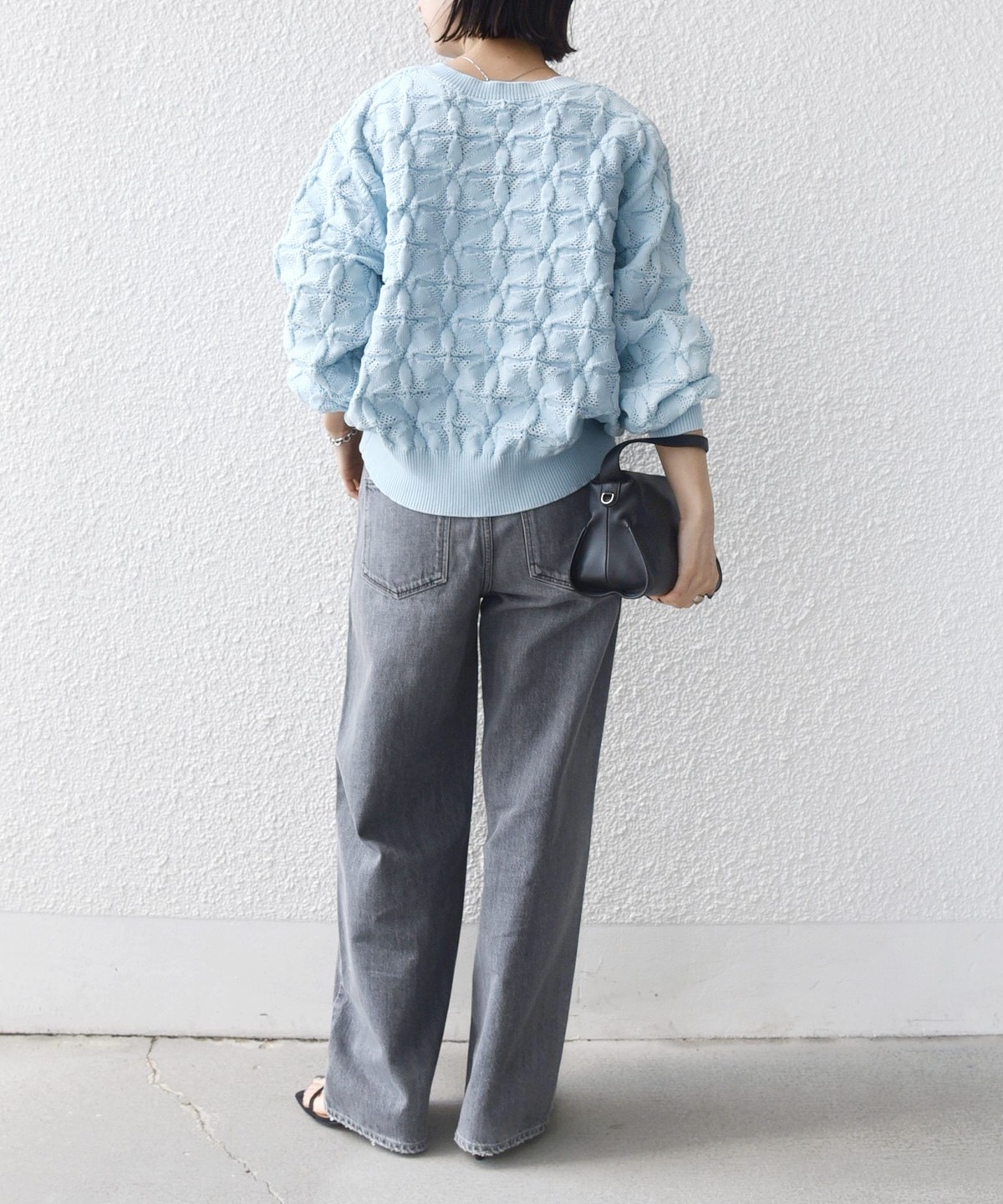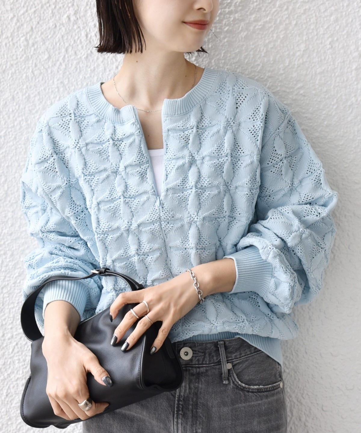 お花モチーフが春らしく、ニットならではの表面感で大人っぽい雰囲気に仕上がっています。