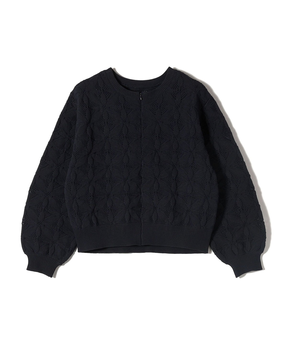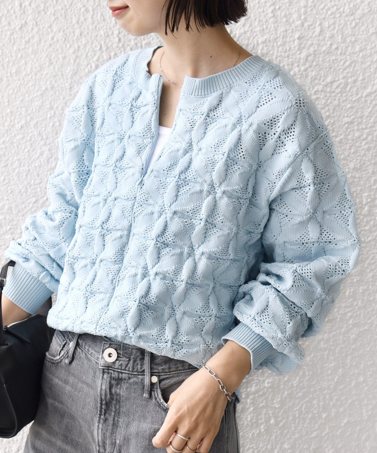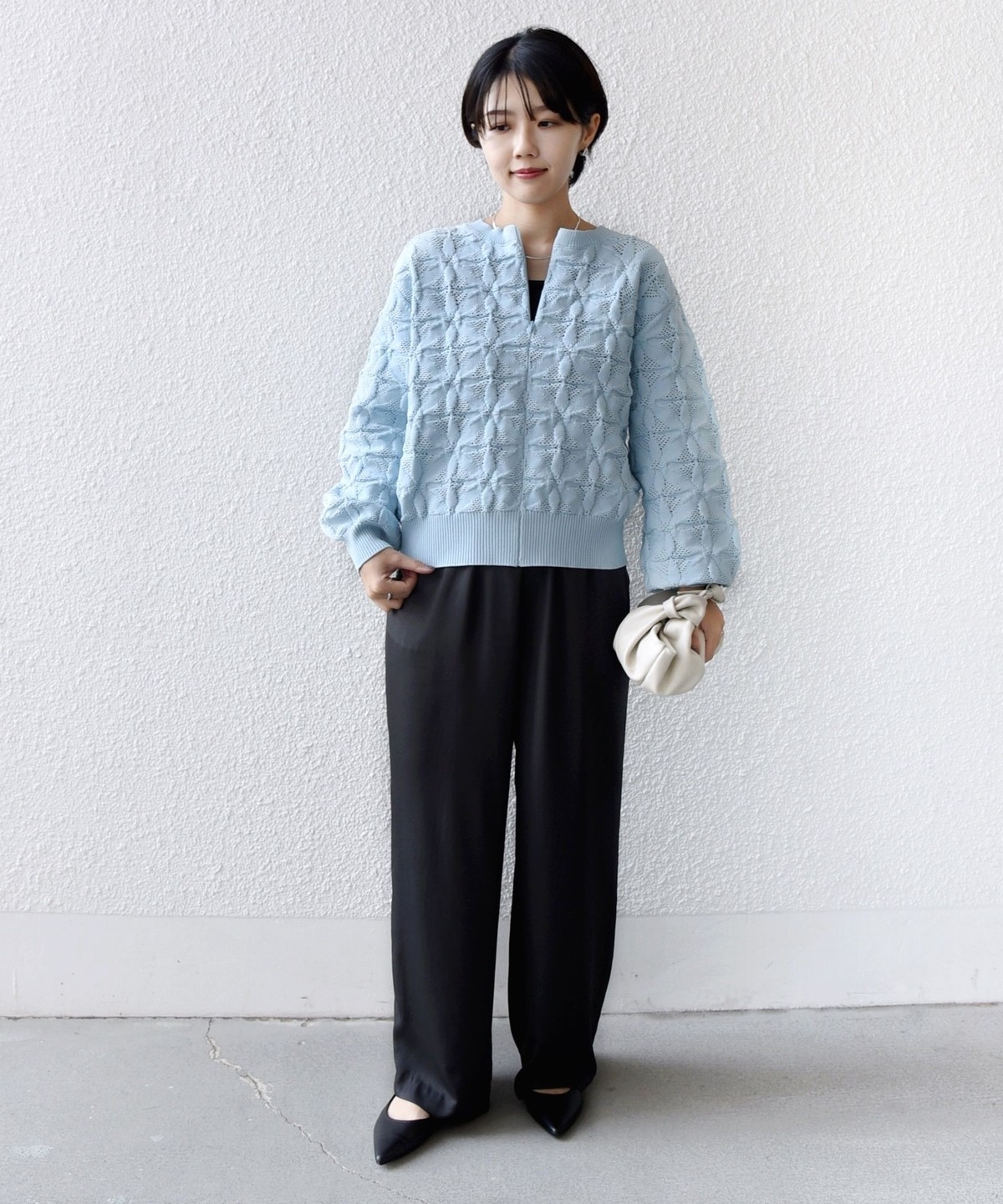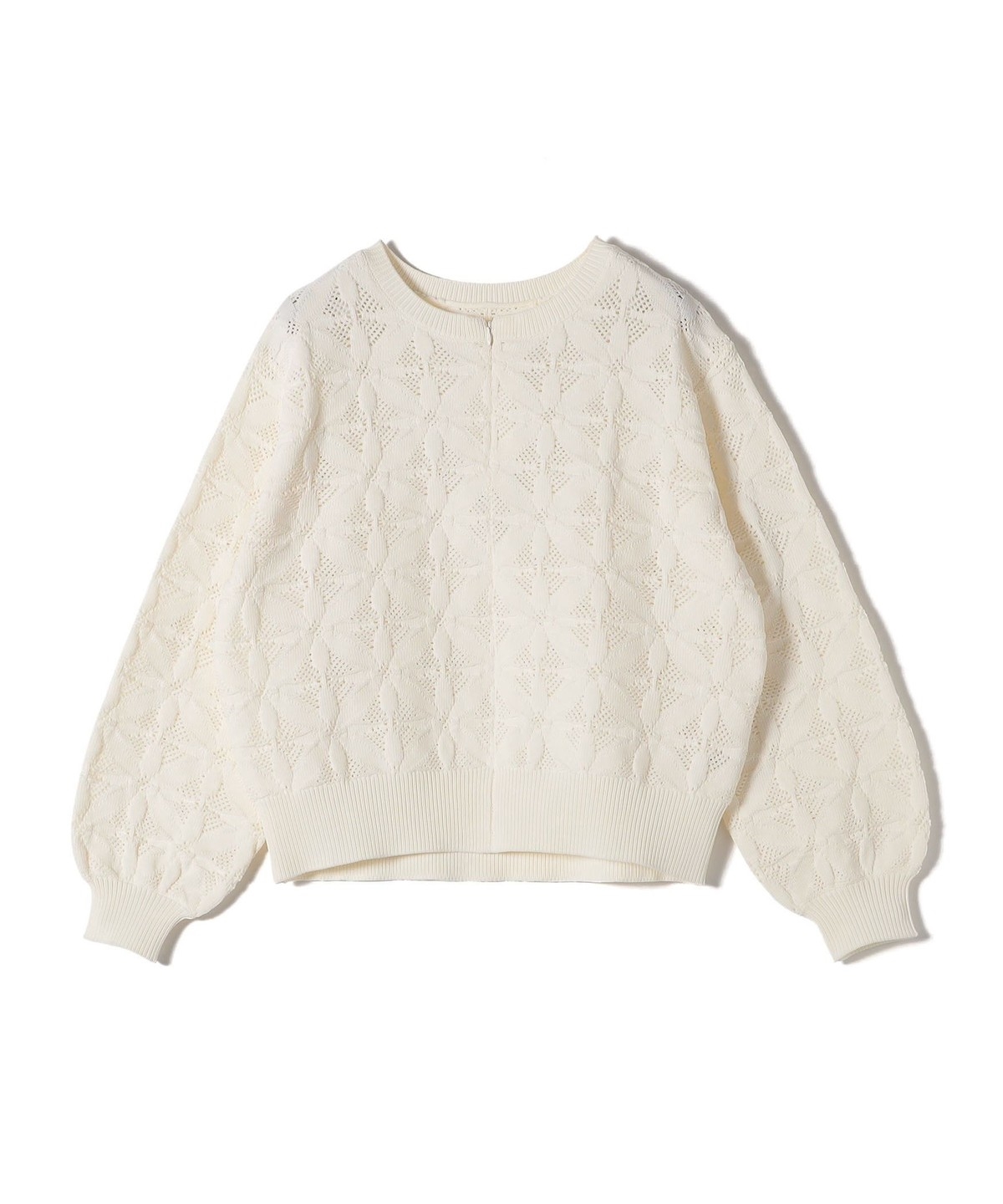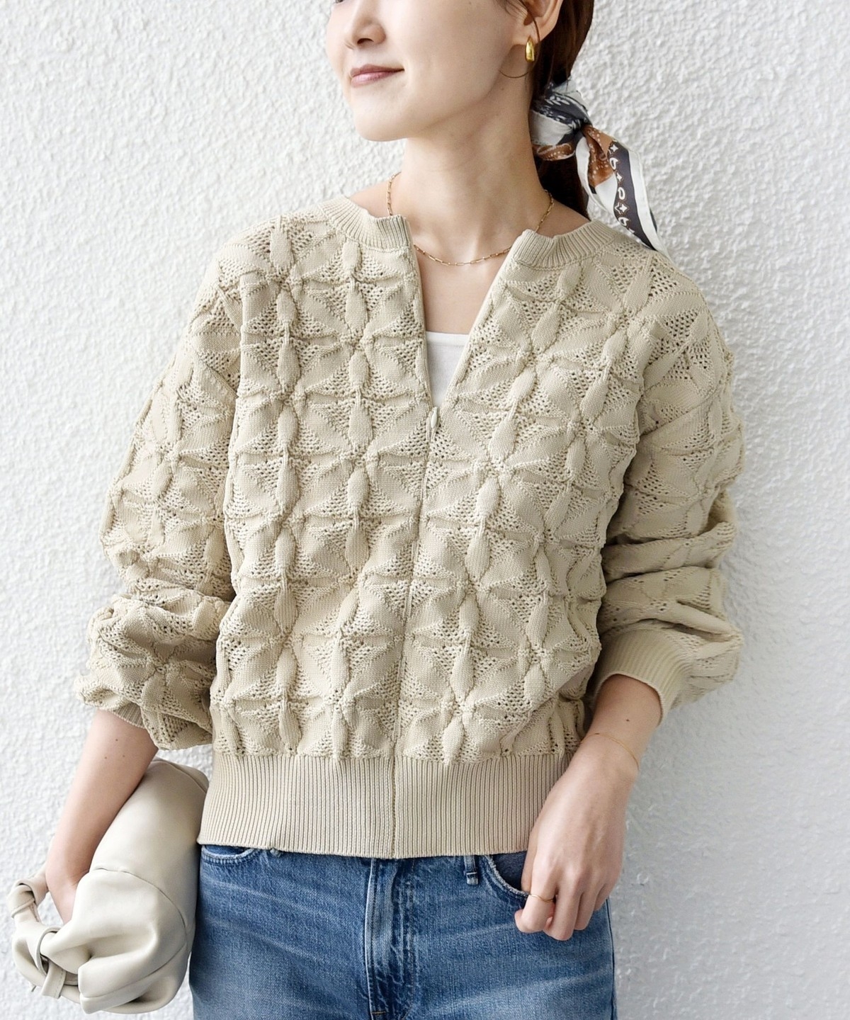 お花モチーフが春らしく、ニットならではの表面感で大人っぽい雰囲気に仕上がっています。
