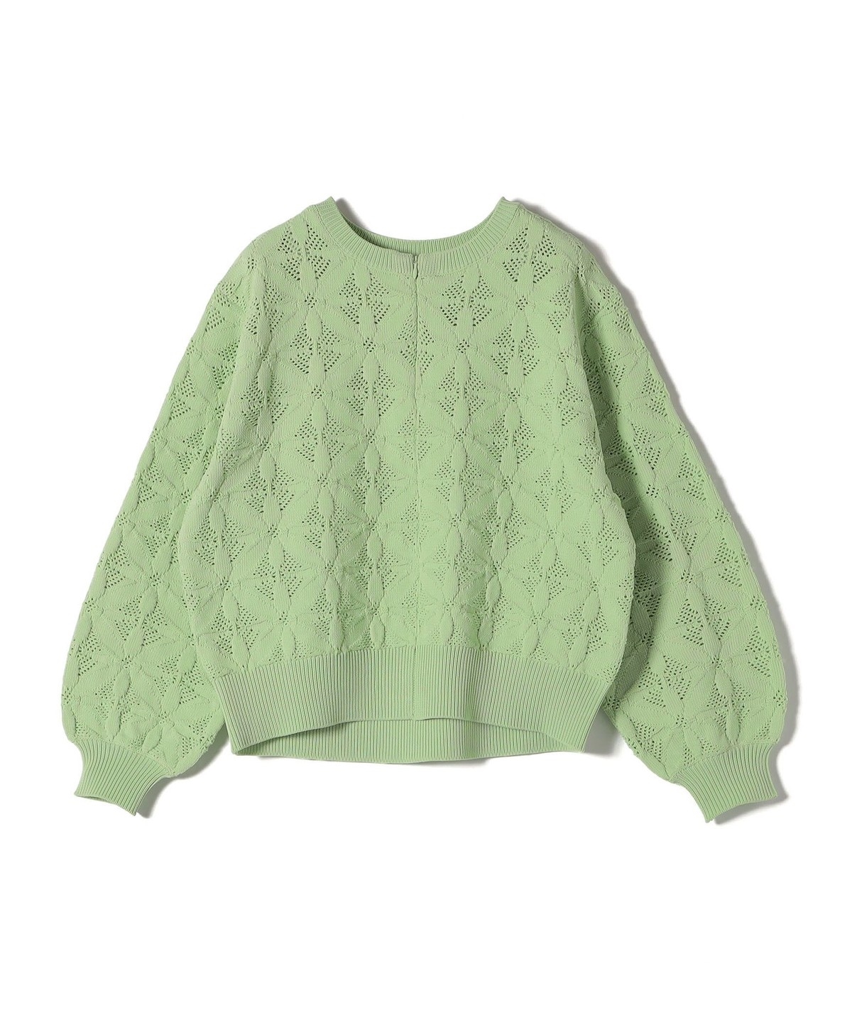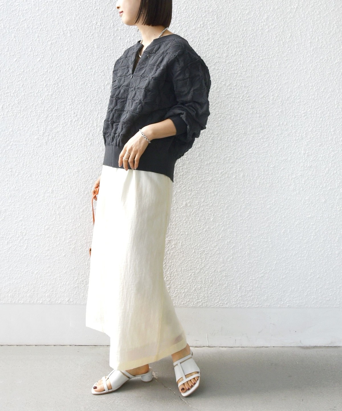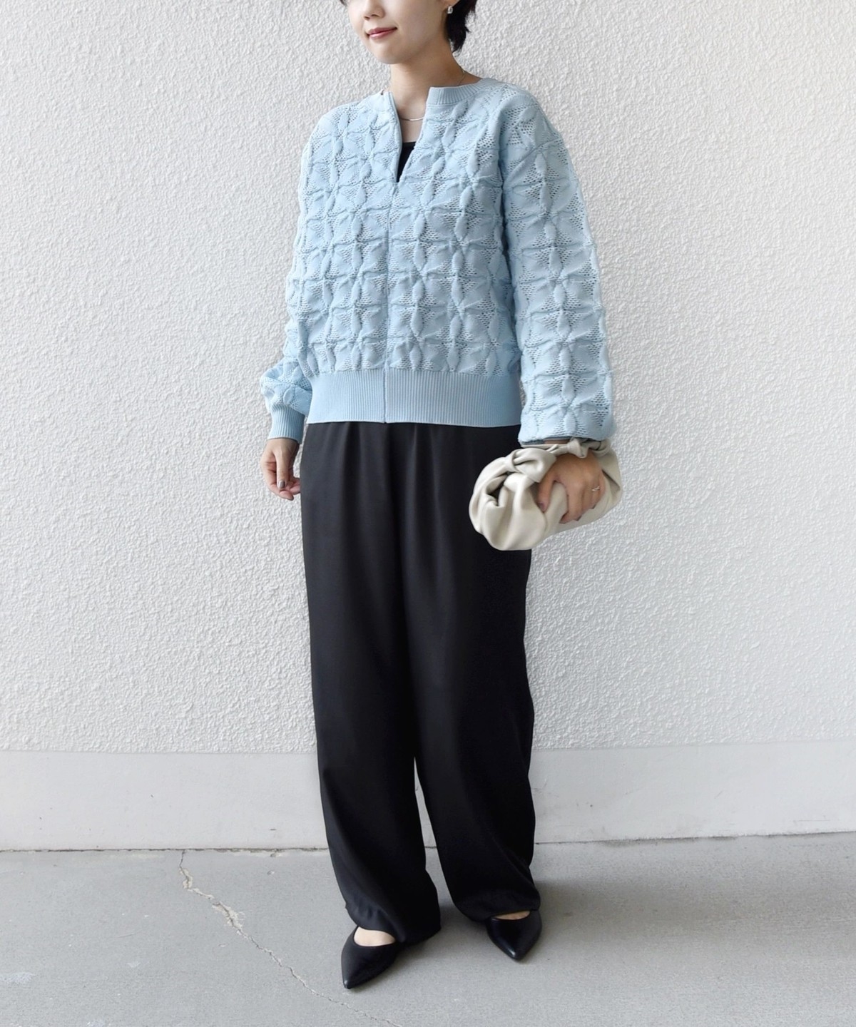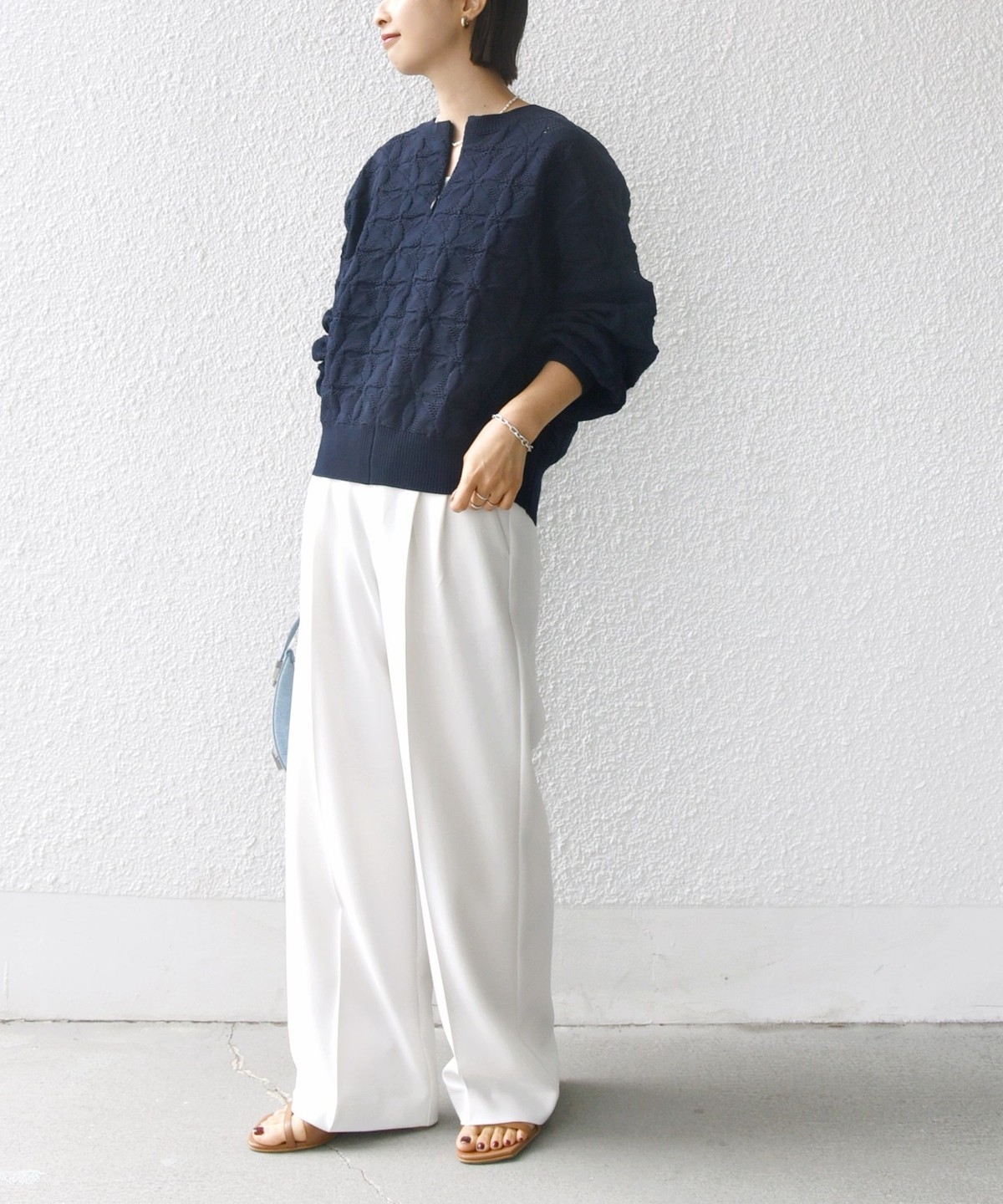 お花モチーフが春らしく、ニットならではの表面感で大人っぽい雰囲気に仕上がっています。